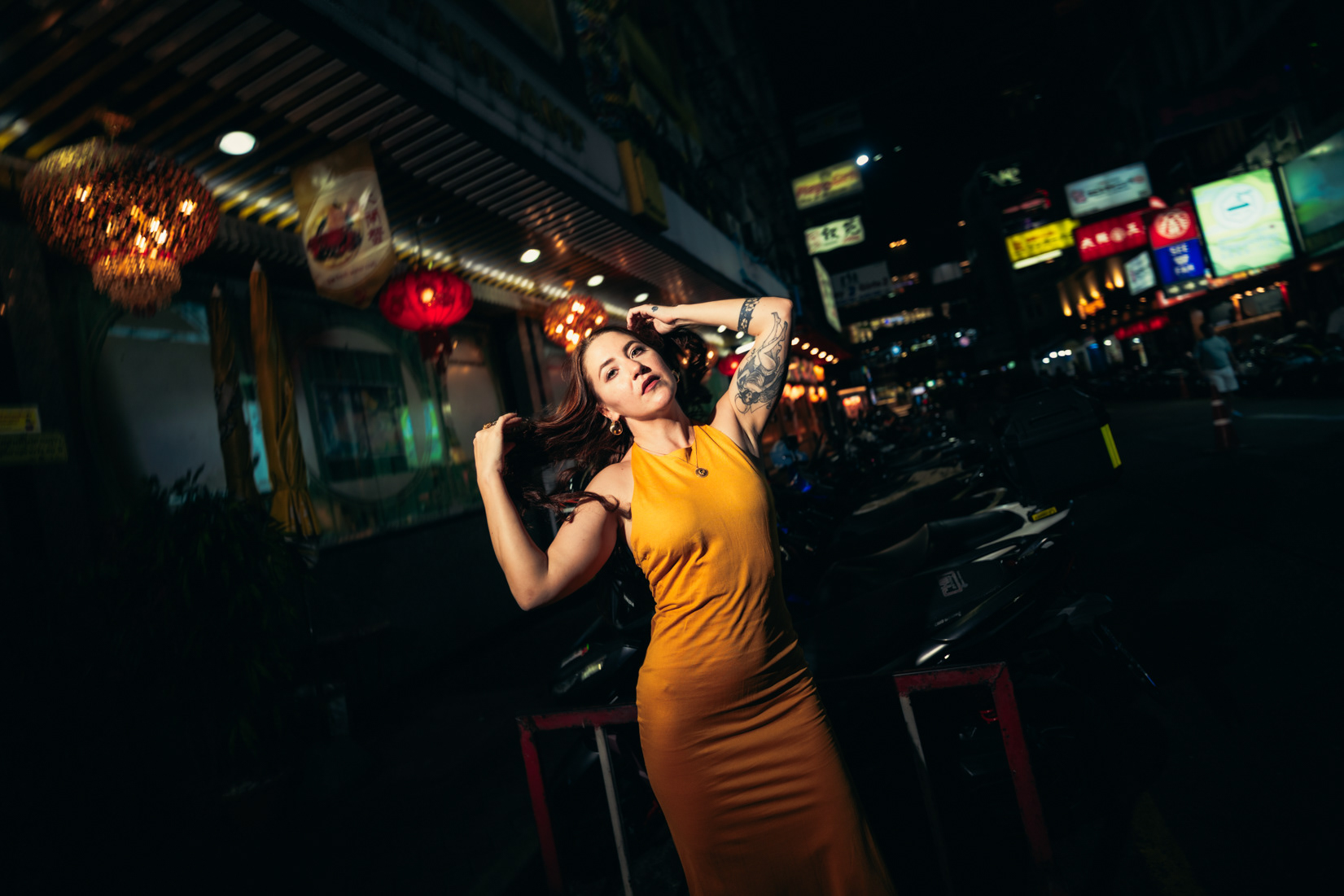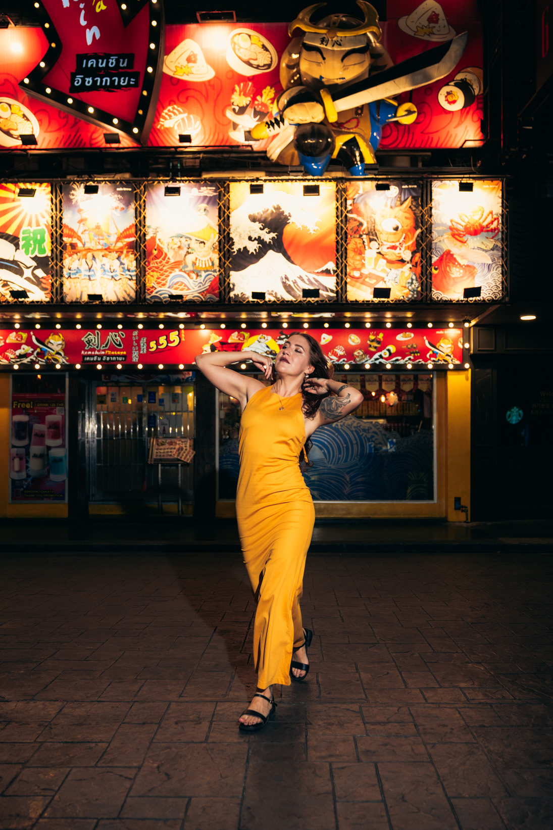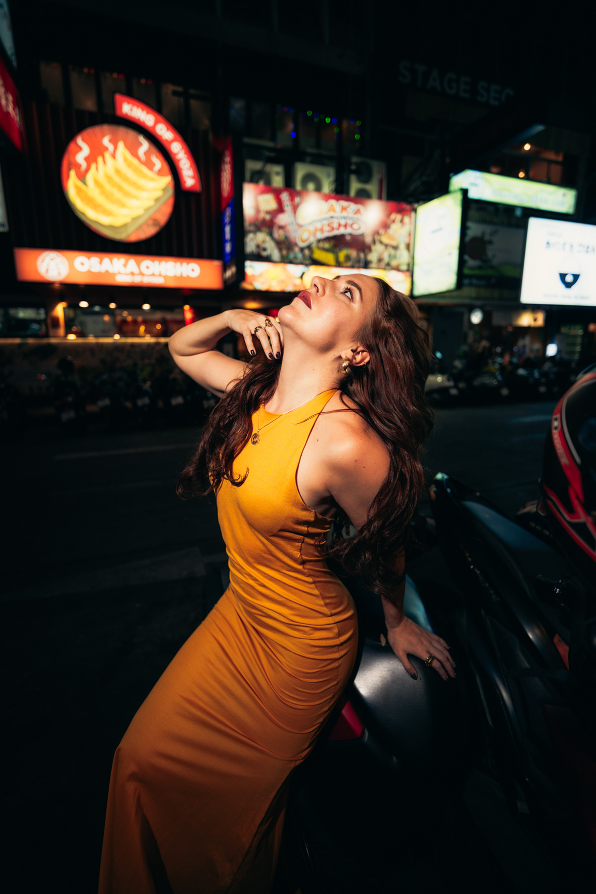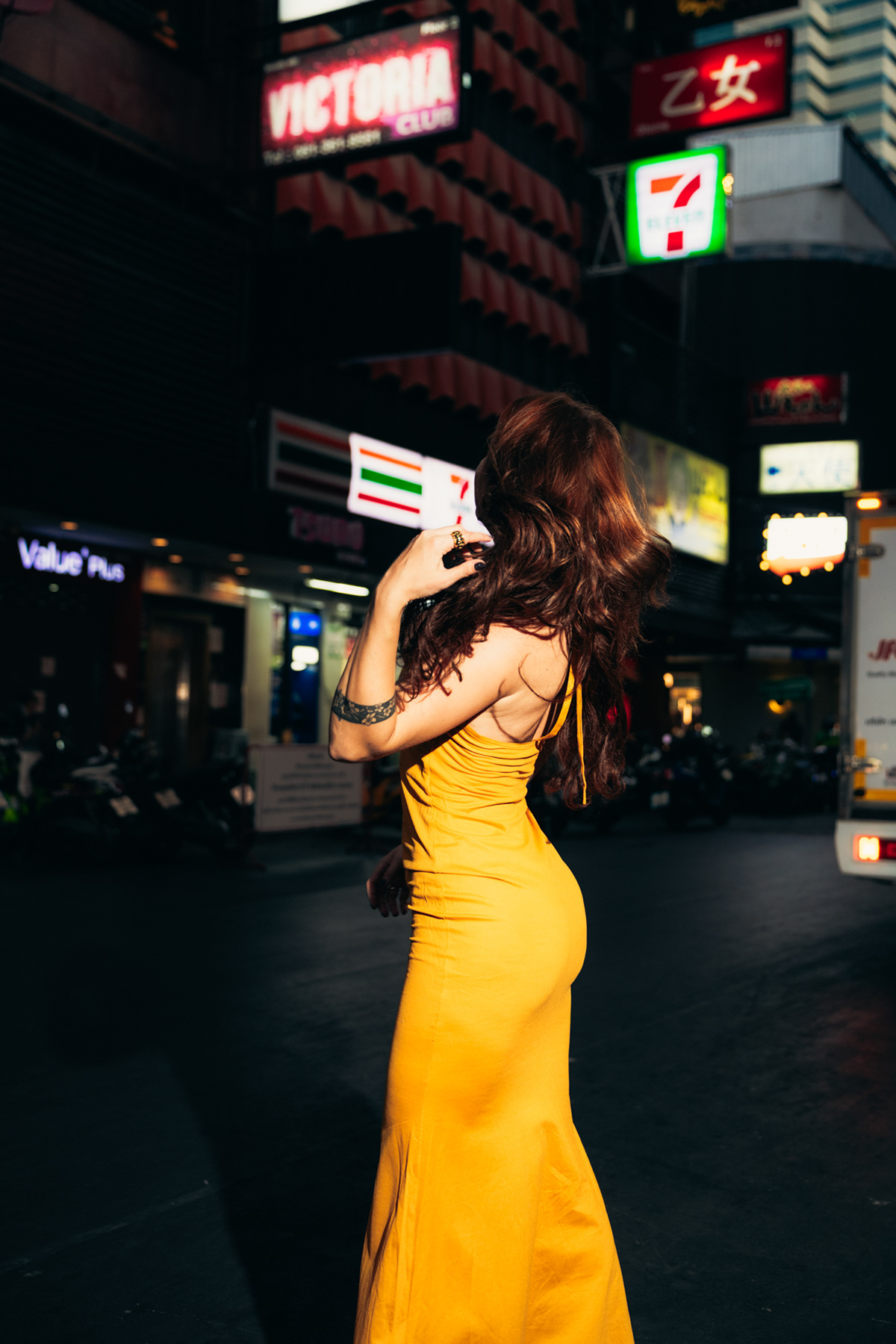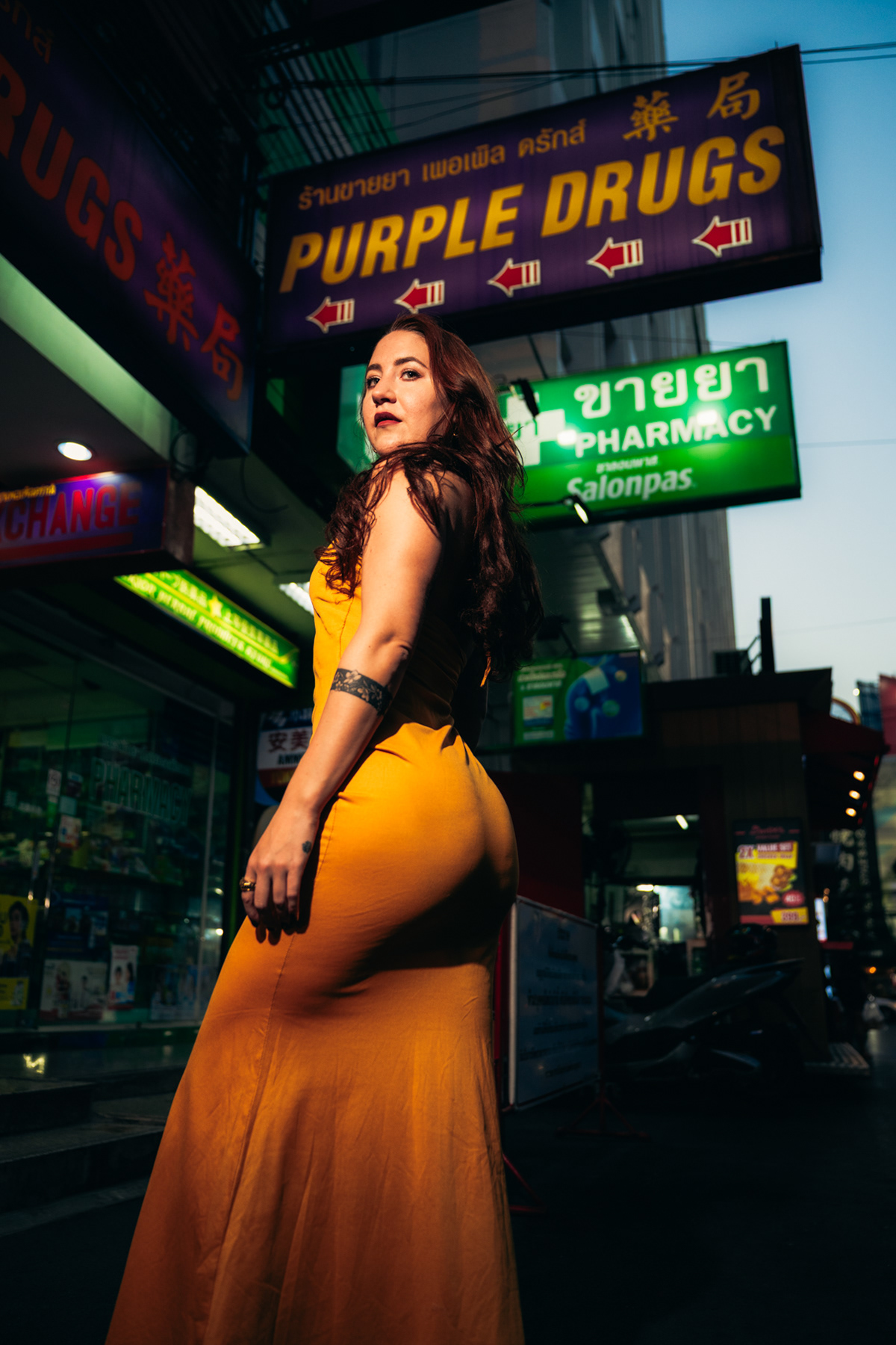 Neon & Silk: Cinematic Evening Wear Portraits in Bangkok This series brings high-fashion glamour to the streets of Bangkok after dark. The concept focuses on the contrast between elegance and urban chaos. Featuring a striking yellow evening gown, the subject commands attention against a backdrop of neon signage, busy traffic, and street-side culture. Shot under the glow of iconic signs like "Purple Drugs" and traditional red lanterns, the lighting mixes ambient city colors with cinematic shadow play. The styling creates a bold visual statement, juxtaposing the fluidity of the dress with the gritty reality of the city—posing on red plastic stools and leaning against shop shutters. This portfolio demonstrates a bold, editorial approach to night fashion photography.