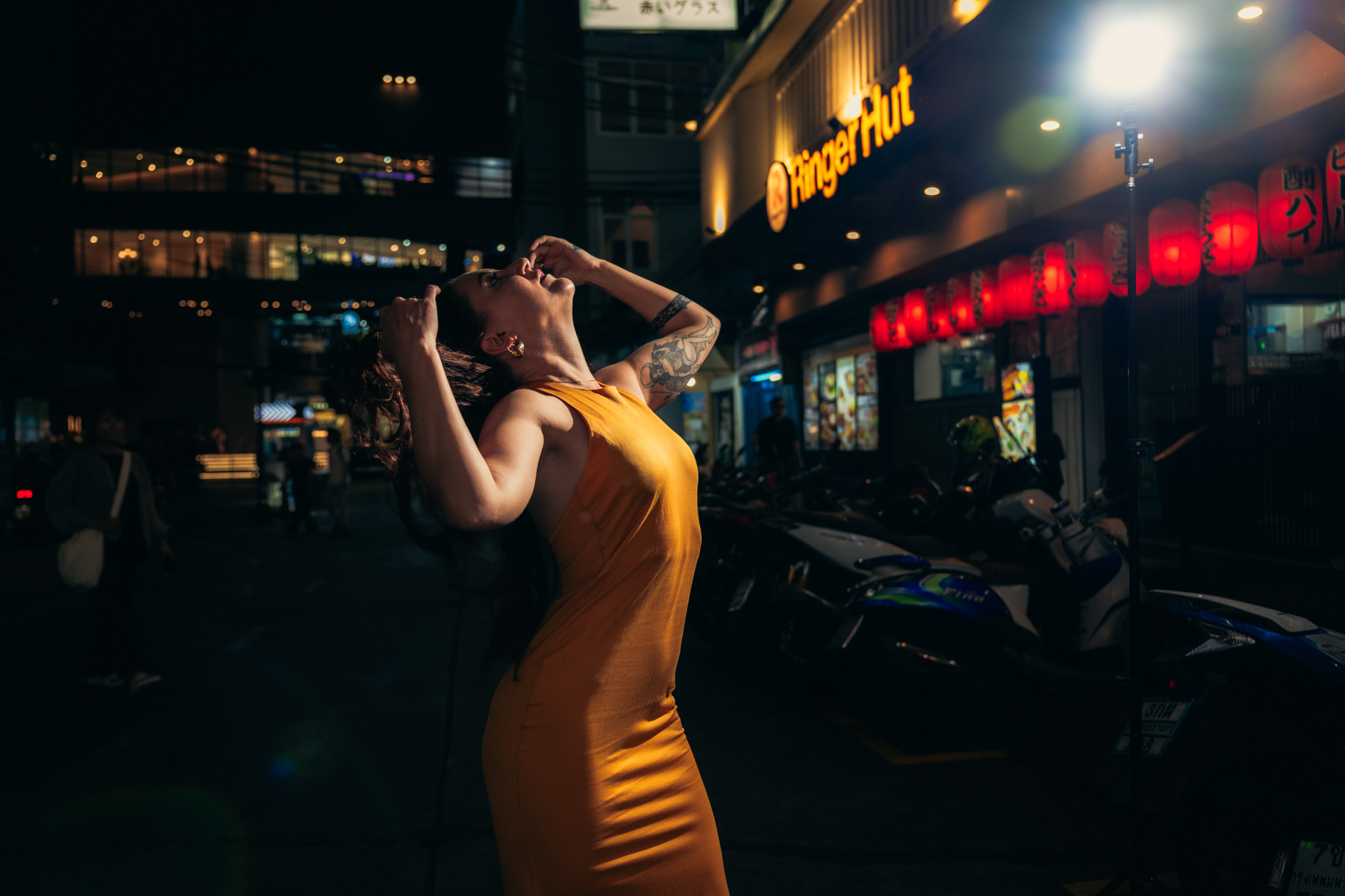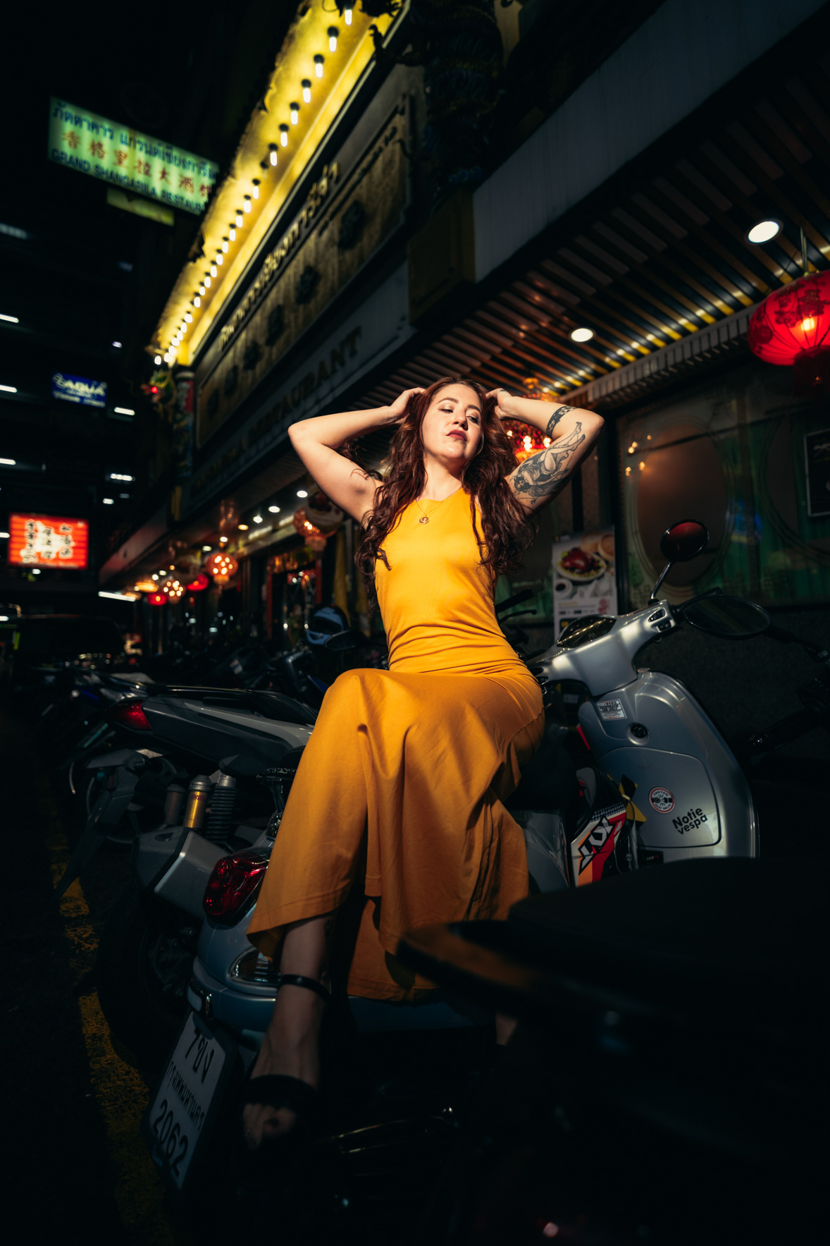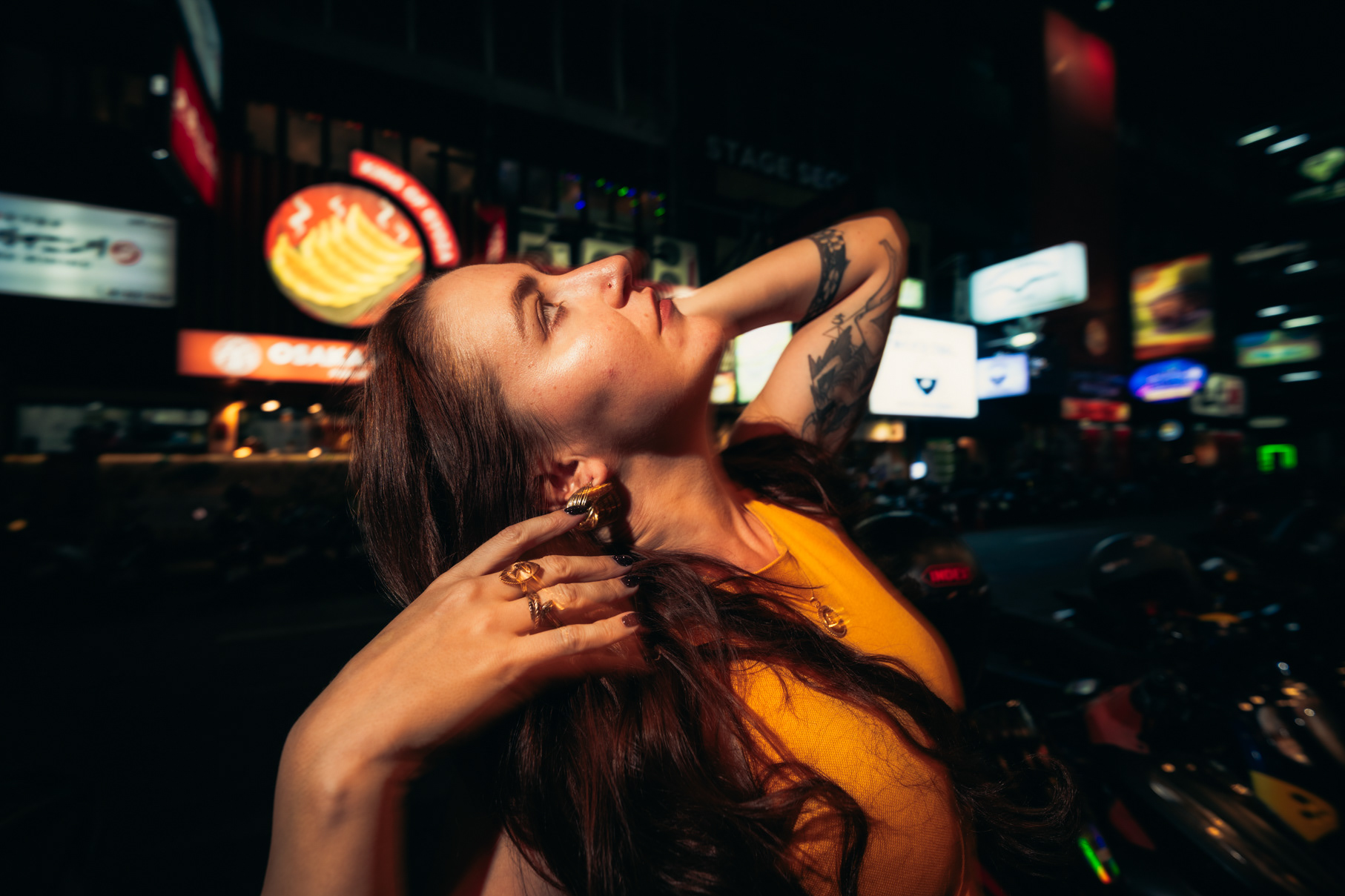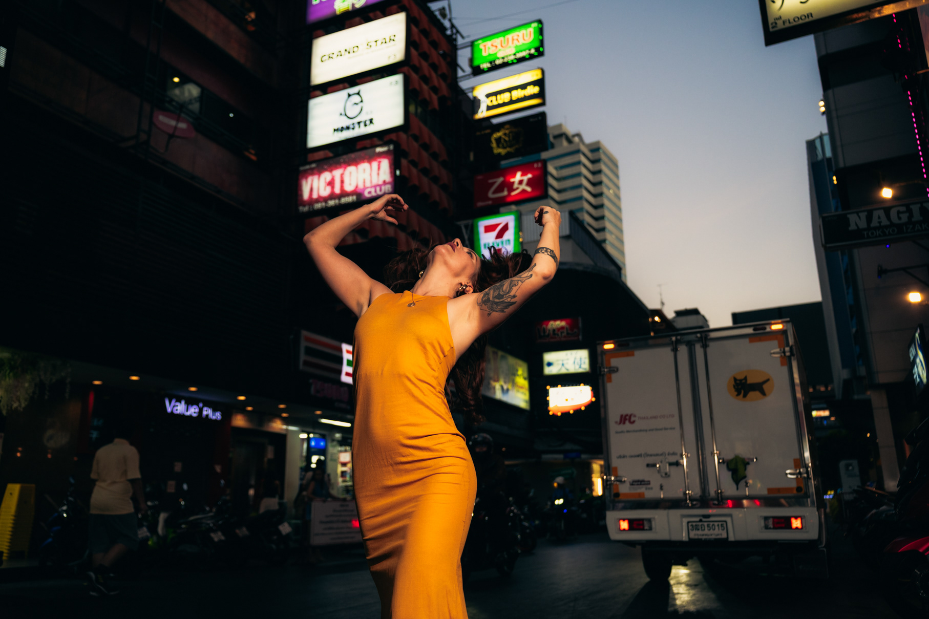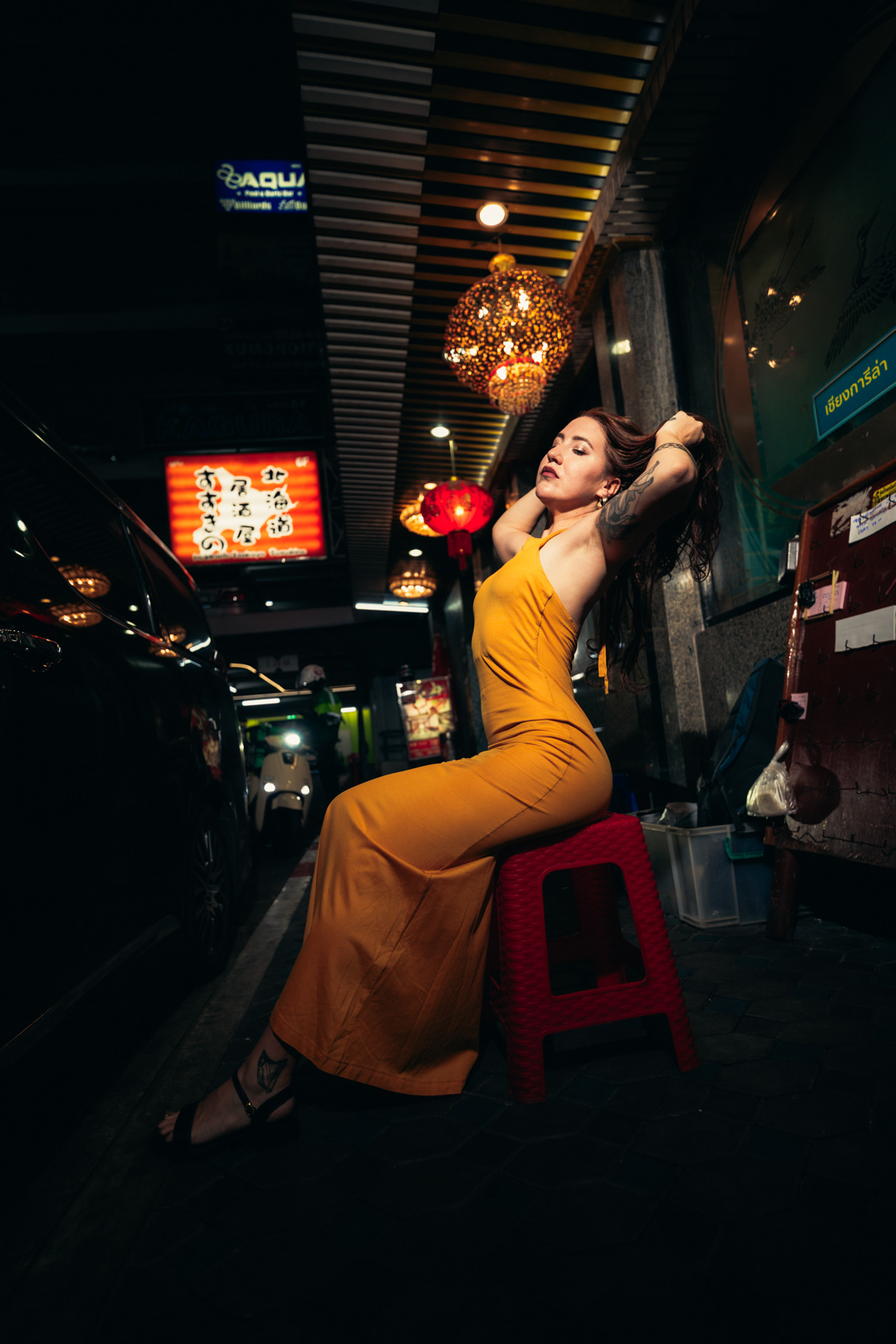 Neon & Silk: Cinematic Evening Wear Portraits in Bangkok This series brings high-fashion glamour to the streets of Bangkok after dark. The concept focuses on the contrast between elegance and urban chaos. Featuring a striking yellow evening gown, the subject commands attention against a backdrop of neon signage, busy traffic, and street-side culture. Shot under the glow of iconic signs like "Purple Drugs" and traditional red lanterns, the lighting mixes ambient city colors with cinematic shadow play. The styling creates a bold visual statement, juxtaposing the fluidity of the dress with the gritty reality of the city—posing on red plastic stools and leaning against shop shutters. This portfolio demonstrates a bold, editorial approach to night fashion photography.