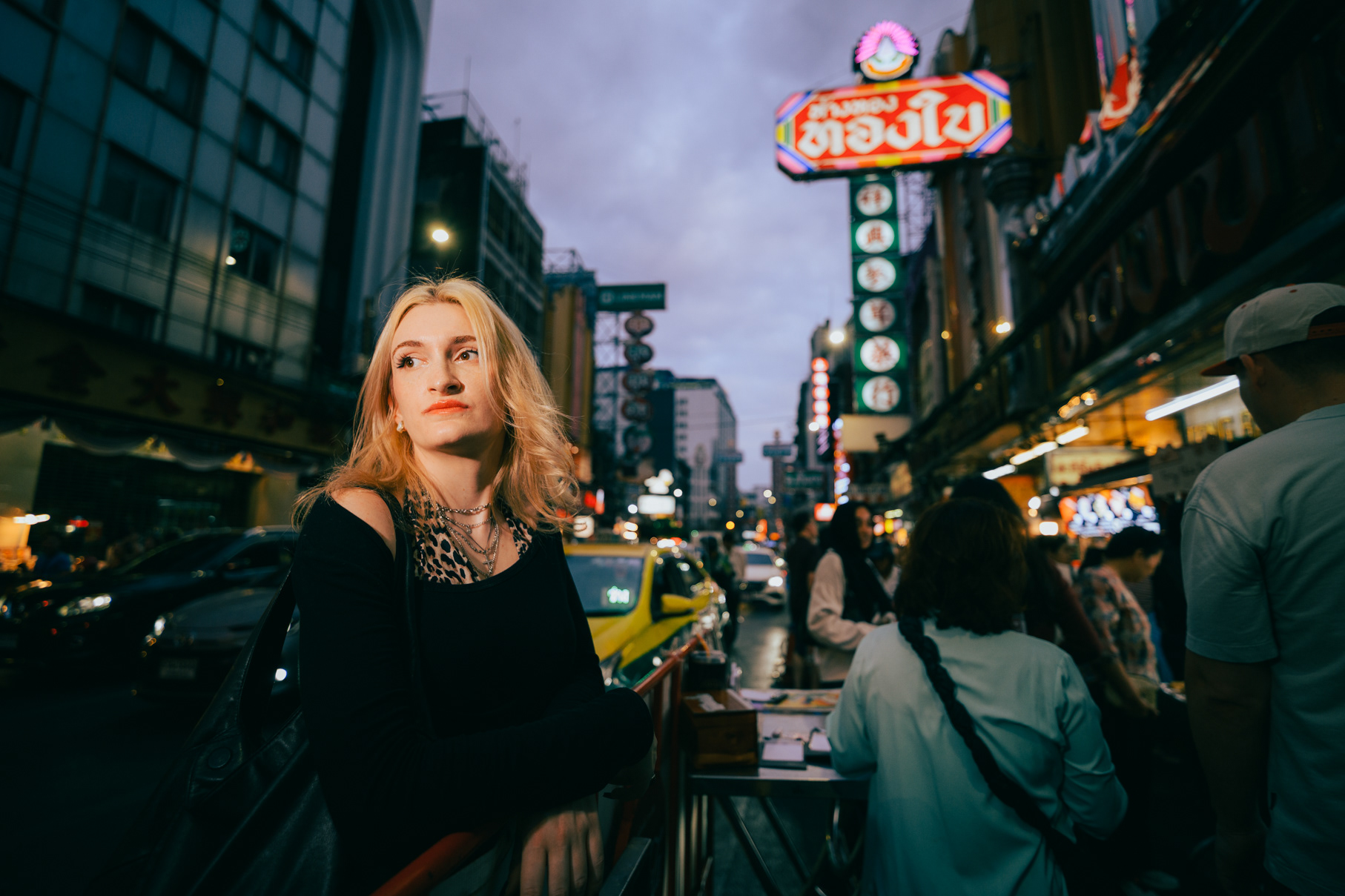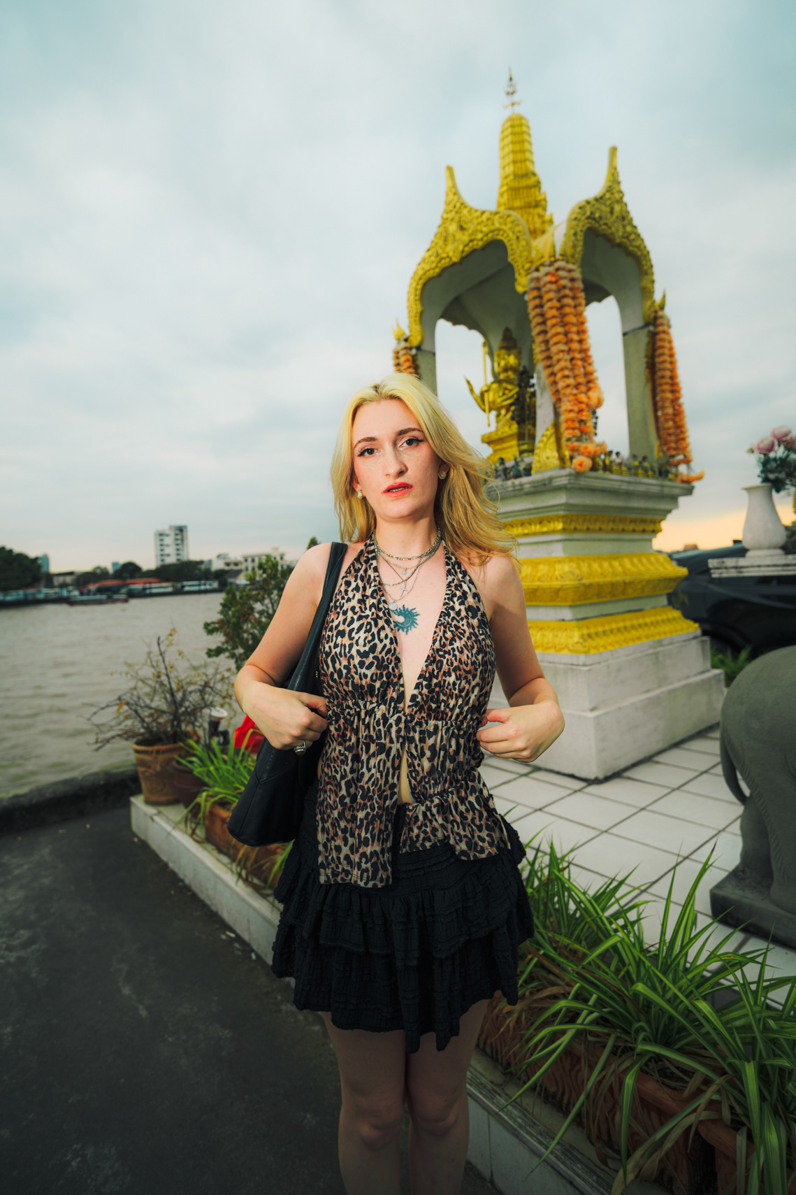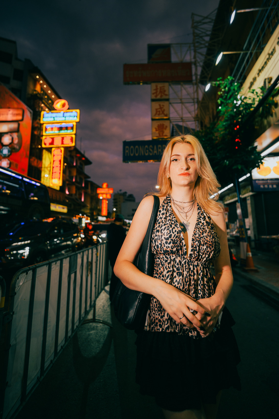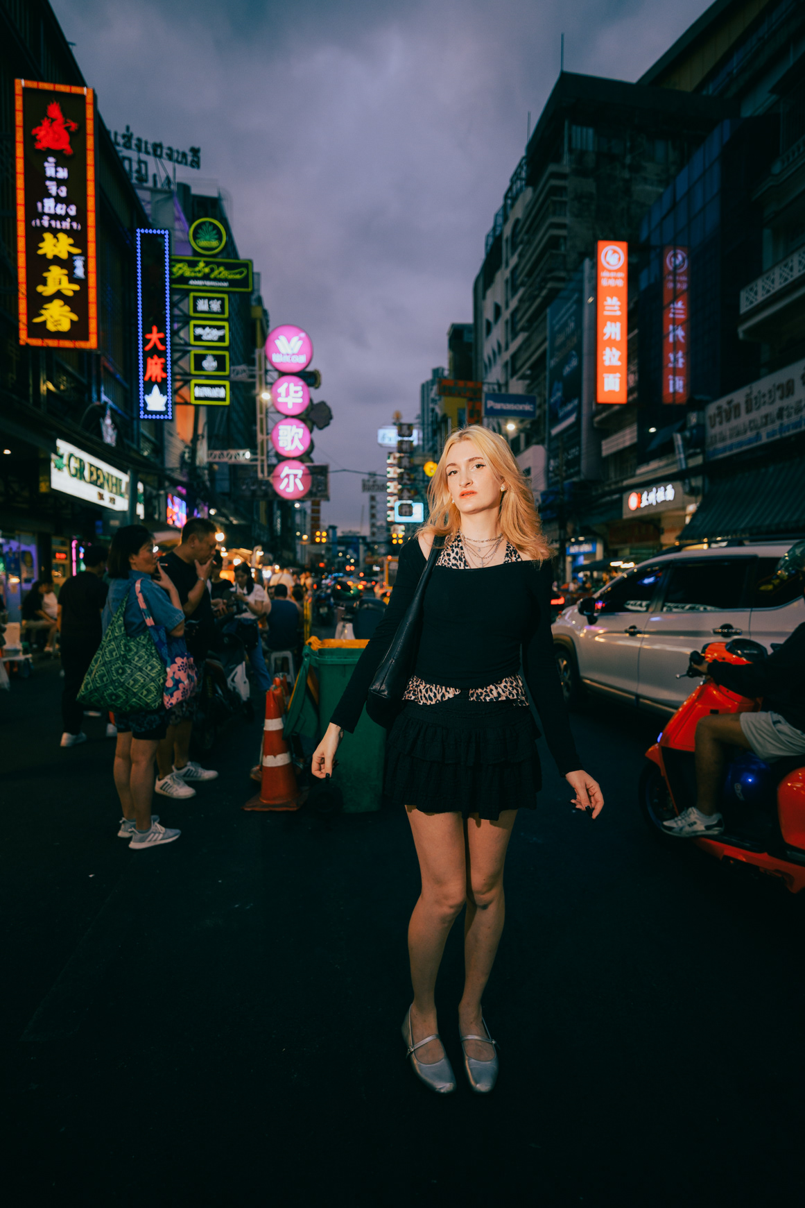 Wide-Angle Urban: Twilight Fashion Portraits in Bangkok Titled "Alexine," this series captures the electric transition from day to night in Bangkok. Shot on location in Chinatown (Yaowarat) and along the banks of the Chao Phraya River, the images explore the city’s chaotic energy through a distinct wide-angle perspective. Embracing lens distortion to create a dynamic, larger-than-life look, these environmental portraits place the subject deep within the urban landscape. The cool twilight sky contrasts with the chaotic neon signage and bustling street crowds, creating a modern, editorial fashion aesthetic. This collection demonstrates a bold approach to street portraiture, utilizing geometry and scale to tell a story of the city after dark.