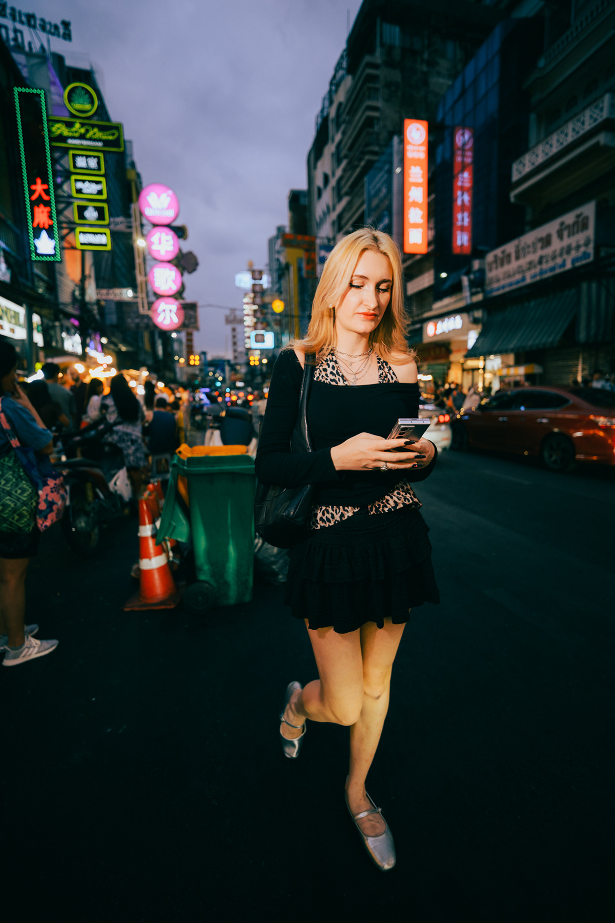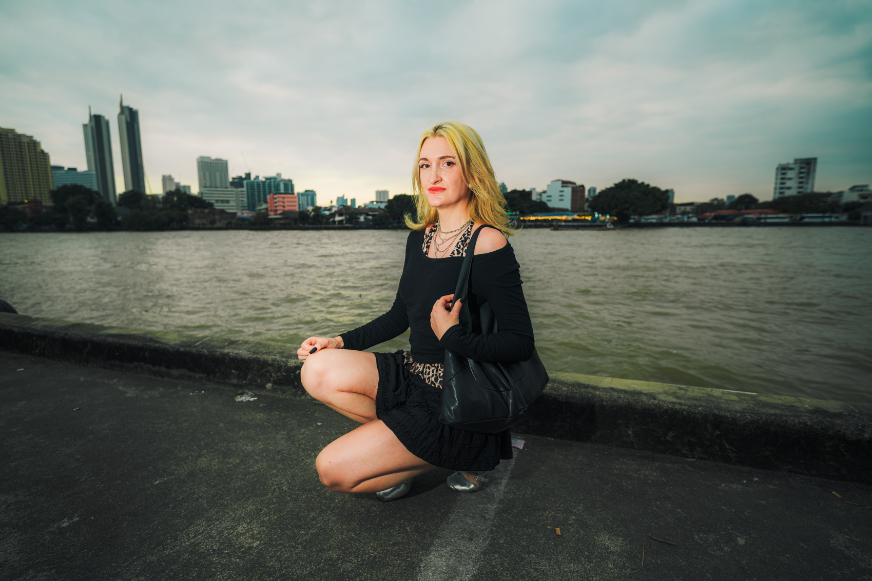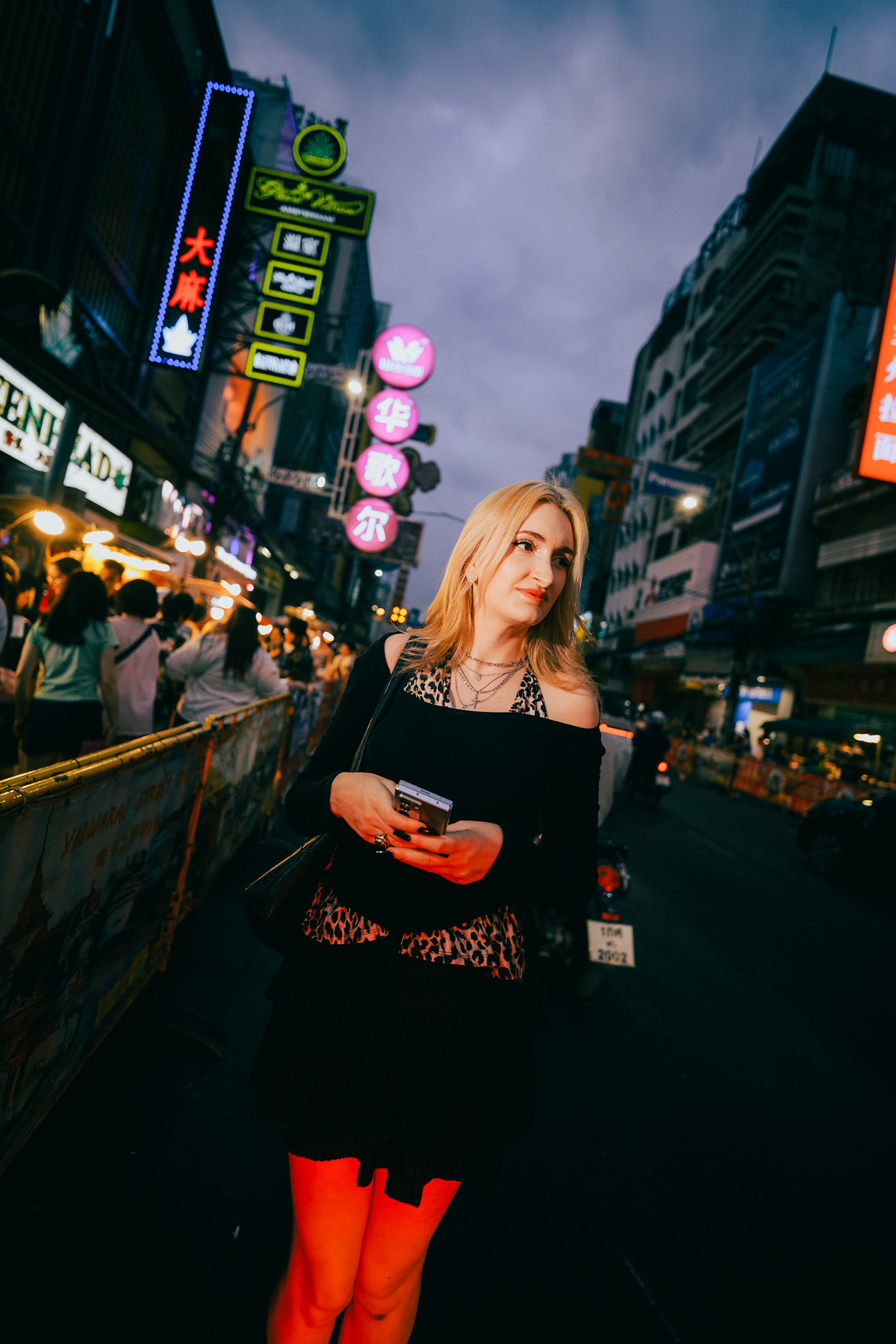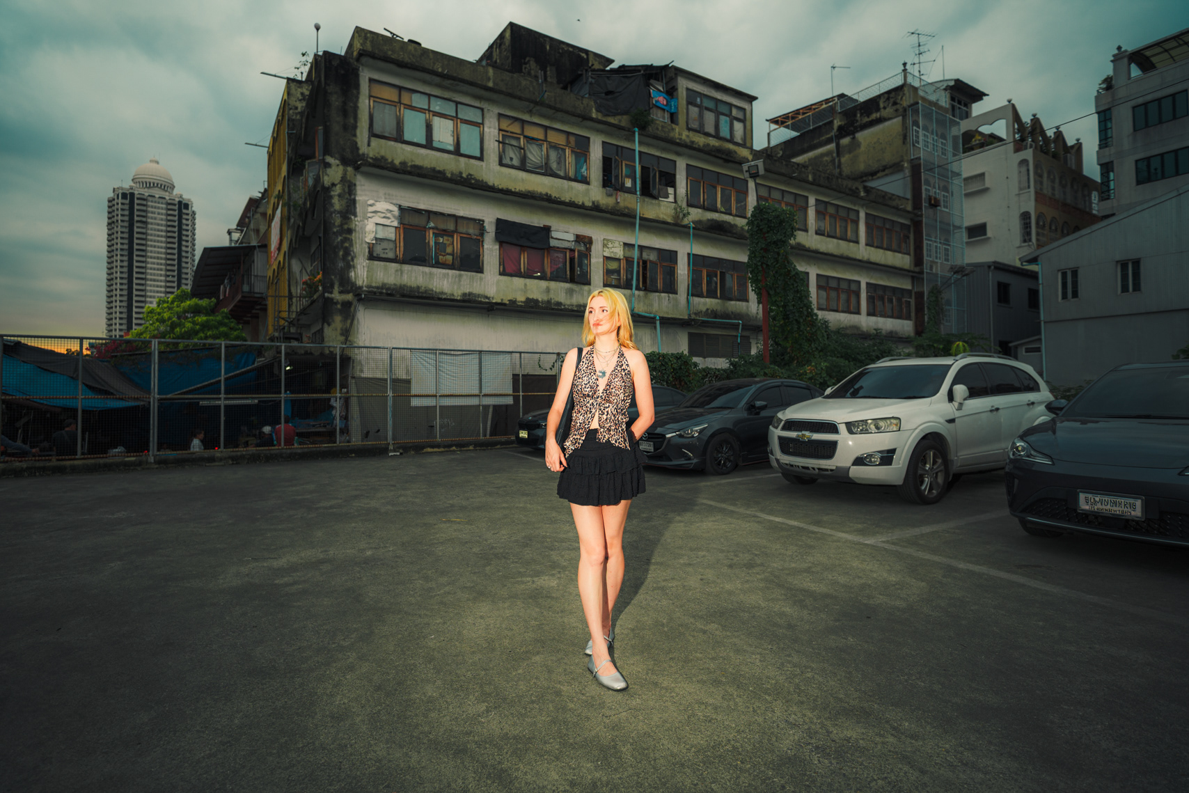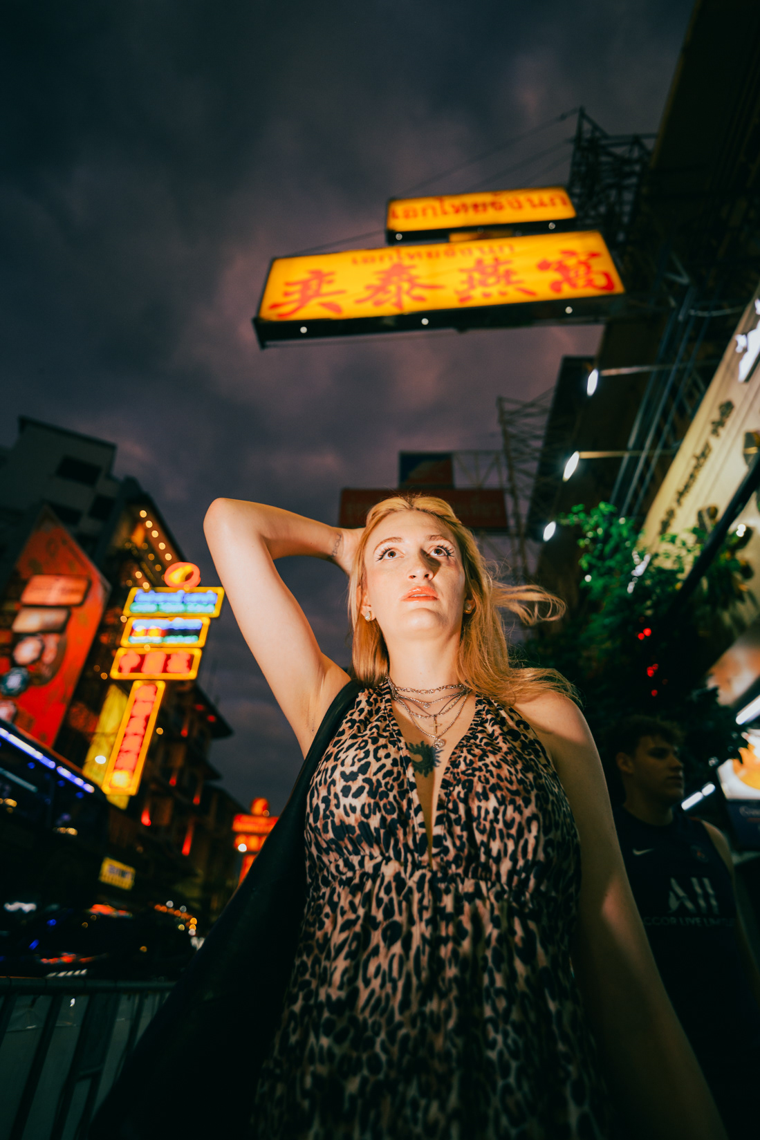 Wide-Angle Urban: Twilight Fashion Portraits in Bangkok Titled "Alexine," this series captures the electric transition from day to night in Bangkok. Shot on location in Chinatown (Yaowarat) and along the banks of the Chao Phraya River, the images explore the city’s chaotic energy through a distinct wide-angle perspective. Embracing lens distortion to create a dynamic, larger-than-life look, these environmental portraits place the subject deep within the urban landscape. The cool twilight sky contrasts with the chaotic neon signage and bustling street crowds, creating a modern, editorial fashion aesthetic. This collection demonstrates a bold approach to street portraiture, utilizing geometry and scale to tell a story of the city after dark.