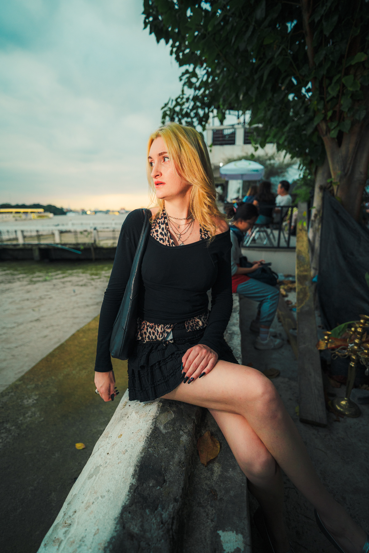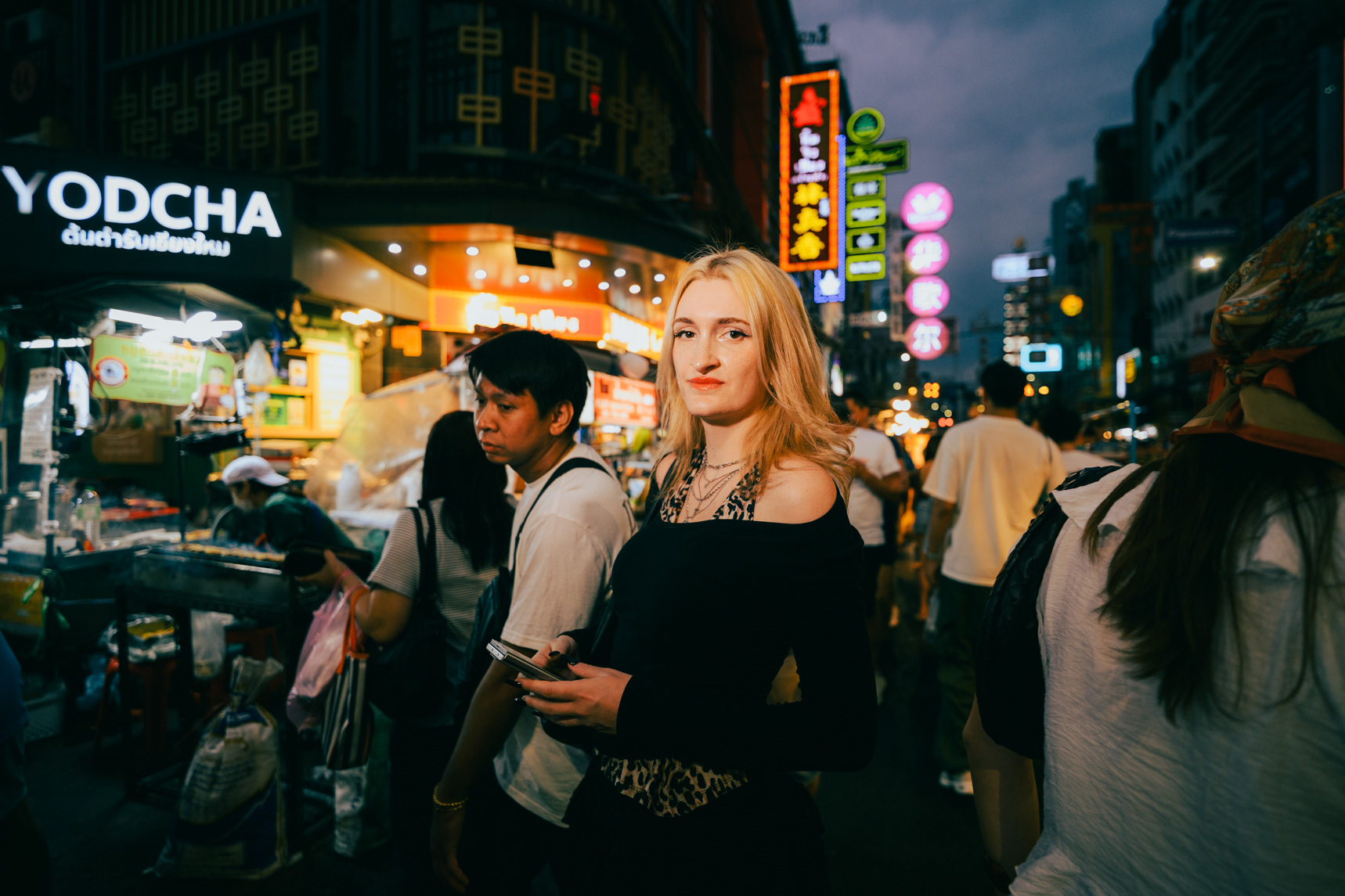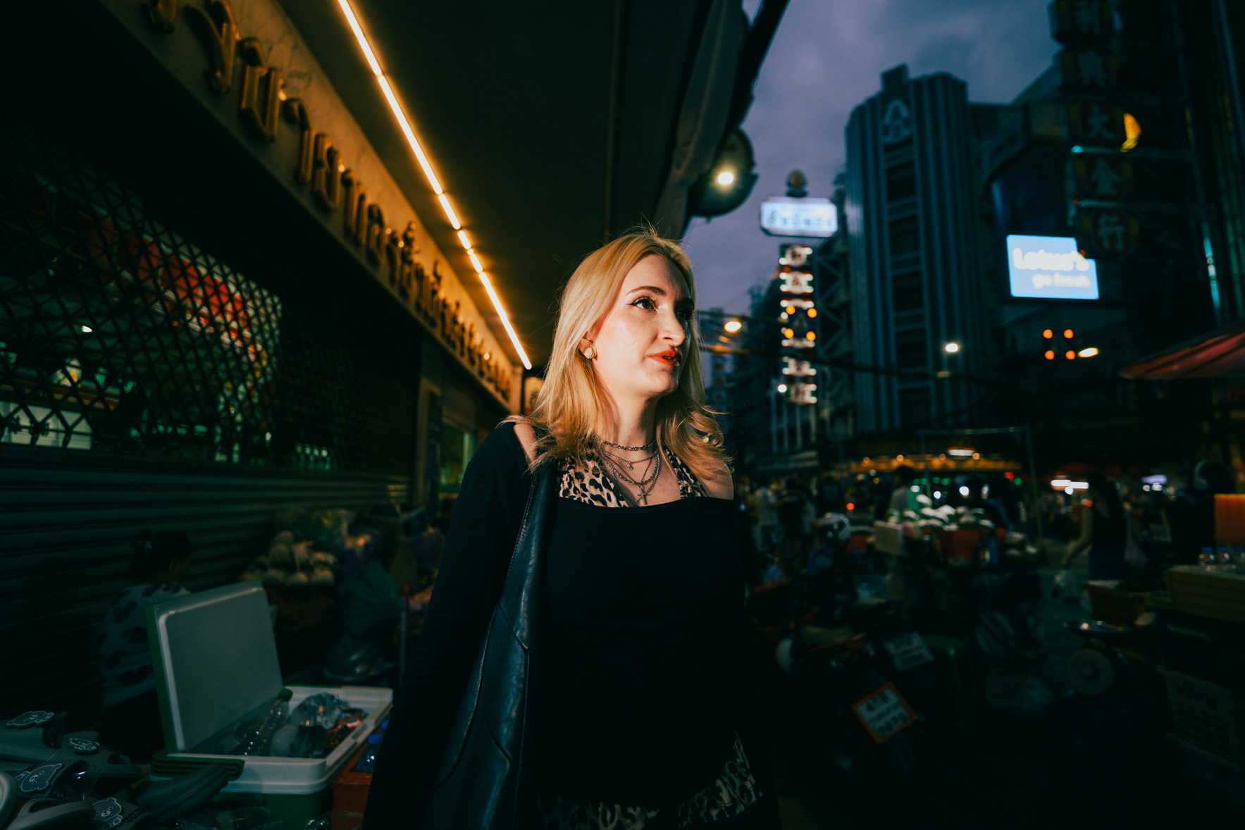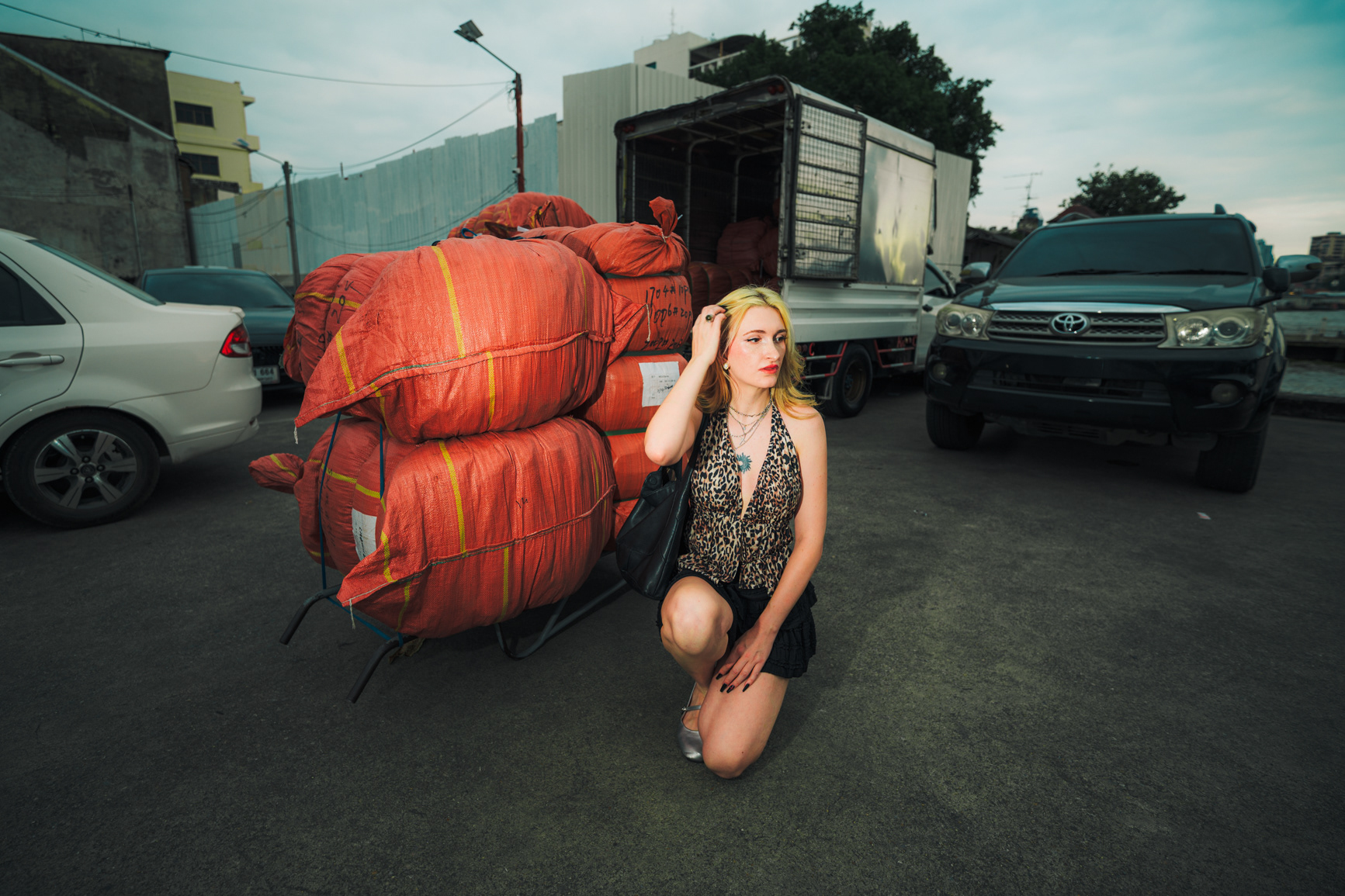 Wide-Angle Urban: Twilight Fashion Portraits in Bangkok Titled "Alexine," this series captures the electric transition from day to night in Bangkok. Shot on location in Chinatown (Yaowarat) and along the banks of the Chao Phraya River, the images explore the city’s chaotic energy through a distinct wide-angle perspective. Embracing lens distortion to create a dynamic, larger-than-life look, these environmental portraits place the subject deep within the urban landscape. The cool twilight sky contrasts with the chaotic neon signage and bustling street crowds, creating a modern, editorial fashion aesthetic. This collection demonstrates a bold approach to street portraiture, utilizing geometry and scale to tell a story of the city after dark.