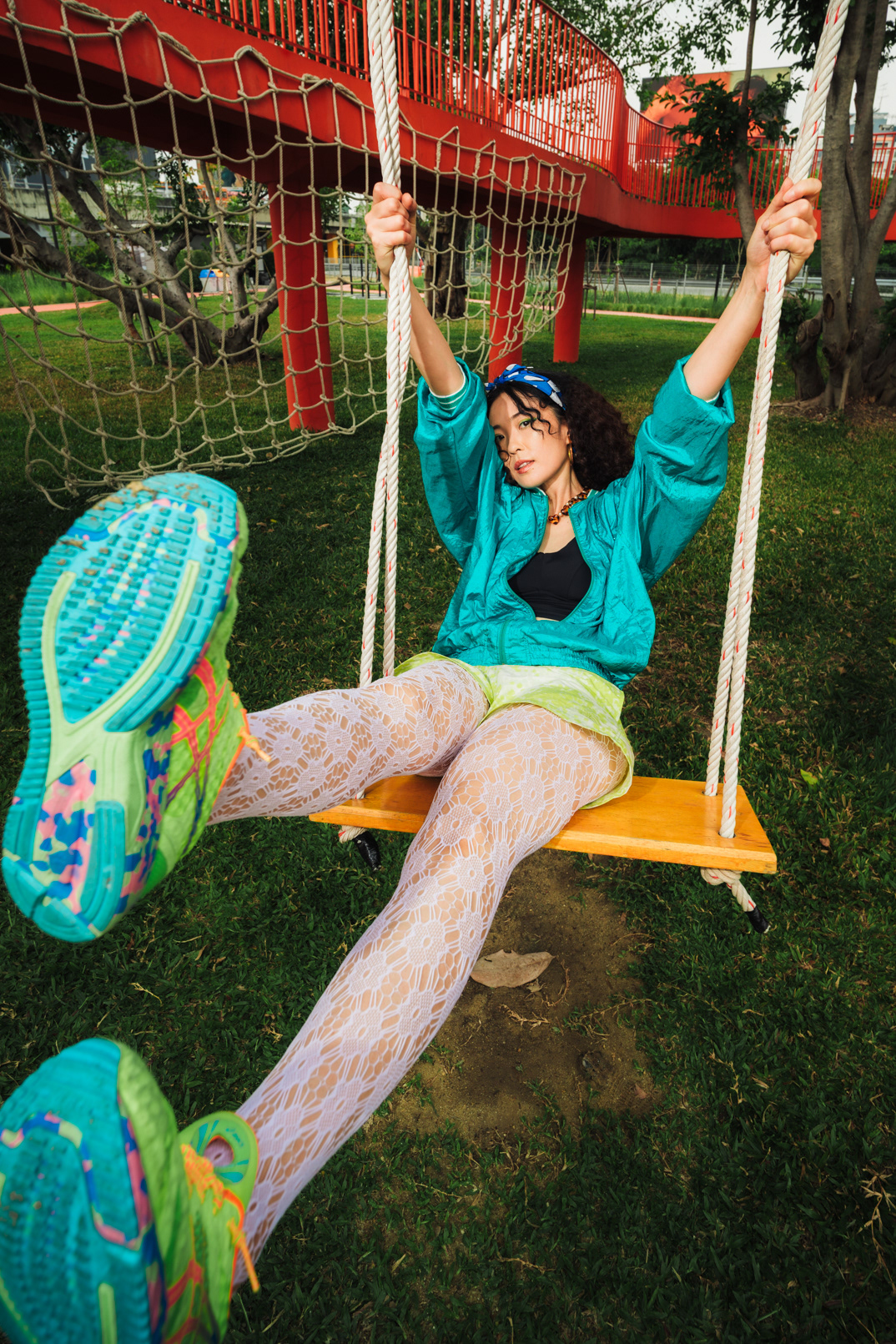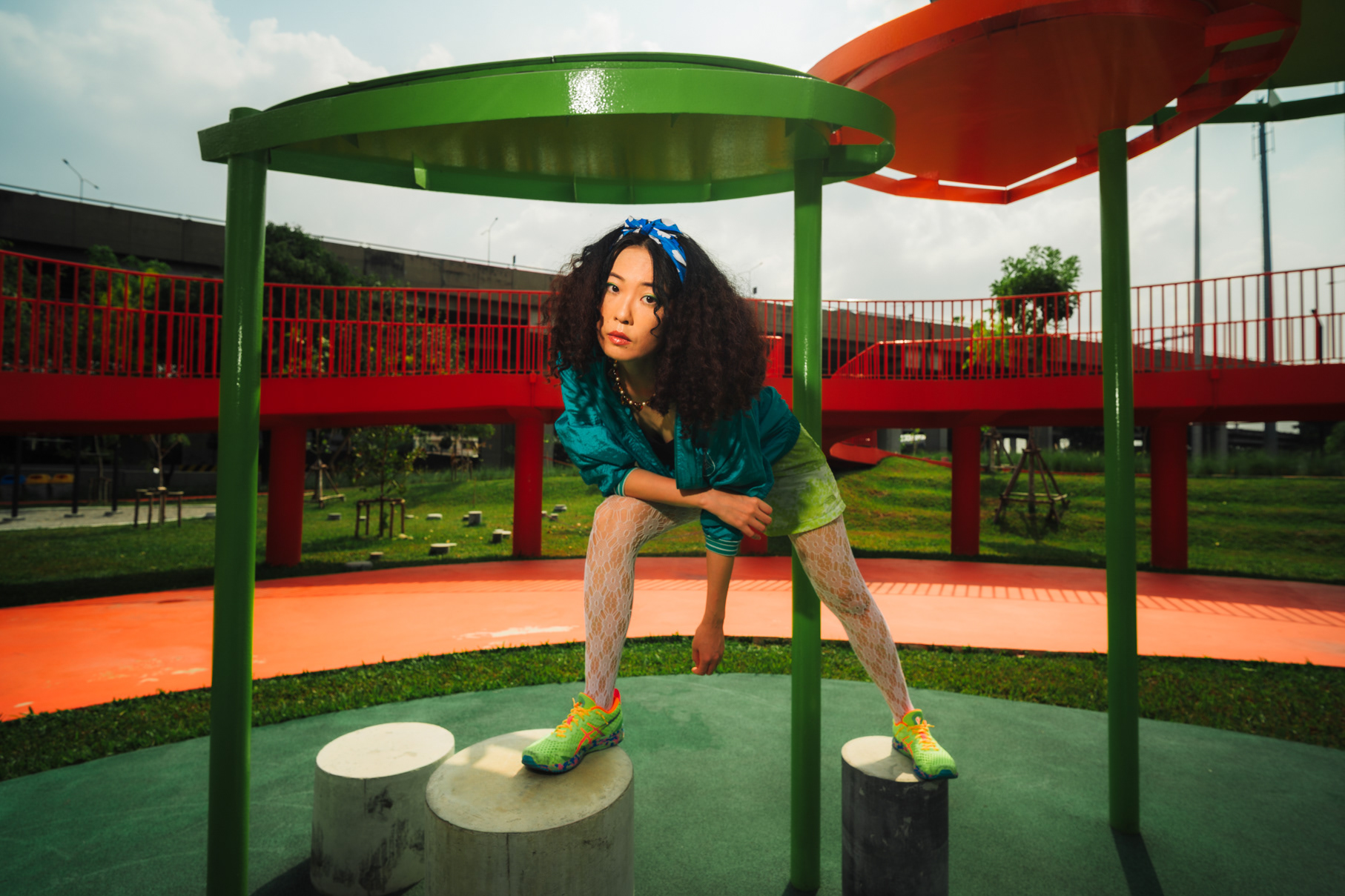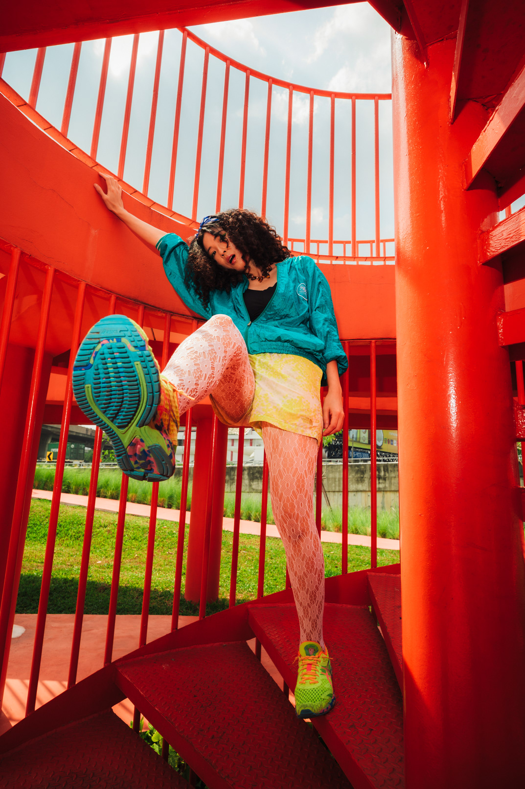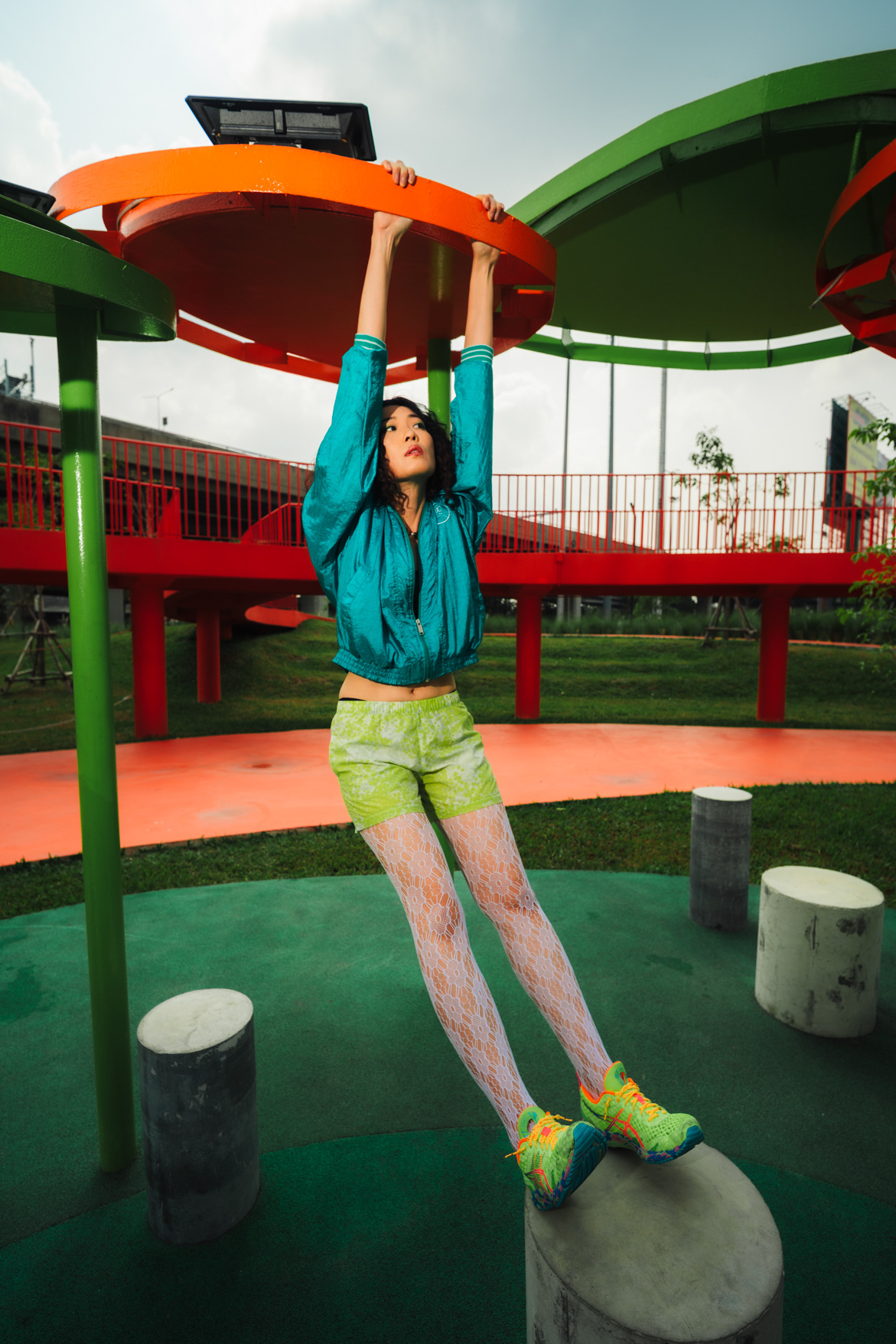 Neon Playground: Sporty Lifestyle & Color Block Photography This series showcases the work of a Bangkok photographer capturing the playful, energetic side of youth culture. Set in a vibrant urban playground, the shoot focuses on active lifestyle and bold color theory. The imagery utilizes the location’s striking architecture—yellow beams and red spiral staircases—to frame the subject’s teal and neon-green streetwear. Featuring candid moments like blowing bubblegum and dynamic actions on the playground equipment, this portfolio demonstrates a fun, high-energy approach to commercial lifestyle photography that appeals to modern Gen Z aesthetics.