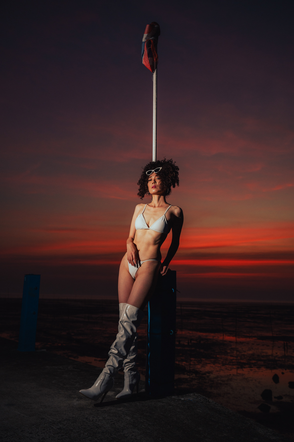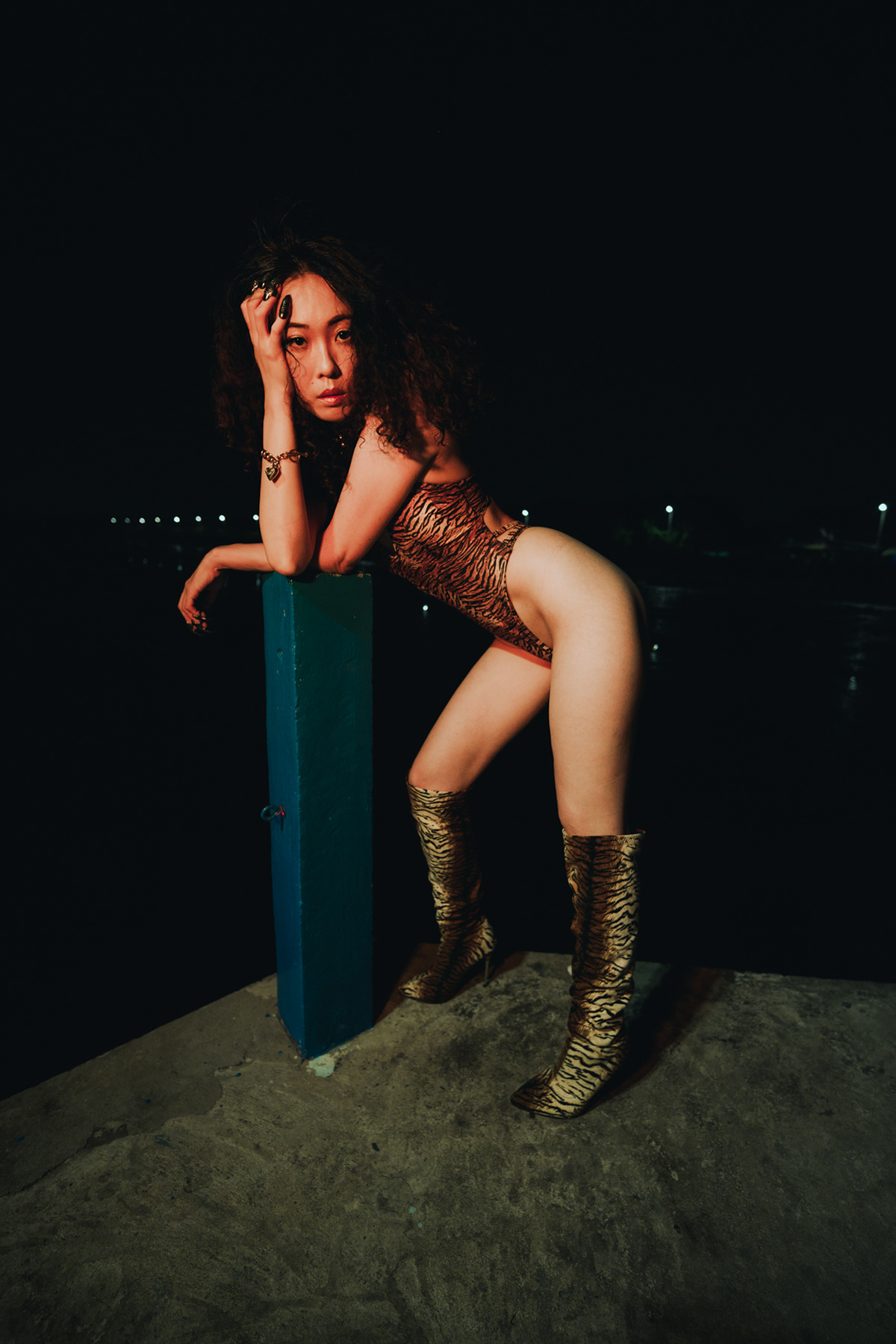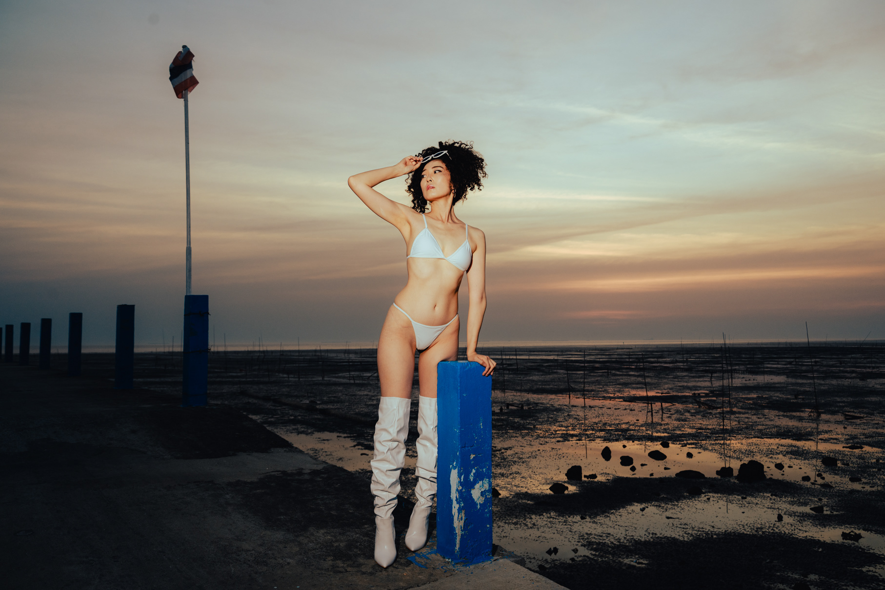 This striking series showcases the work of a Bangkok photographer pushing the boundaries of editorial fashion on location at a desolate coastal pier. Leaving the bustling city streets behind, this project uses the vast, open horizon to create an isolating, otherworldly aesthetic. The shoot masterfully captures the transition of light, moving from a dramatic sunset to the deep, moody tones of twilight. As night falls, the series utilizes aggressive direct flash photography to carve out the subject against the dark sky. Featuring bold, conceptual styling—from a stark white ensemble paired with over-the-knee boots to a fierce animal-print bodysuit accented with metallic claw rings—this portfolio demonstrates an elite ability to blend high-fashion conceptual art with cinematic environmental portraiture.
