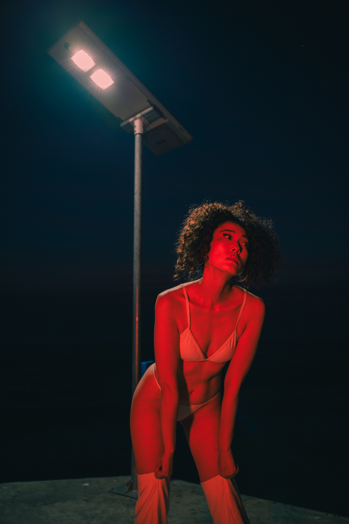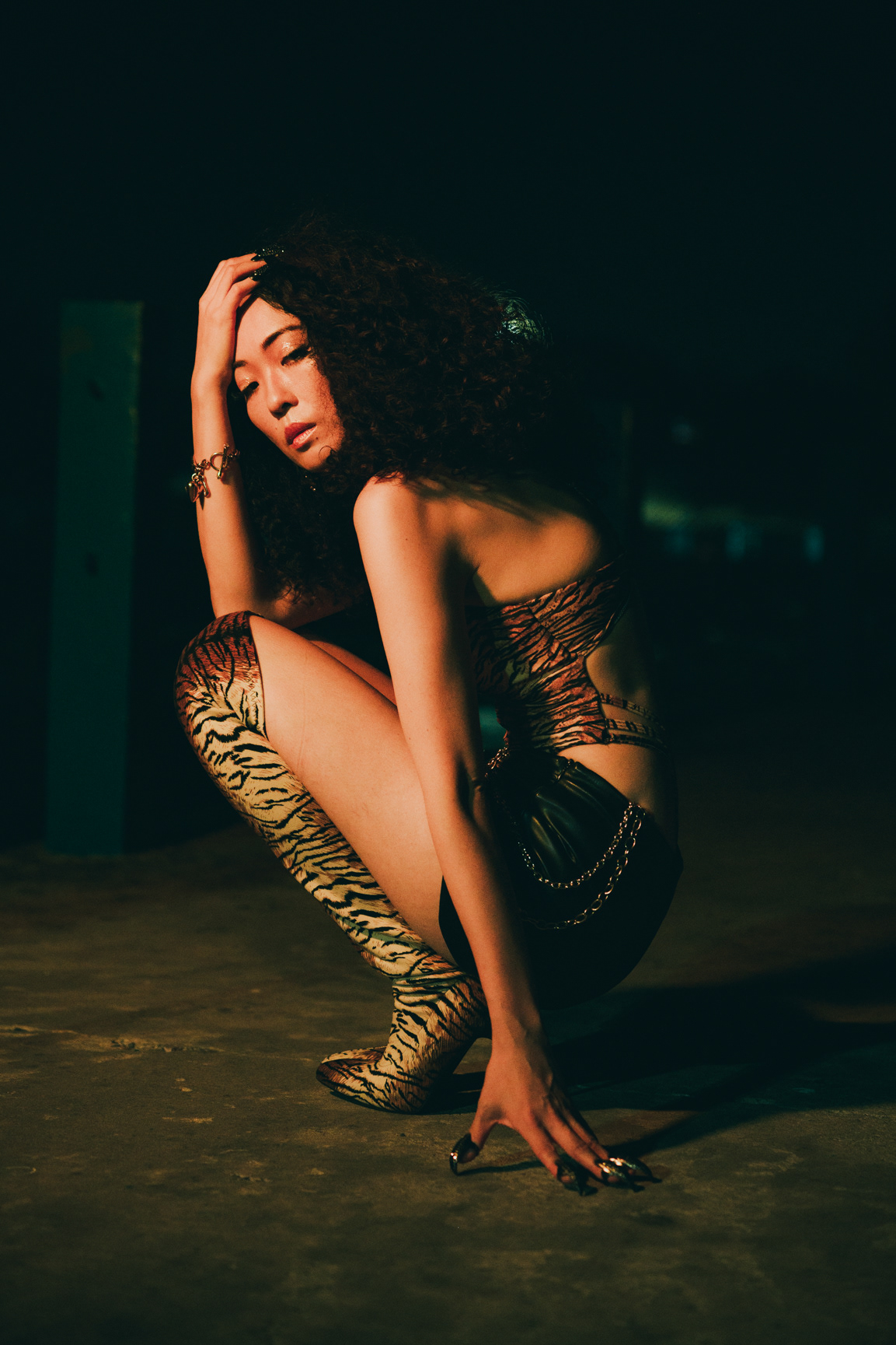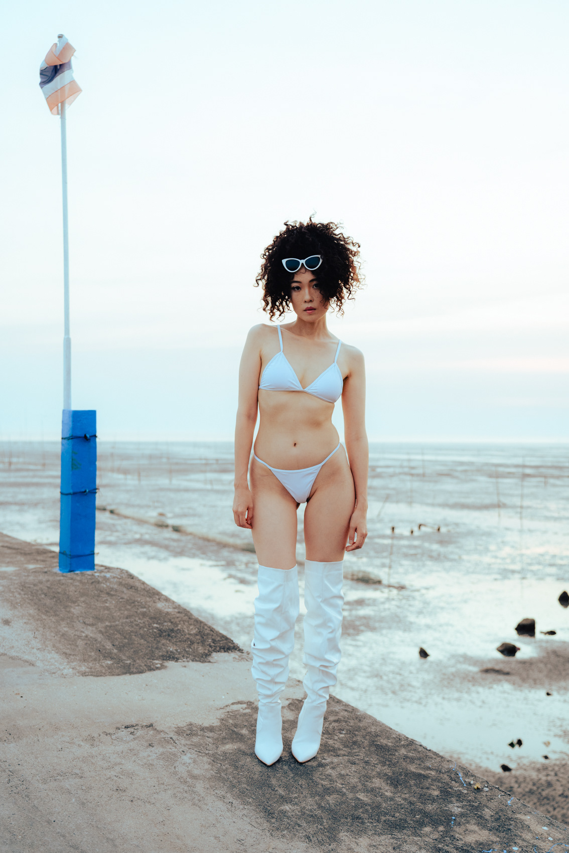This striking series showcases the work of a Bangkok photographer pushing the boundaries of editorial fashion on location at a desolate coastal pier. Leaving the bustling city streets behind, this project uses the vast, open horizon to create an isolating, otherworldly aesthetic. The shoot masterfully captures the transition of light, moving from a dramatic sunset to the deep, moody tones of twilight. As night falls, the series utilizes aggressive direct flash photography to carve out the subject against the dark sky. Featuring bold, conceptual styling—from a stark white ensemble paired with over-the-knee boots to a fierce animal-print bodysuit accented with metallic claw rings—this portfolio demonstrates an elite ability to blend high-fashion conceptual art with cinematic environmental portraiture.