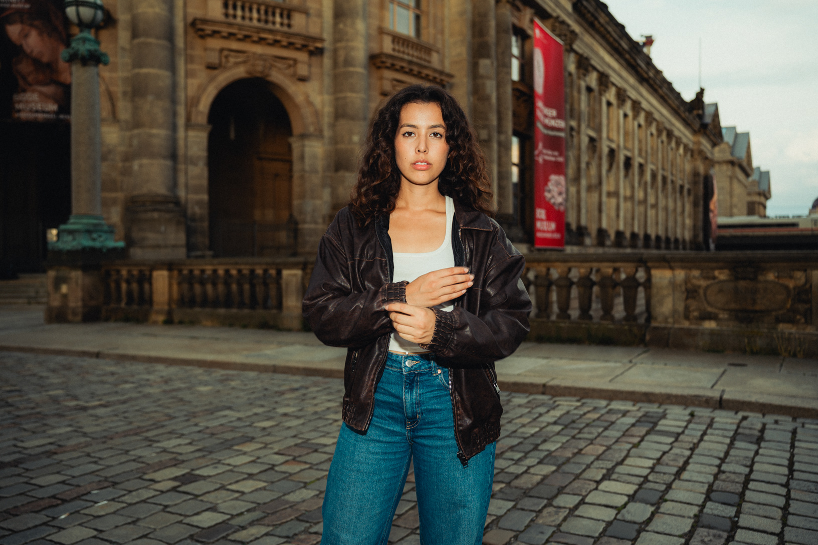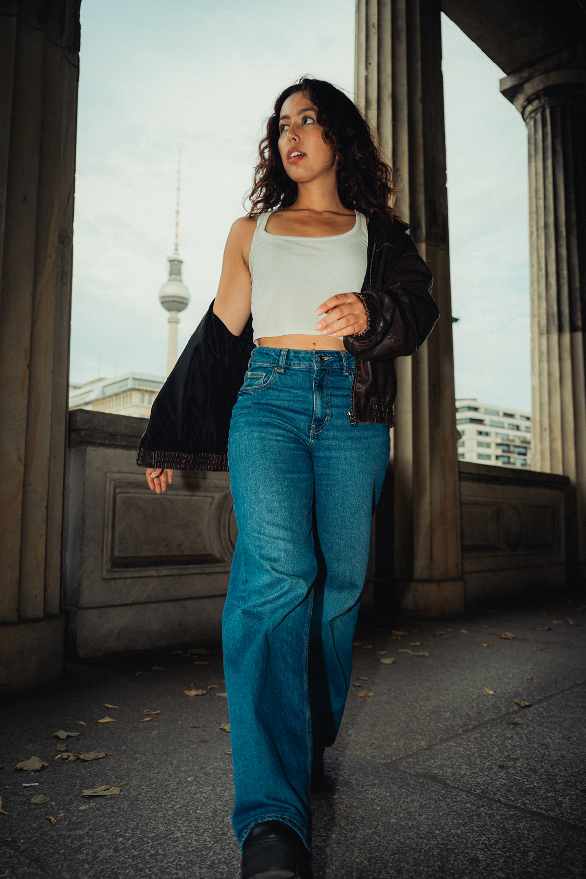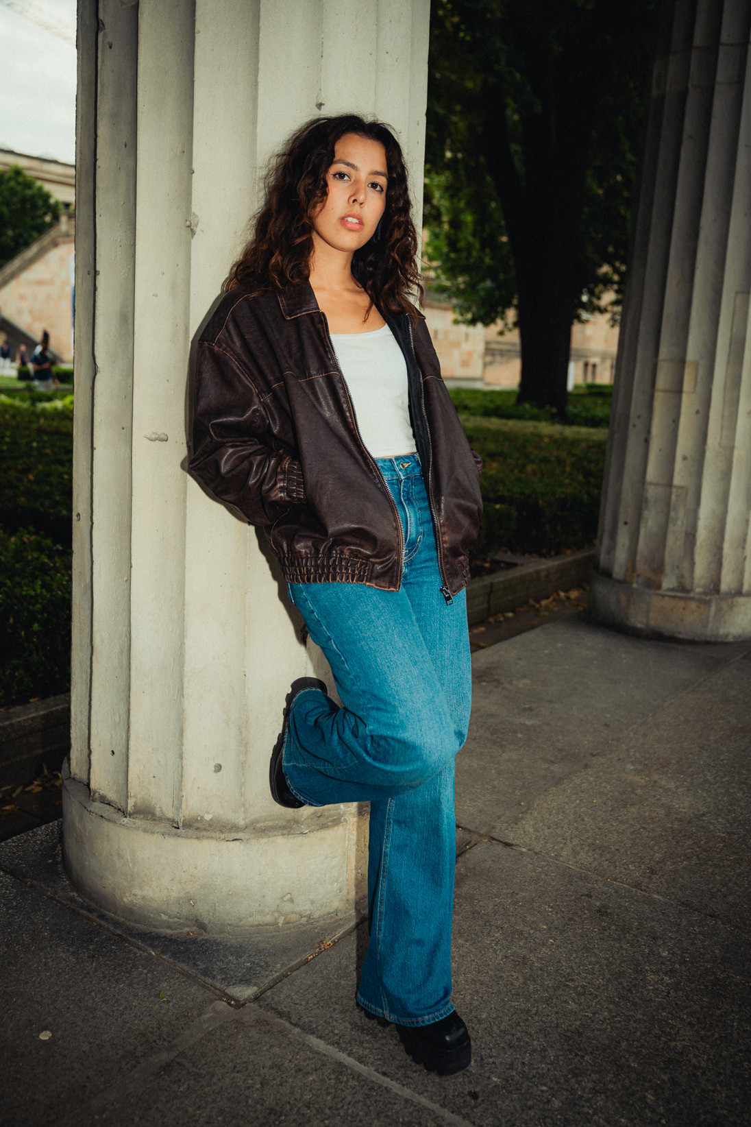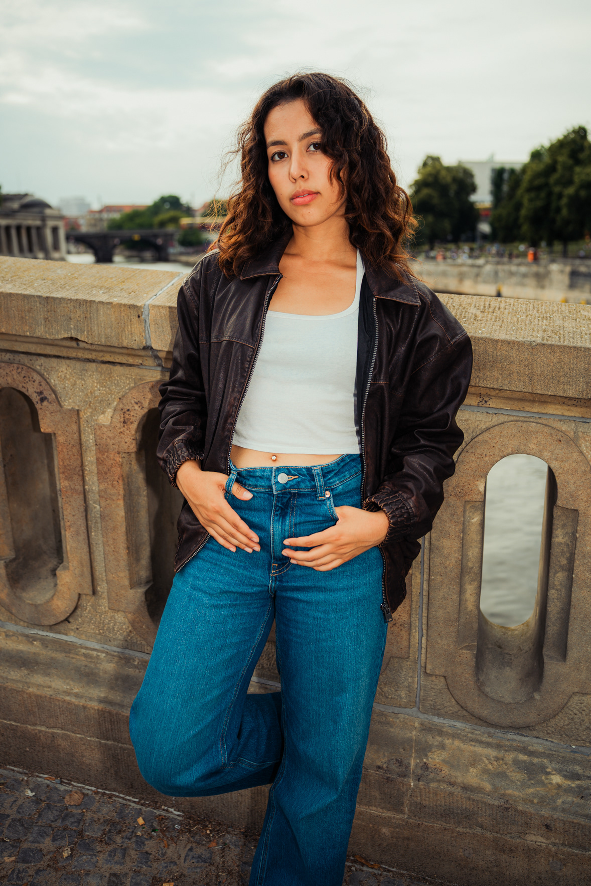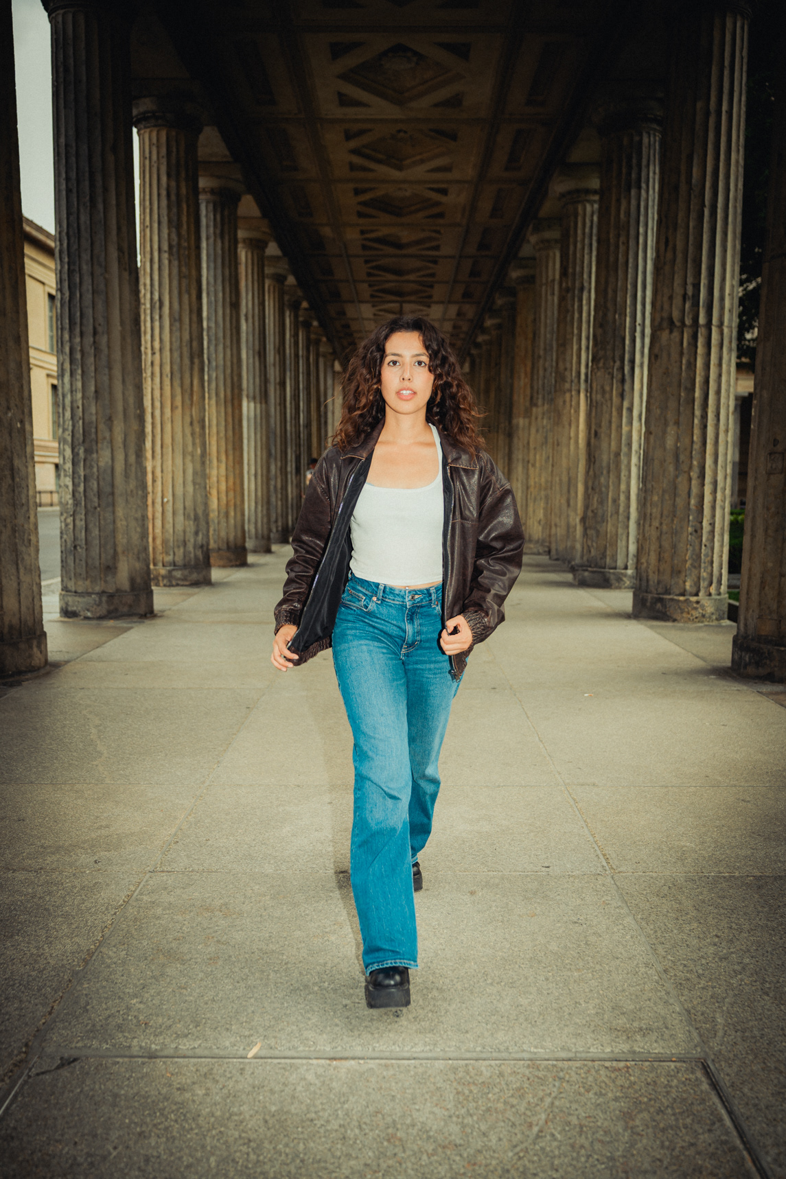 Vintage Cool: Classic Street Style in Berlin-Mitte This series captures the timeless, effortless cool of Berlin street fashion. Shot amidst the historic colonnades and riverbanks of Museum Island, the portraits blend classic architecture with a modern vintage aesthetic. Featuring a 90s-inspired look—an oversized leather jacket paired with wide-leg denim—the session explores the textural contrast between worn leather and the pristine stone columns of the Alte Nationalgalerie. From candid walking shots along the Spree River to relaxed poses on historic stone benches, this portfolio highlights a natural, cinematic approach to lifestyle photography in the heart of the city.