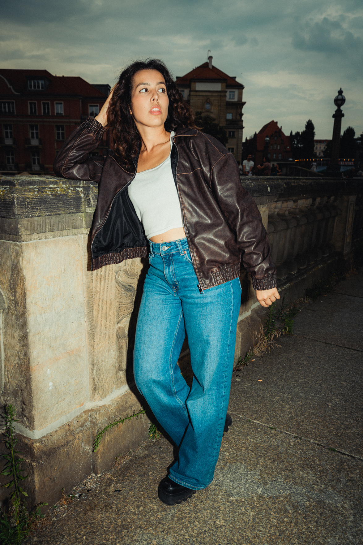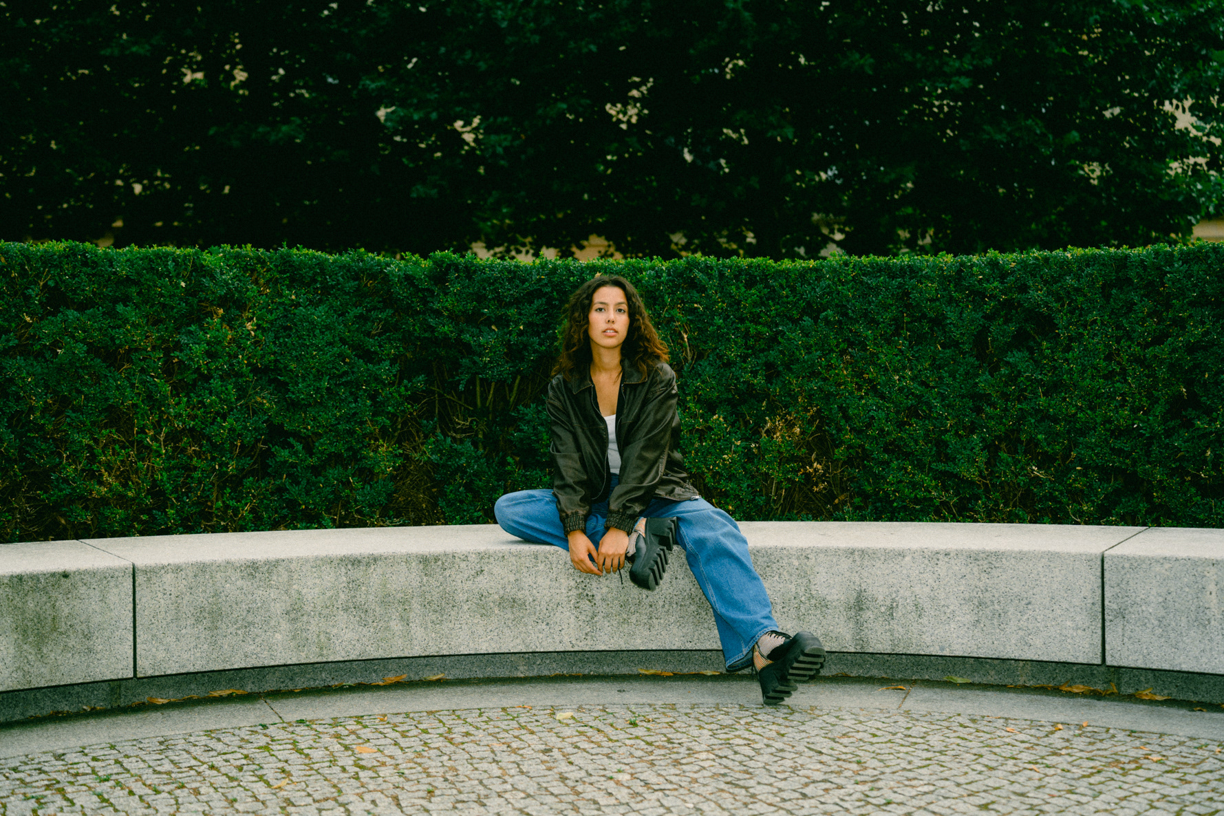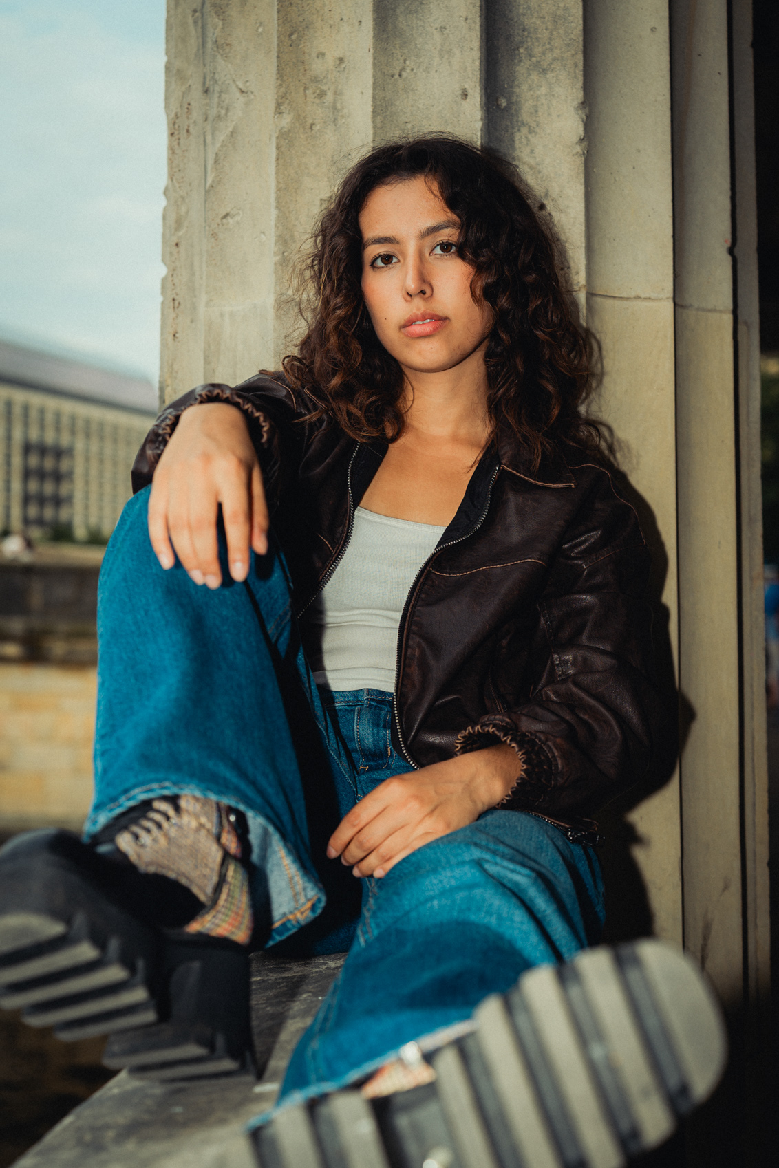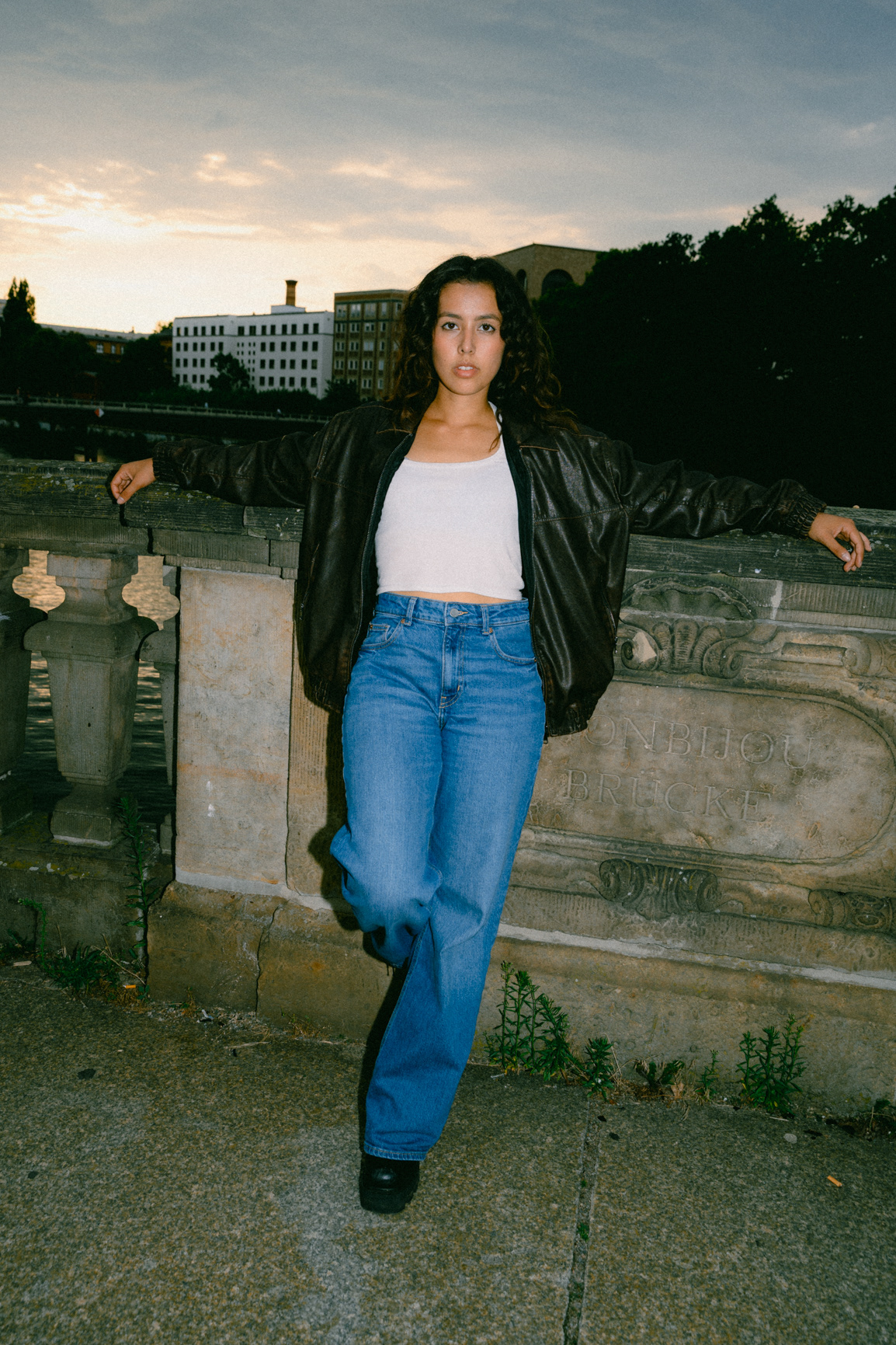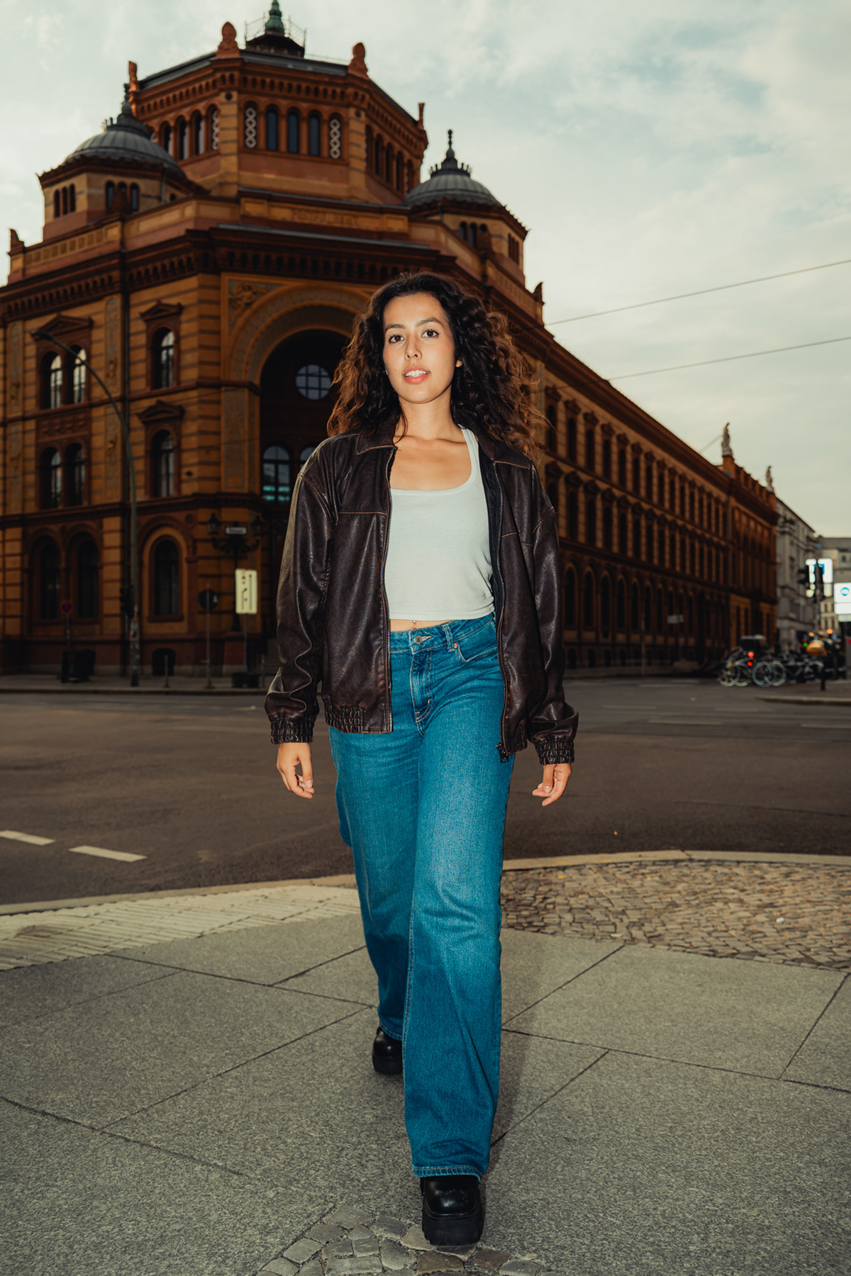 Vintage Cool: Classic Street Style in Berlin-Mitte This series captures the timeless, effortless cool of Berlin street fashion. Shot amidst the historic colonnades and riverbanks of Museum Island, the portraits blend classic architecture with a modern vintage aesthetic. Featuring a 90s-inspired look—an oversized leather jacket paired with wide-leg denim—the session explores the textural contrast between worn leather and the pristine stone columns of the Alte Nationalgalerie. From candid walking shots along the Spree River to relaxed poses on historic stone benches, this portfolio highlights a natural, cinematic approach to lifestyle photography in the heart of the city.