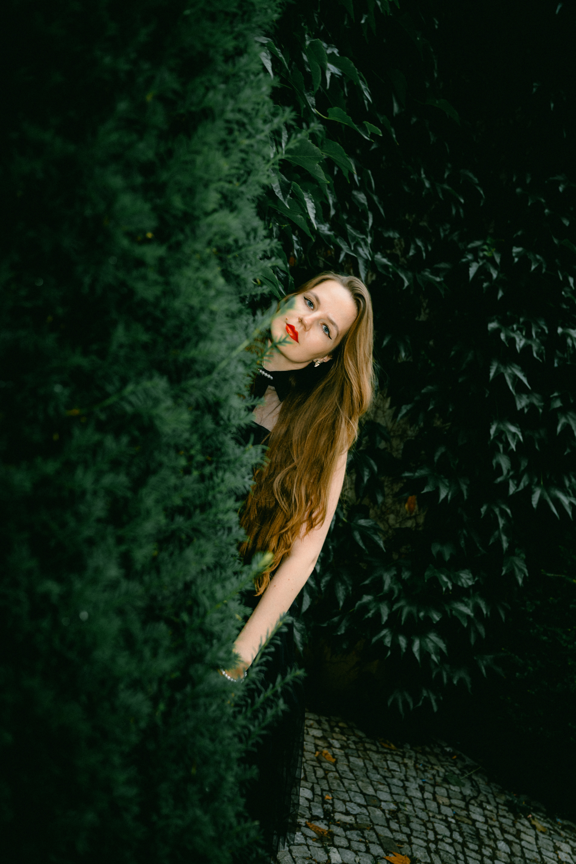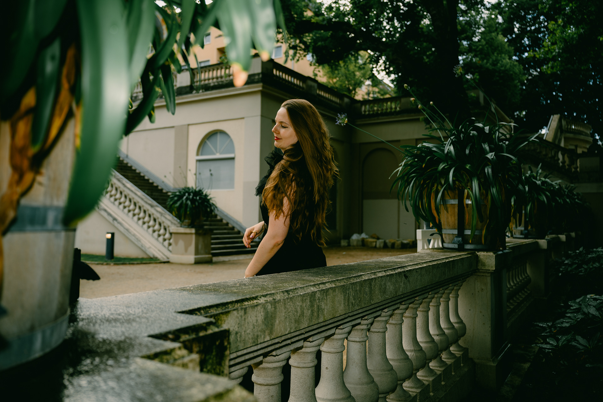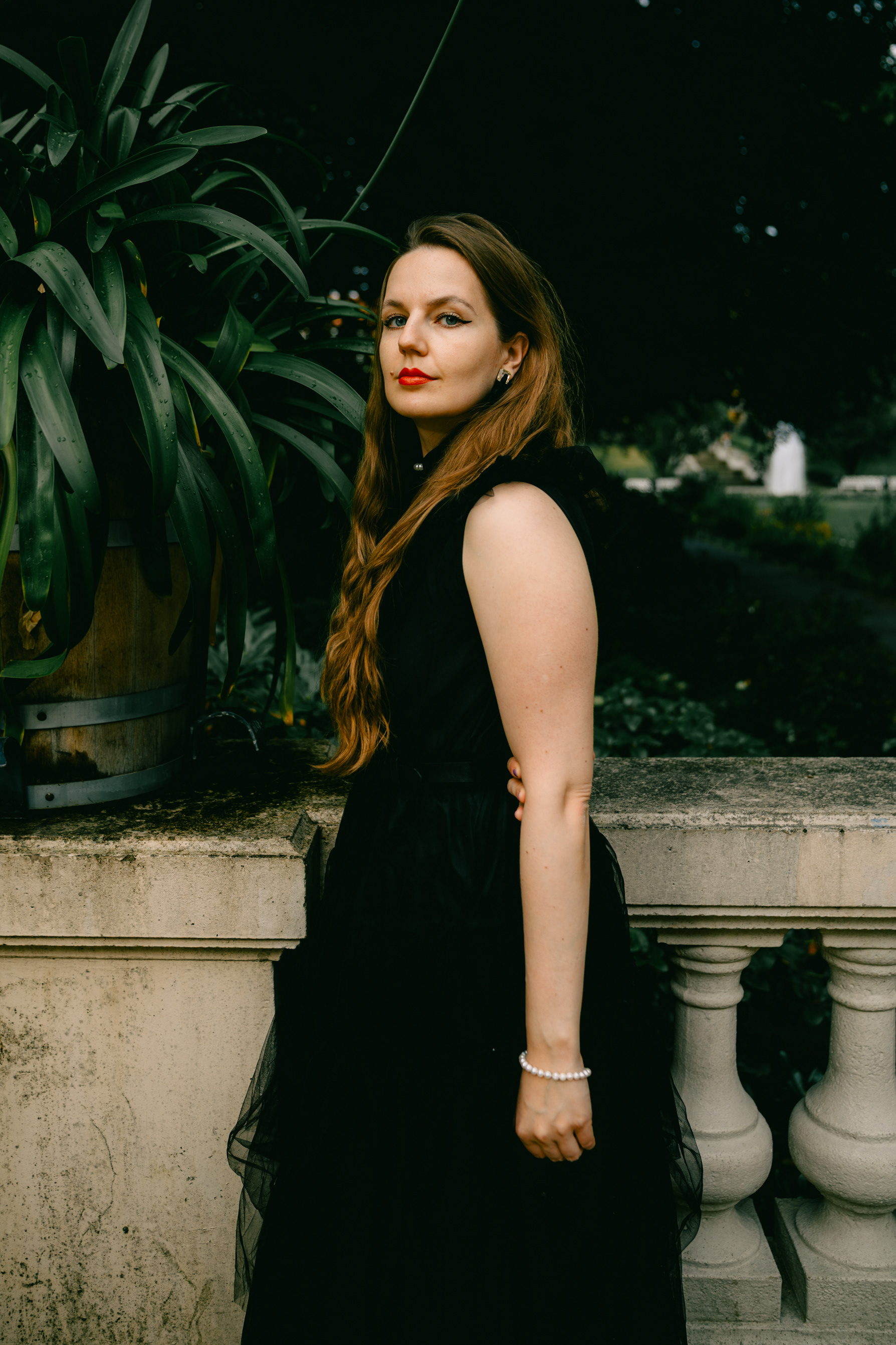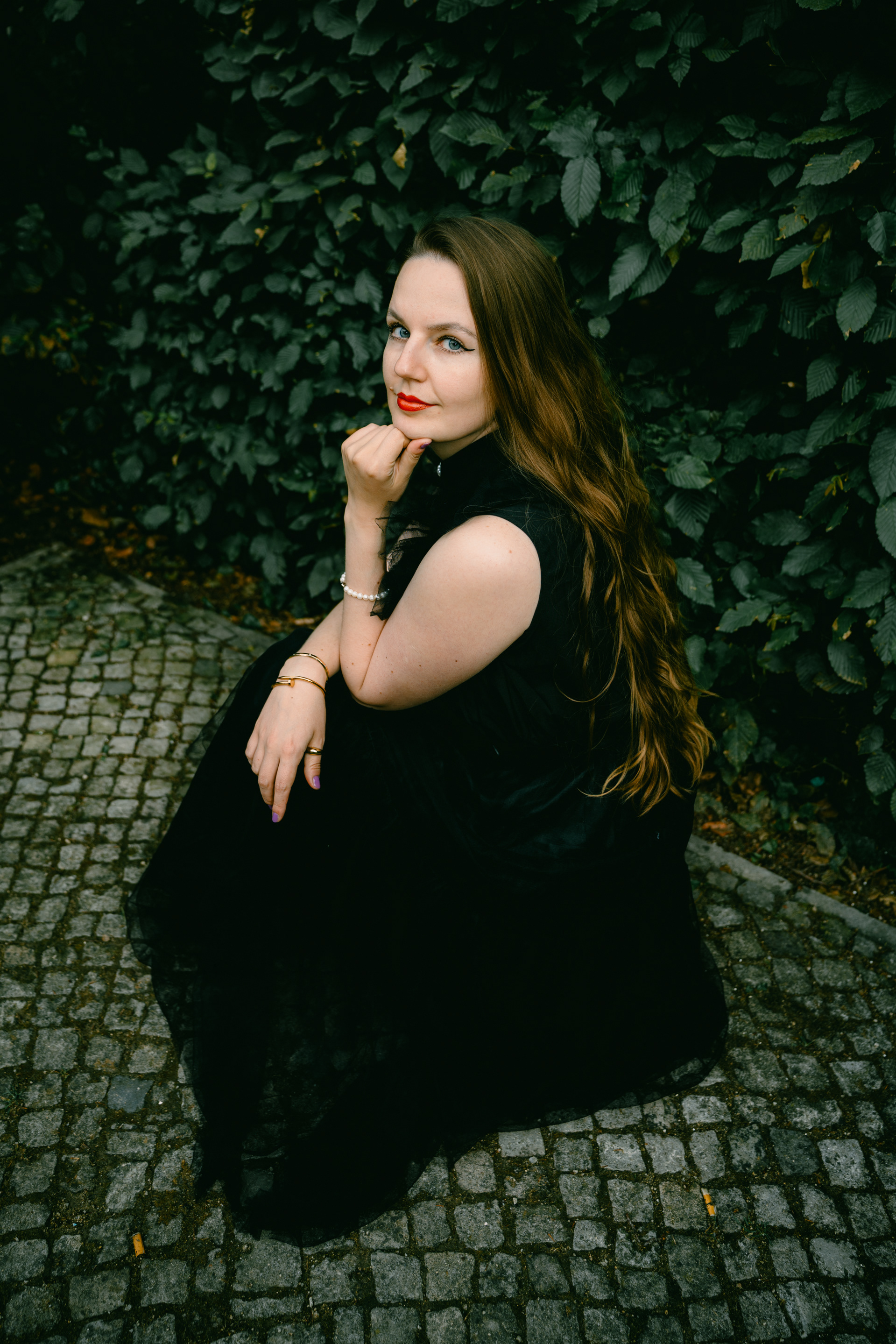 Gothic Romance: Elegant Portraits in a Historic Berlin Garden Stepping away from the grit of the city streets, this series explores a moodier, more romantic side of Berlin. Shot in a historic Neo-Baroque garden (reminiscent of locations like Körnerpark or palace grounds), the imagery focuses on timeless elegance and natural beauty. The session features a modern gothic aesthetic, contrasting a flowing black lace dress against the structured lines of manicured hedges and ivy-clad architecture. Utilizing soft natural light and the texture of ancient stone balustrades, this portfolio demonstrates a sophisticated approach to environmental portraiture, perfect for editorial fashion or clients seeking a cinematic, storybook atmosphere.