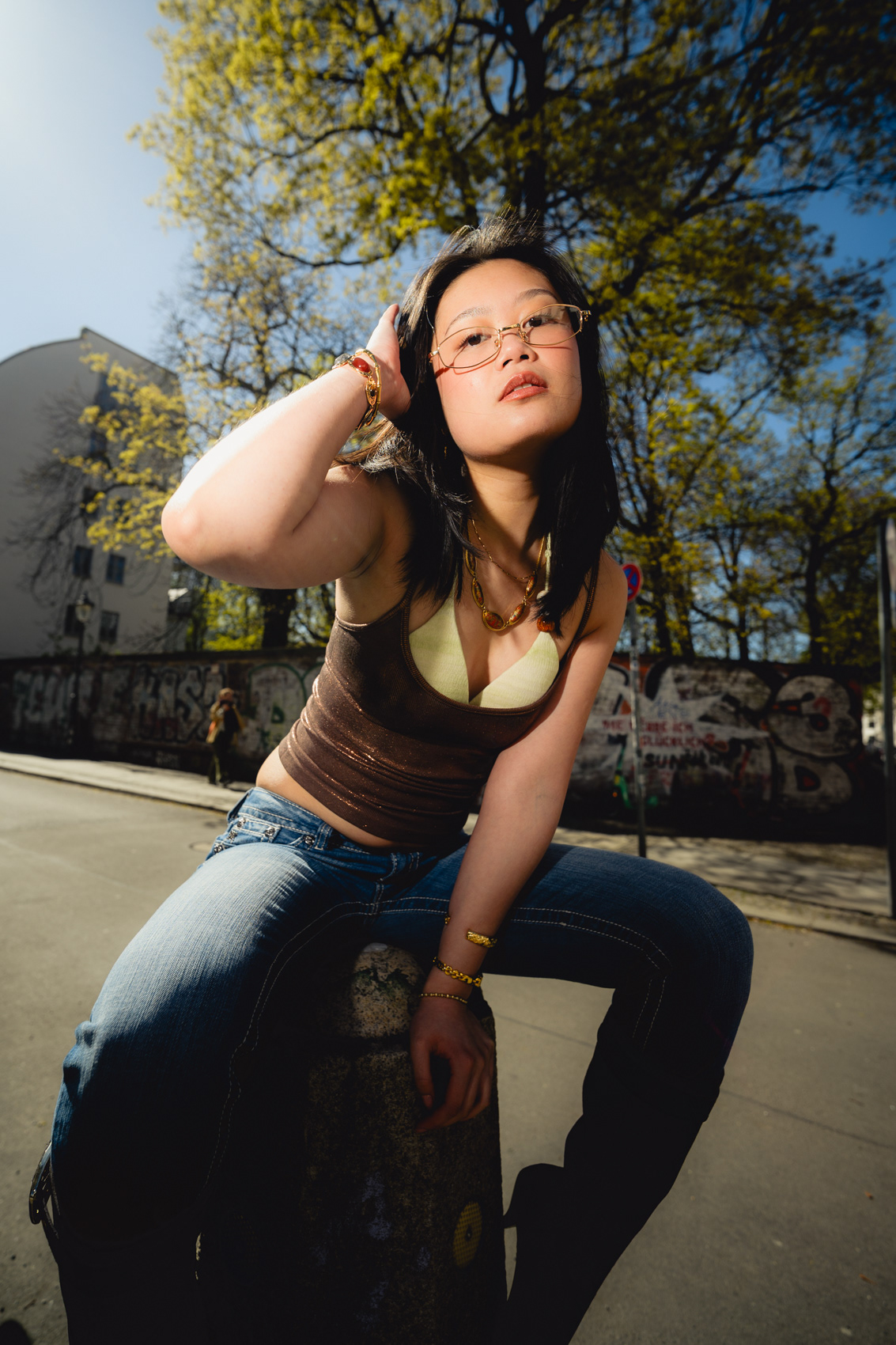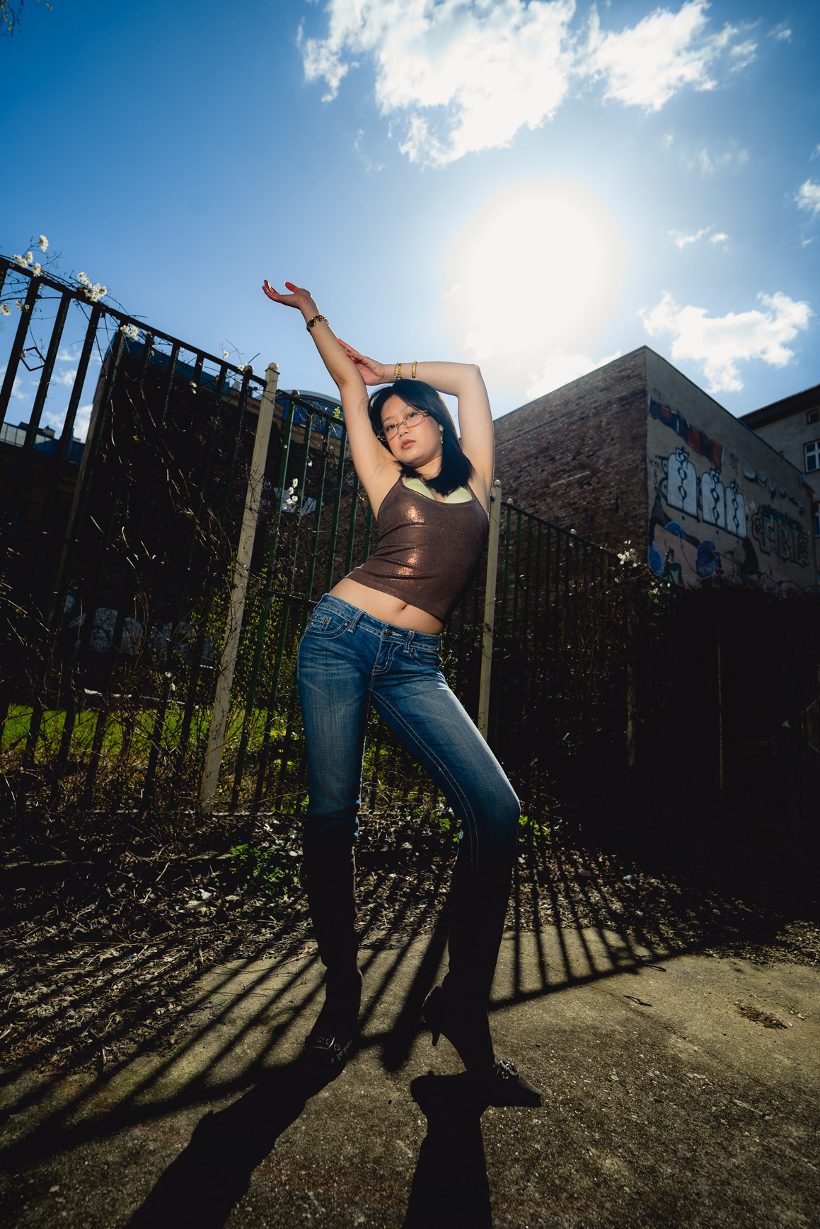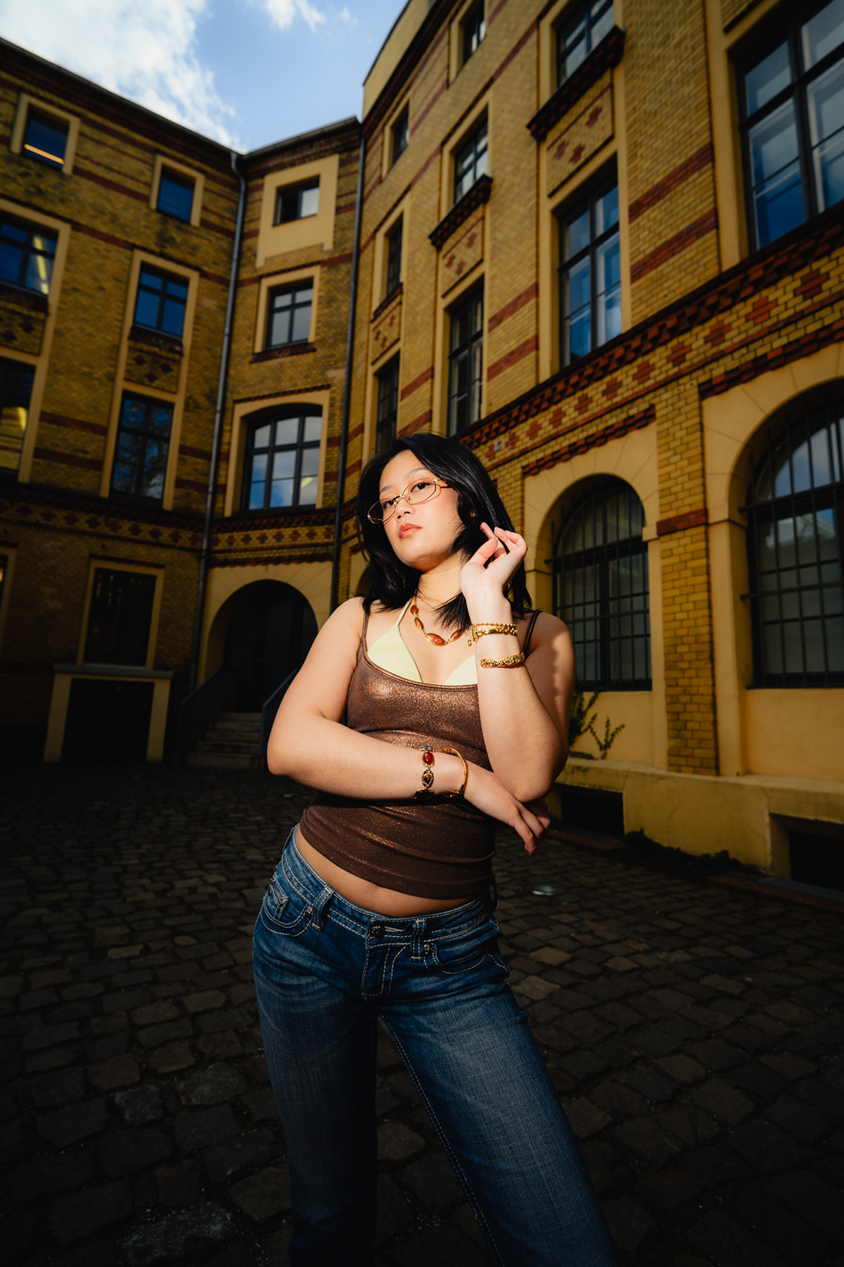 Sunlit Streets: Y2K Urban Style & Wide-Angle Portraits This vibrant daylight series showcases a Berlin photographer capturing the energetic pulse of contemporary street style. Stepping away from moody nighttime aesthetics, this editorial utilizes harsh, direct sunlight and dynamic wide-angle lenses to create a bold, high-contrast visual narrative. Set against classic local backdrops—from historic yellow-brick courtyards to graffitied street corners—the imagery perfectly encapsulates the Y2K fashion revival. Featuring metallic textures, casual denim, and playful poses that interact directly with the lens, this portfolio highlights a fresh, youth-driven approach to urban lifestyle portraiture in the heart of the German capital.