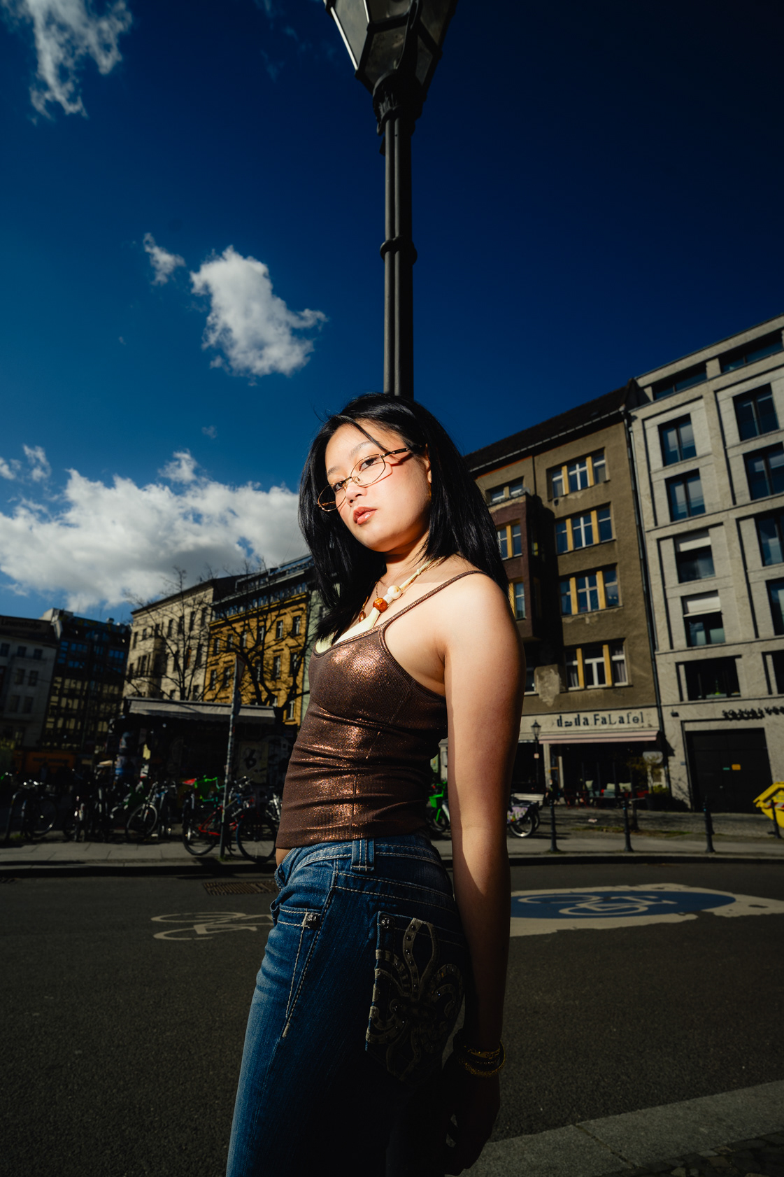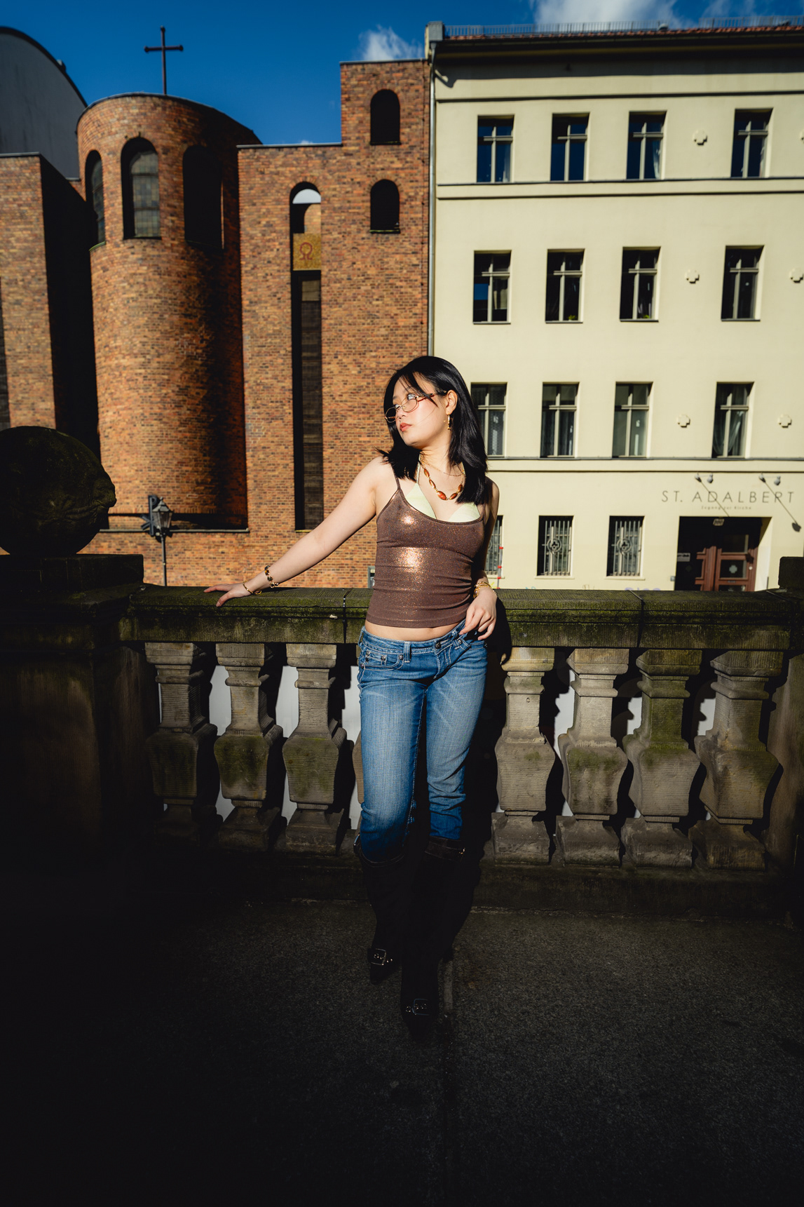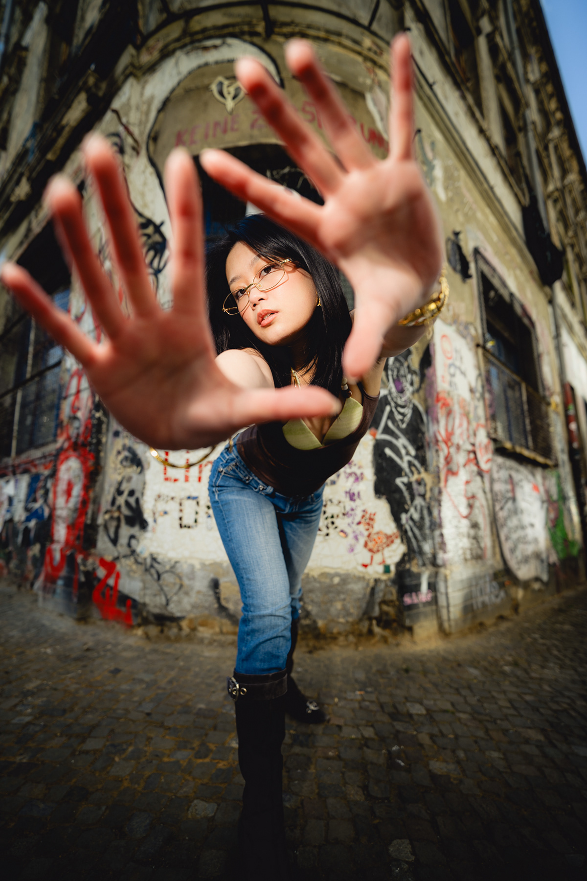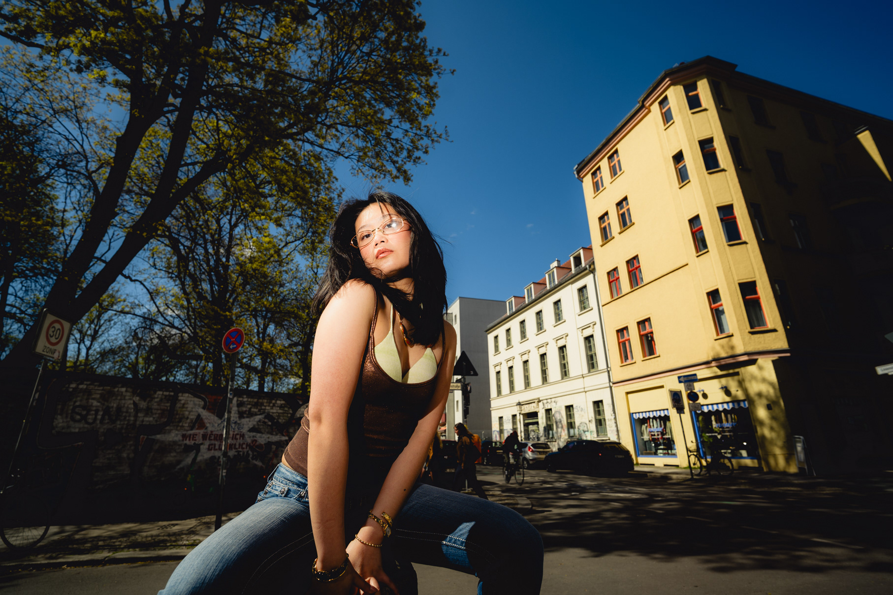 Sunlit Streets: Y2K Urban Style & Wide-Angle Portraits This vibrant daylight series showcases a Berlin photographer capturing the energetic pulse of contemporary street style. Stepping away from moody nighttime aesthetics, this editorial utilizes harsh, direct sunlight and dynamic wide-angle lenses to create a bold, high-contrast visual narrative. Set against classic local backdrops—from historic yellow-brick courtyards to graffitied street corners—the imagery perfectly encapsulates the Y2K fashion revival. Featuring metallic textures, casual denim, and playful poses that interact directly with the lens, this portfolio highlights a fresh, youth-driven approach to urban lifestyle portraiture in the heart of the German capital.
