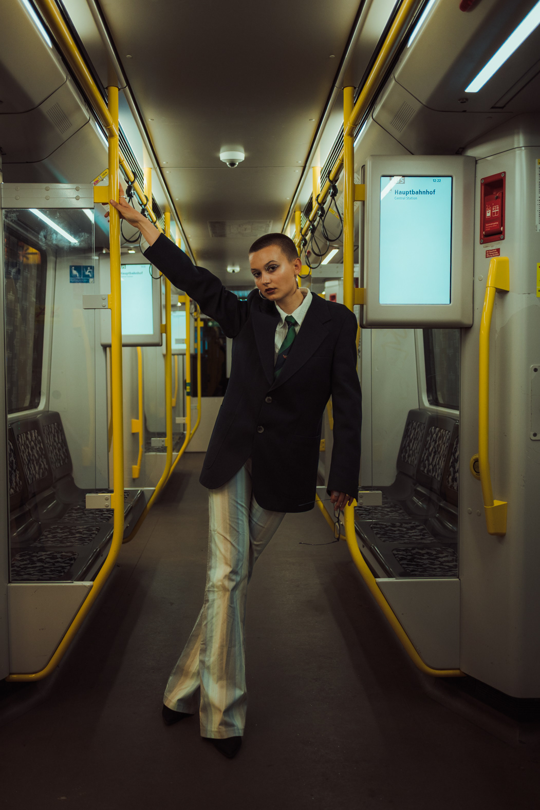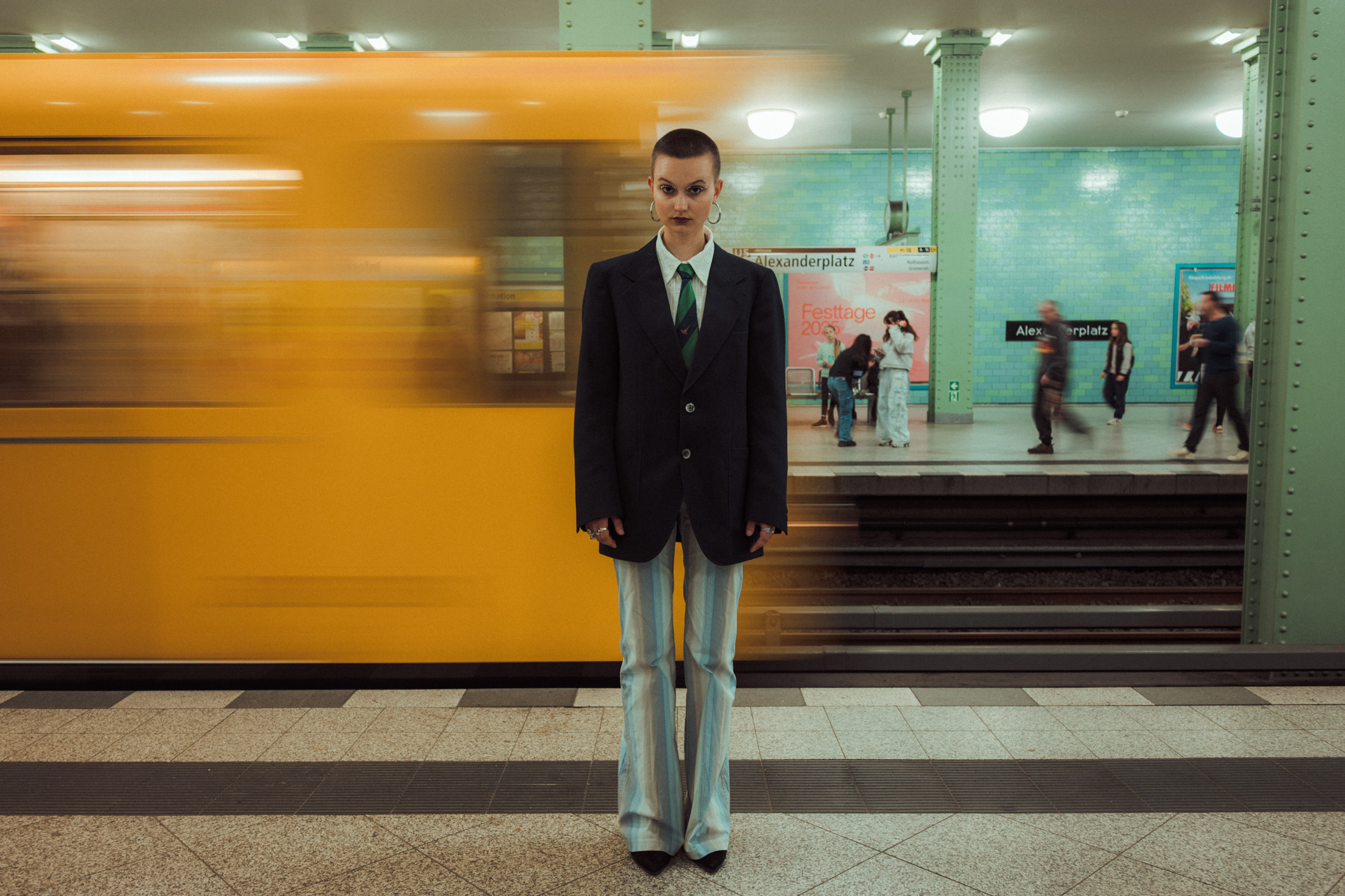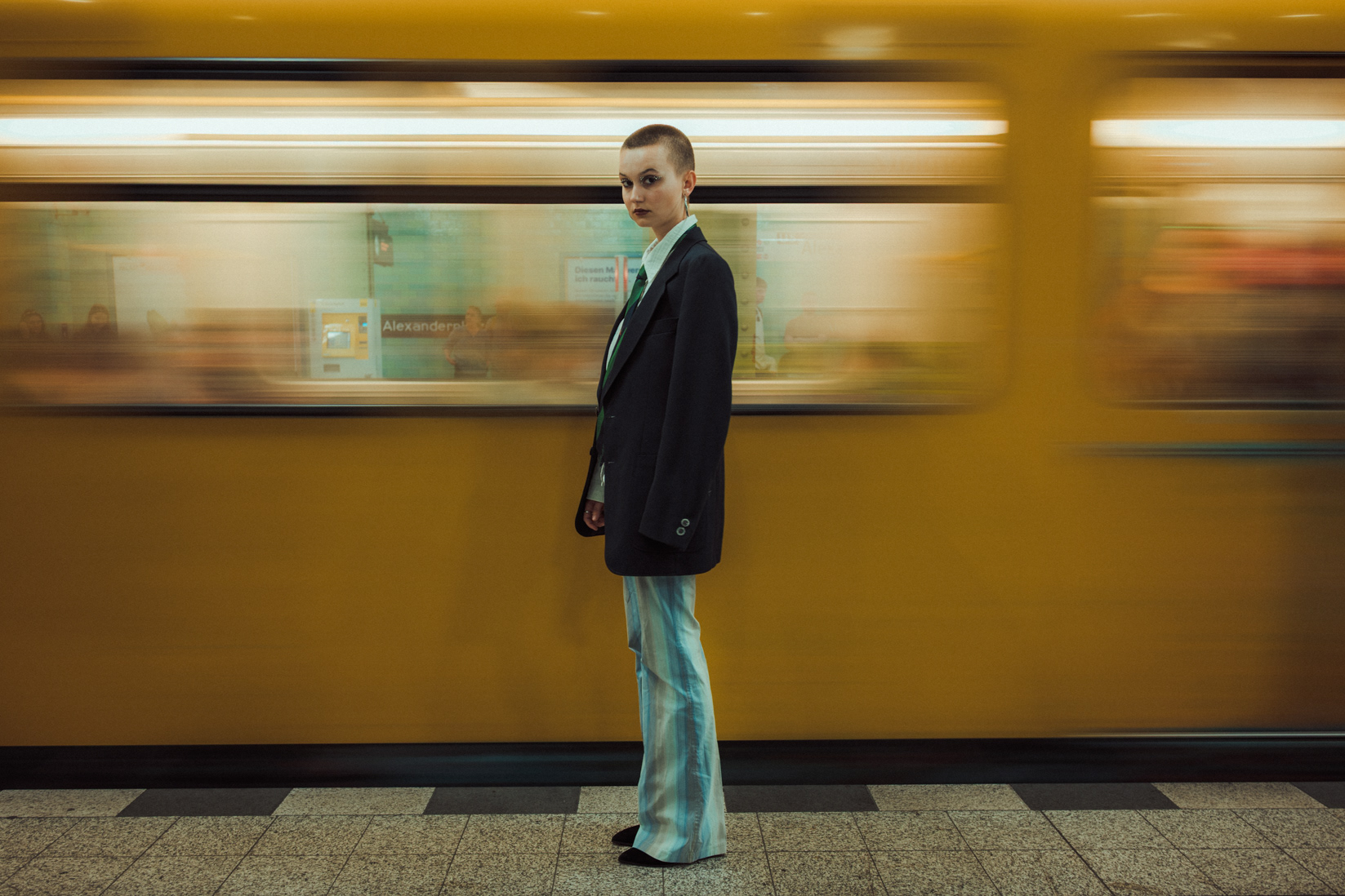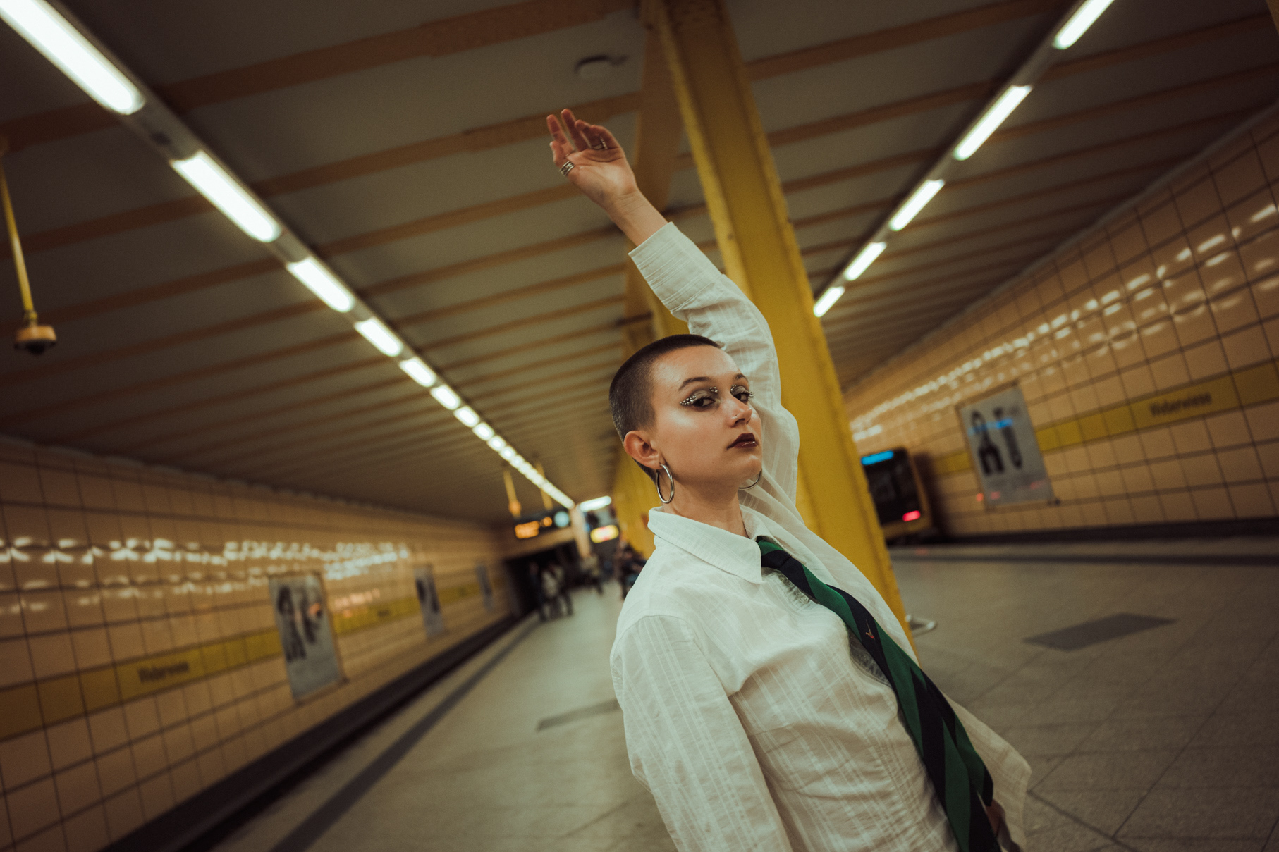 Underground Motion: Cinematic U-Bahn Portraits in Berlin Descending into the heart of the city, this series captures the frenetic energy of the Berlin U-Bahn. Set against the vintage tiles and iconic yellow trains of the underground, these environmental portraits juxtapose stillness with motion. utilizing slow shutter speeds (shutter drag) to blur the passing trains, I aimed to create a visual metaphor for the fast-paced urban life of Berlin, while the subject remains a sharp, stoic focal point. The styling—featuring sharp tailoring, a buzz cut, and avant-garde makeup—adds a high-fashion editorial feel to the gritty public setting. This collection is a study in wide-angle composition and available light photography within one of Berlin’s most recognizable transit systems.