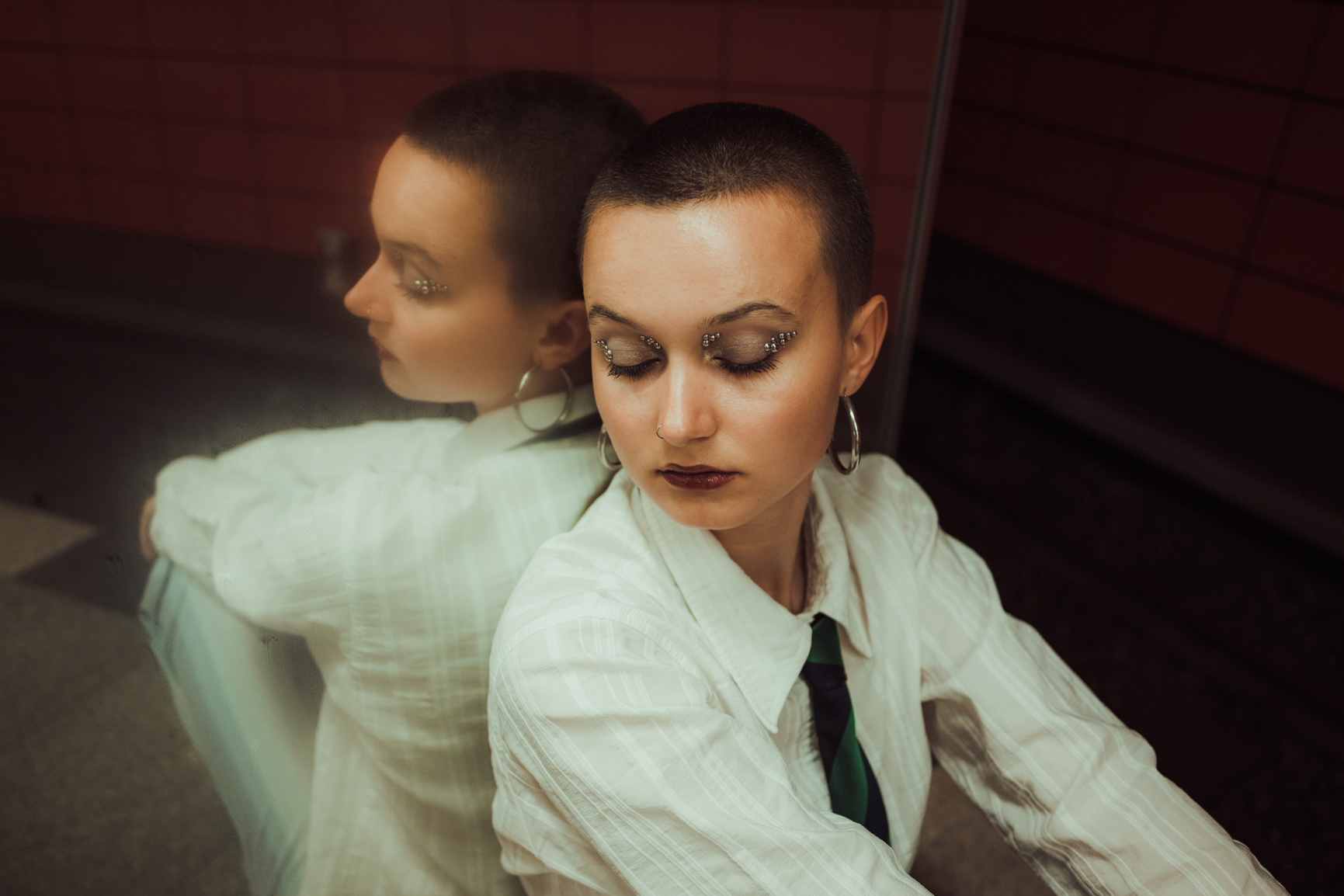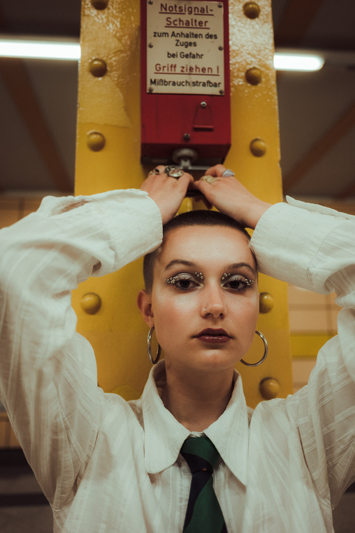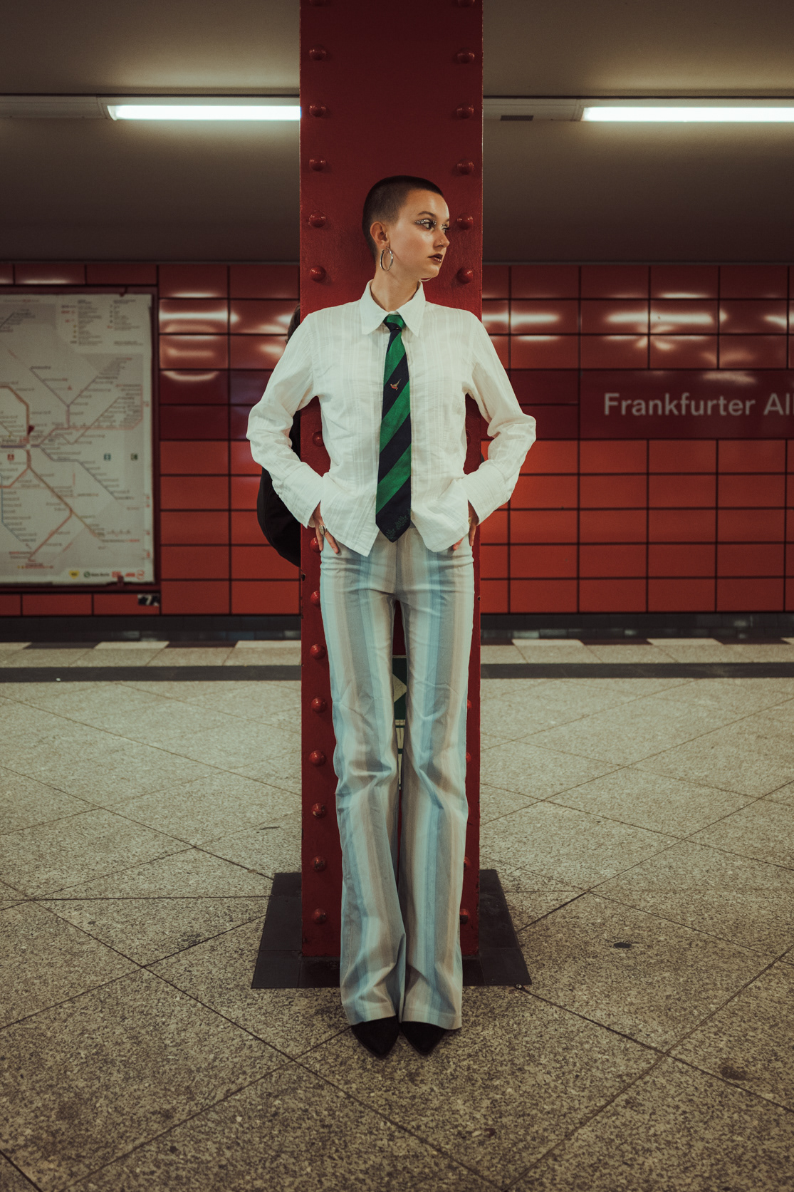 Underground Motion: Cinematic U-Bahn Portraits in Berlin Descending into the heart of the city, this series captures the frenetic energy of the Berlin U-Bahn. Set against the vintage tiles and iconic yellow trains of the underground, these environmental portraits juxtapose stillness with motion. utilizing slow shutter speeds (shutter drag) to blur the passing trains, I aimed to create a visual metaphor for the fast-paced urban life of Berlin, while the subject remains a sharp, stoic focal point. The styling—featuring sharp tailoring, a buzz cut, and avant-garde makeup—adds a high-fashion editorial feel to the gritty public setting. This collection is a study in wide-angle composition and available light photography within one of Berlin’s most recognizable transit systems.