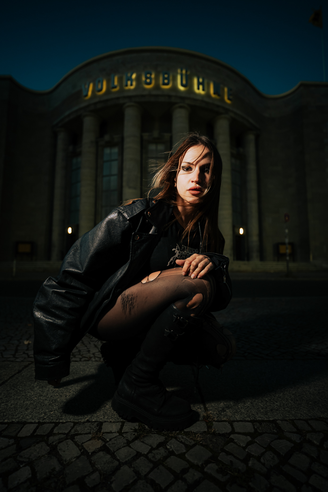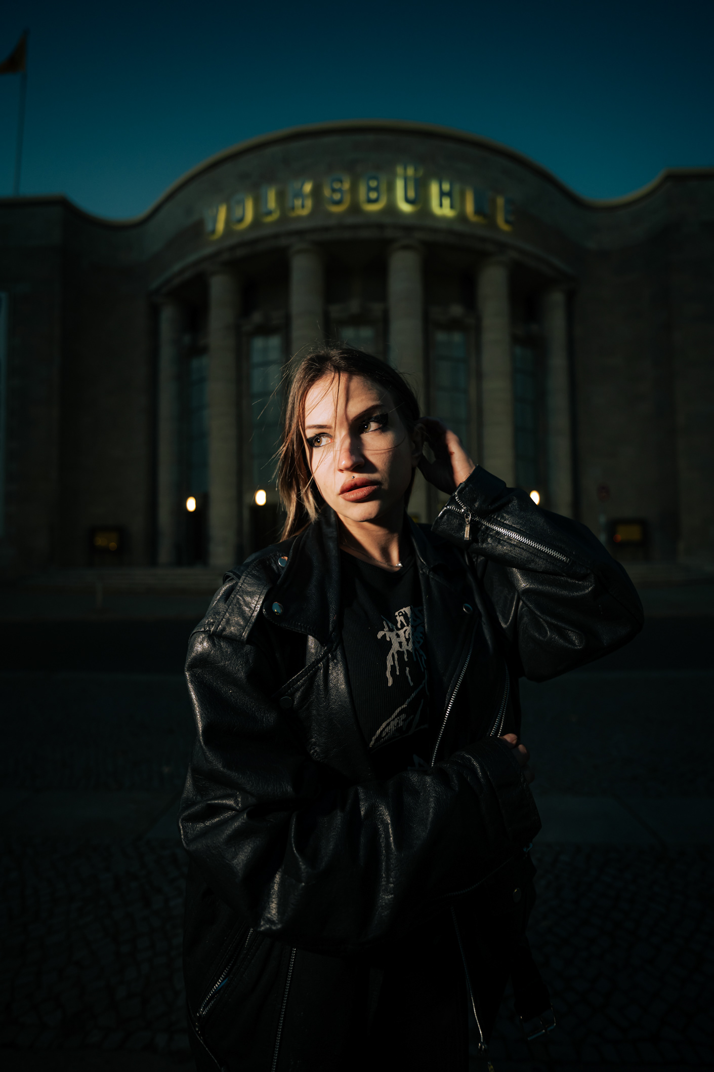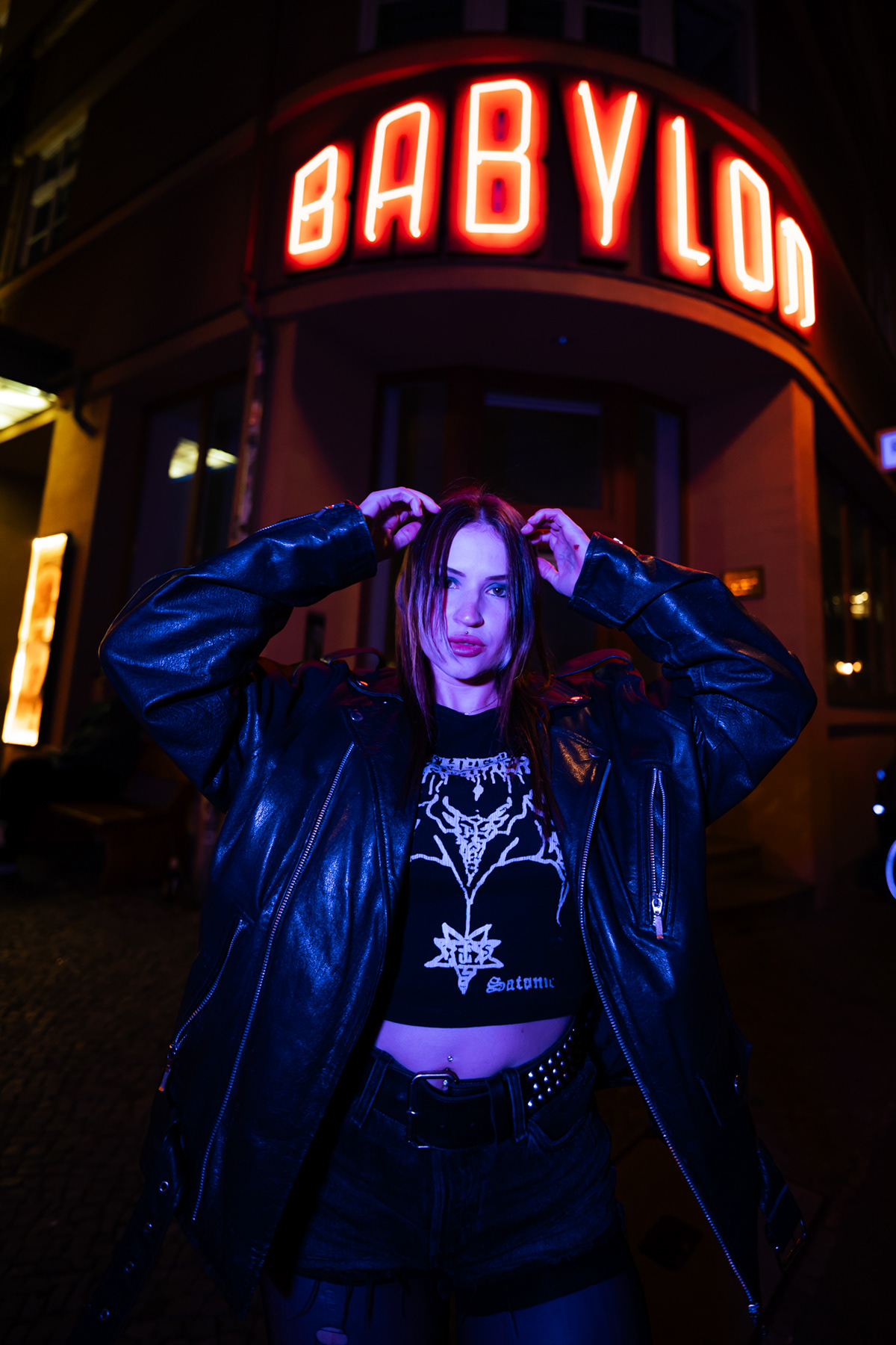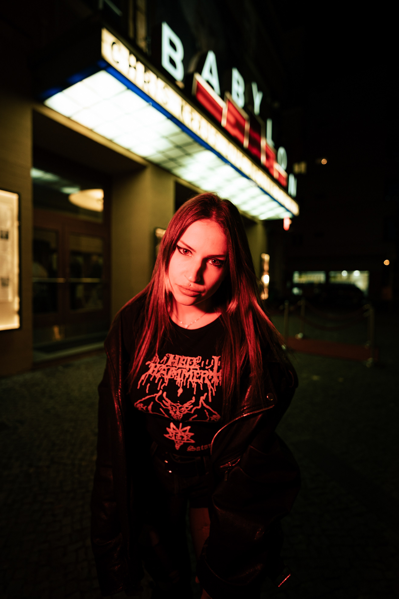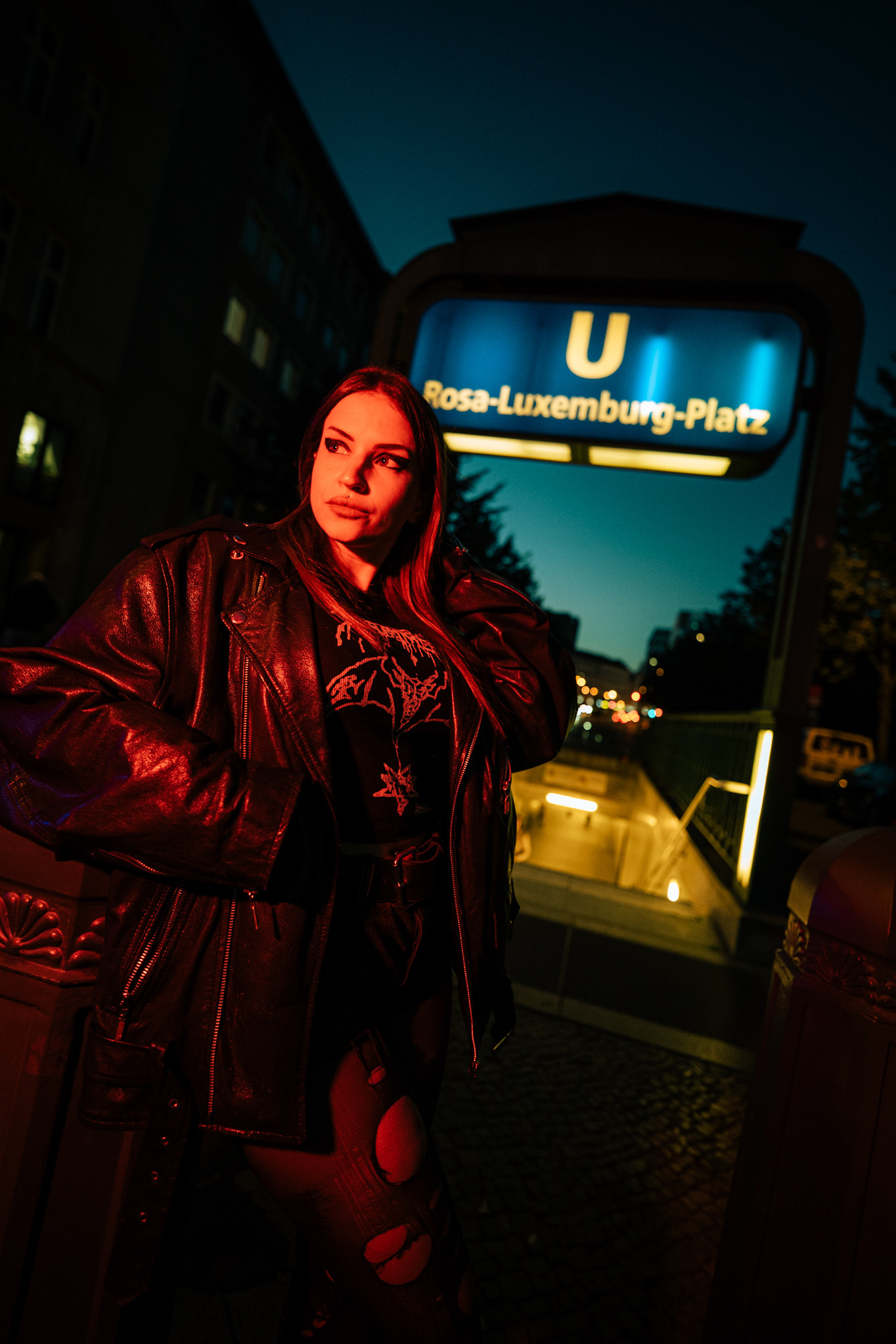Red Neon & Historic Stone: Night Portraits at Rosa-Luxemburg-Platz This series captures the cinematic mood of Berlin-Mitte after dark. Shot on location at the iconic Rosa-Luxemburg-Platz, the images explore the contrast between historic architecture and vibrant nightlife lighting. The session utilizes the glowing red neon of the legendary Babylon Cinema to bathe the subject in dramatic, colorful light. This is balanced by wider, atmospheric shots in front of the Volksbühne theater and the blue-lit entrance of the U-Bahn station. Featuring an edgy, leather-clad street style, this portfolio demonstrates a mastery of available light photography in complex urban environments.