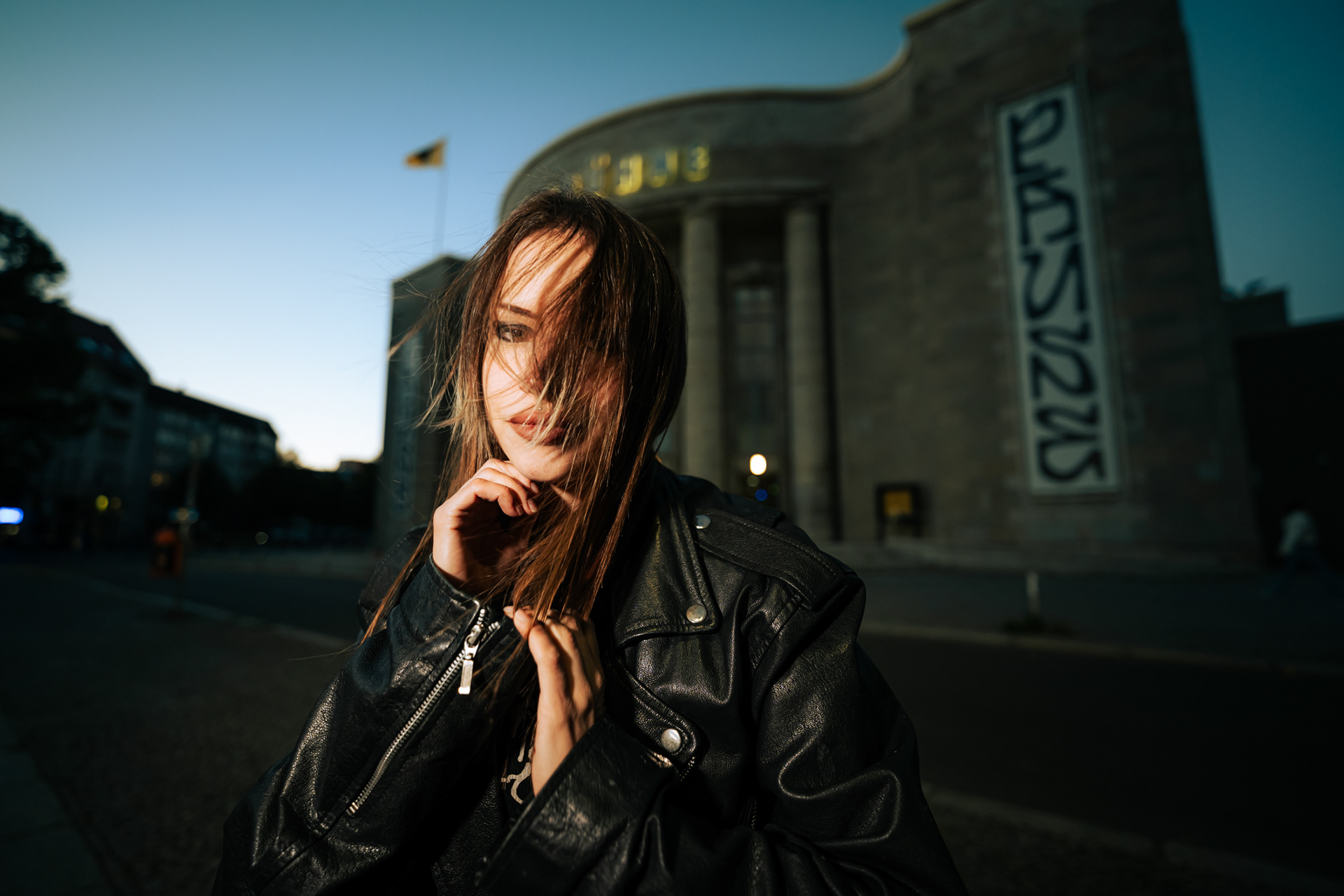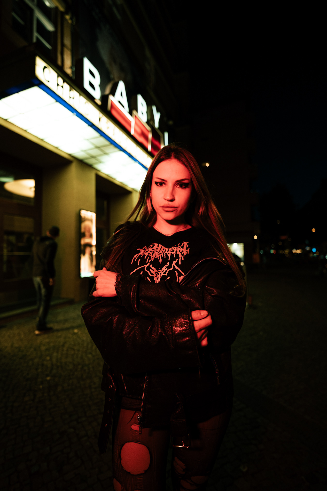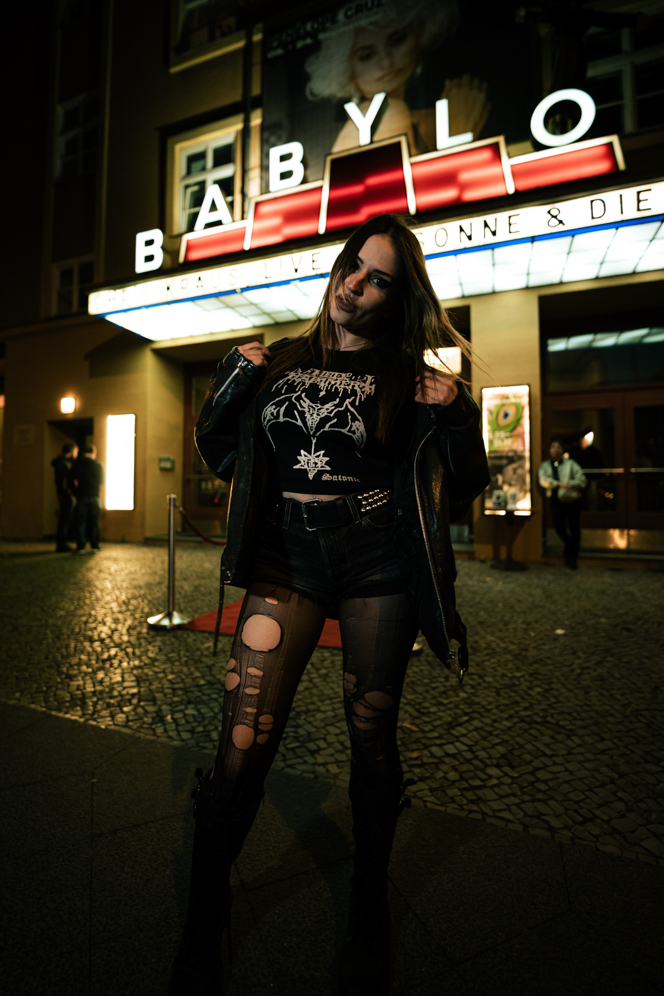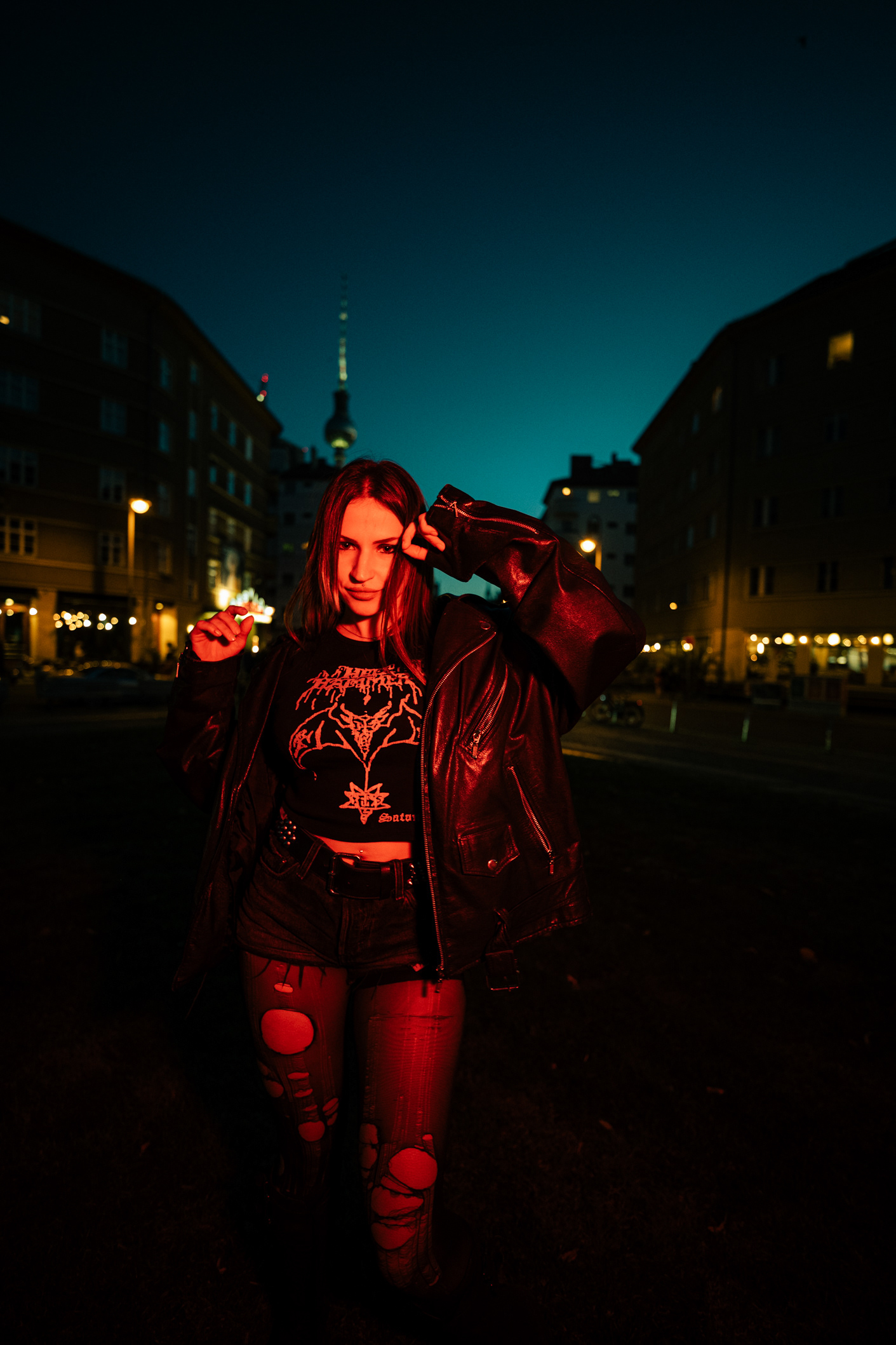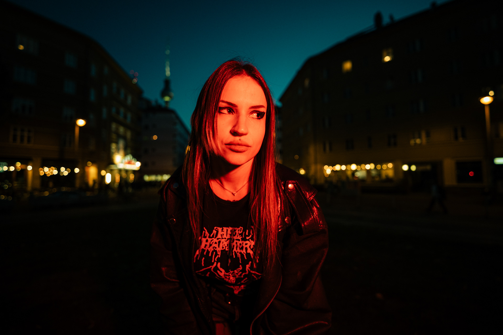 Red Neon & Historic Stone: Night Portraits at Rosa-Luxemburg-Platz This series captures the cinematic mood of Berlin-Mitte after dark. Shot on location at the iconic Rosa-Luxemburg-Platz, the images explore the contrast between historic architecture and vibrant nightlife lighting. The session utilizes the glowing red neon of the legendary Babylon Cinema to bathe the subject in dramatic, colorful light. This is balanced by wider, atmospheric shots in front of the Volksbühne theater and the blue-lit entrance of the U-Bahn station. Featuring an edgy, leather-clad street style, this portfolio demonstrates a mastery of available light photography in complex urban environments.