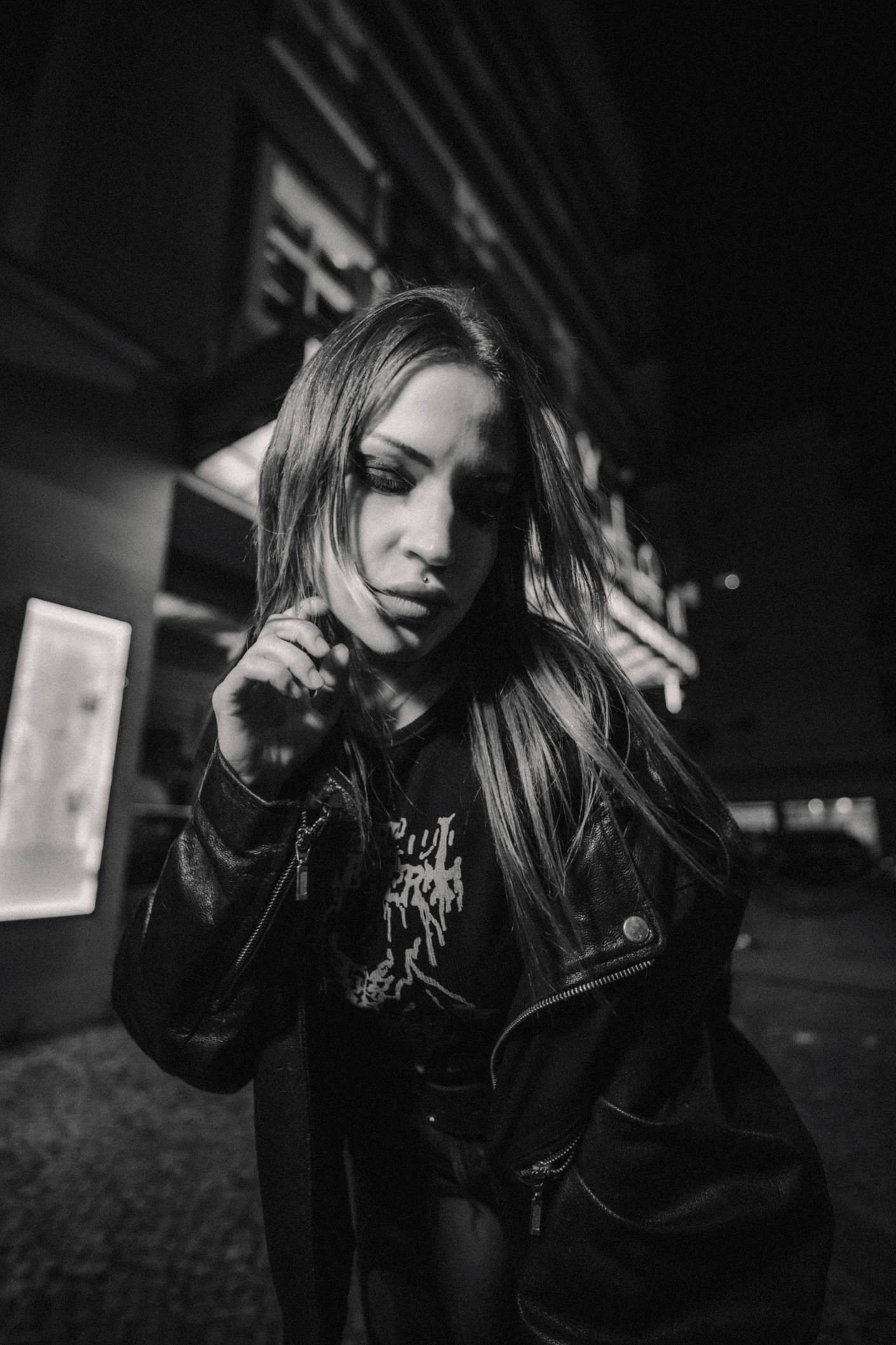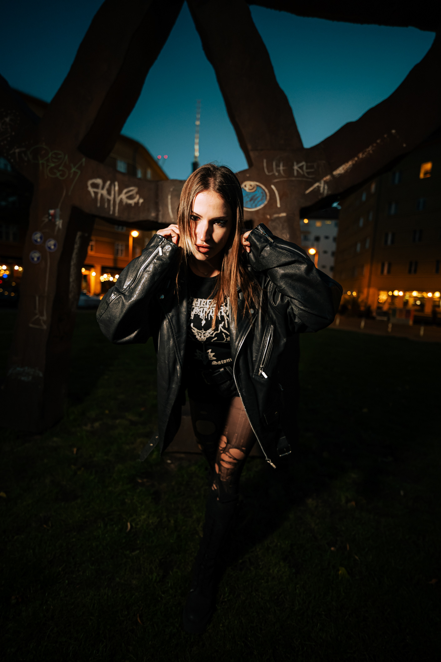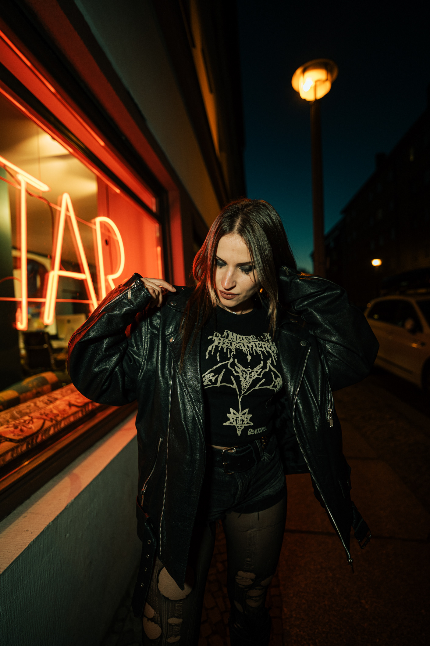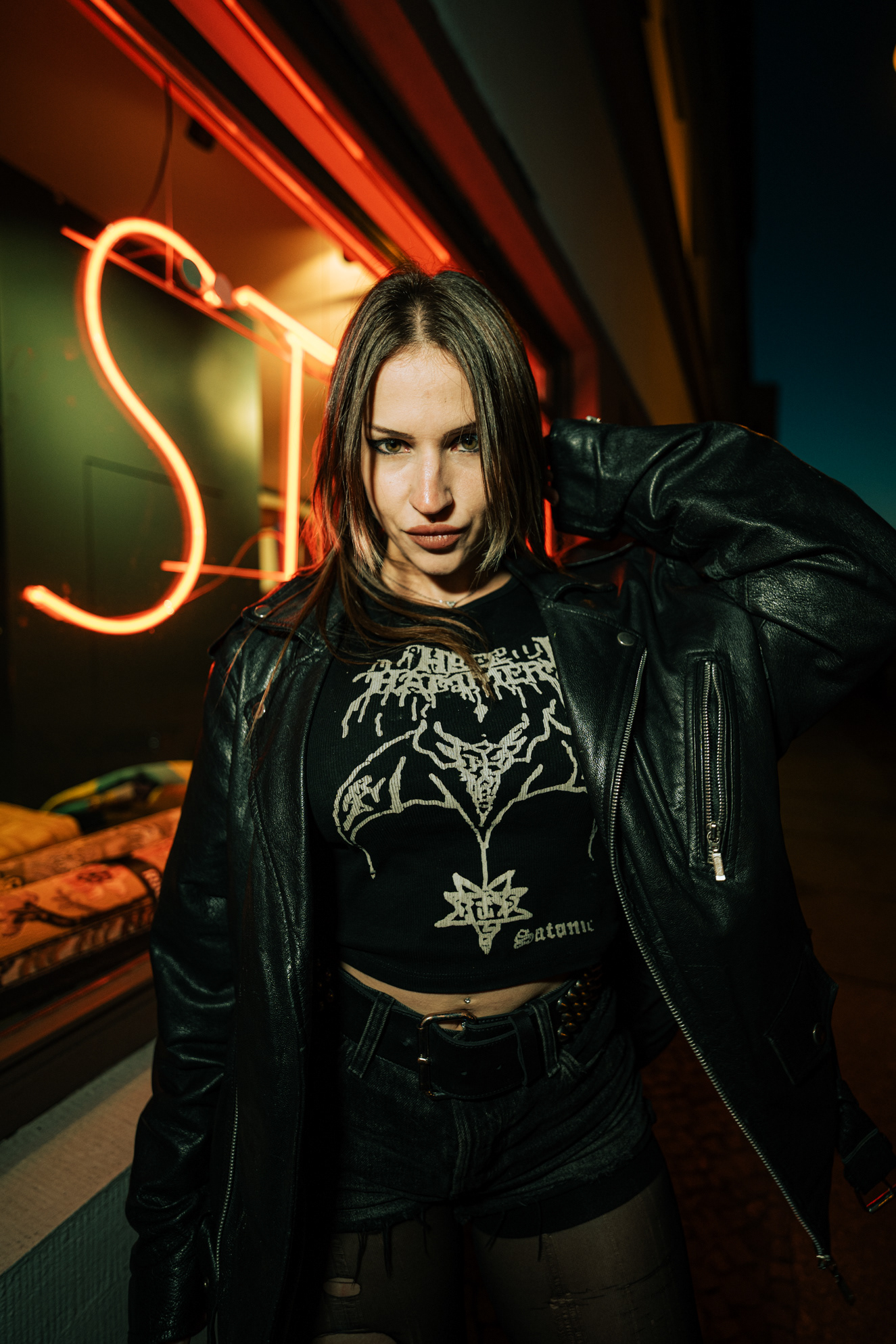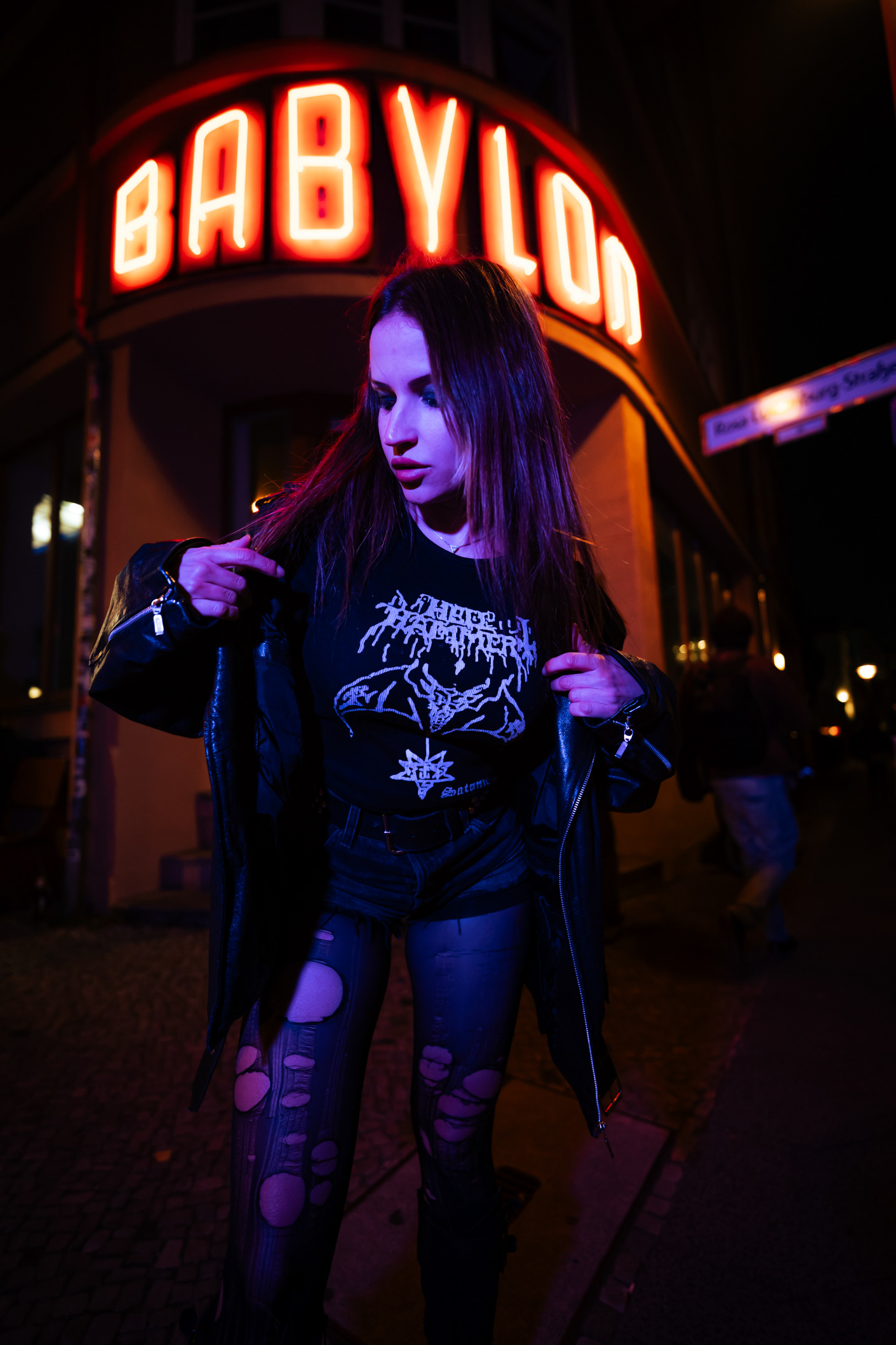 Red Neon & Historic Stone: Night Portraits at Rosa-Luxemburg-Platz This series captures the cinematic mood of Berlin-Mitte after dark. Shot on location at the iconic Rosa-Luxemburg-Platz, the images explore the contrast between historic architecture and vibrant nightlife lighting. The session utilizes the glowing red neon of the legendary Babylon Cinema to bathe the subject in dramatic, colorful light. This is balanced by wider, atmospheric shots in front of the Volksbühne theater and the blue-lit entrance of the U-Bahn station. Featuring an edgy, leather-clad street style, this portfolio demonstrates a mastery of available light photography in complex urban environments.