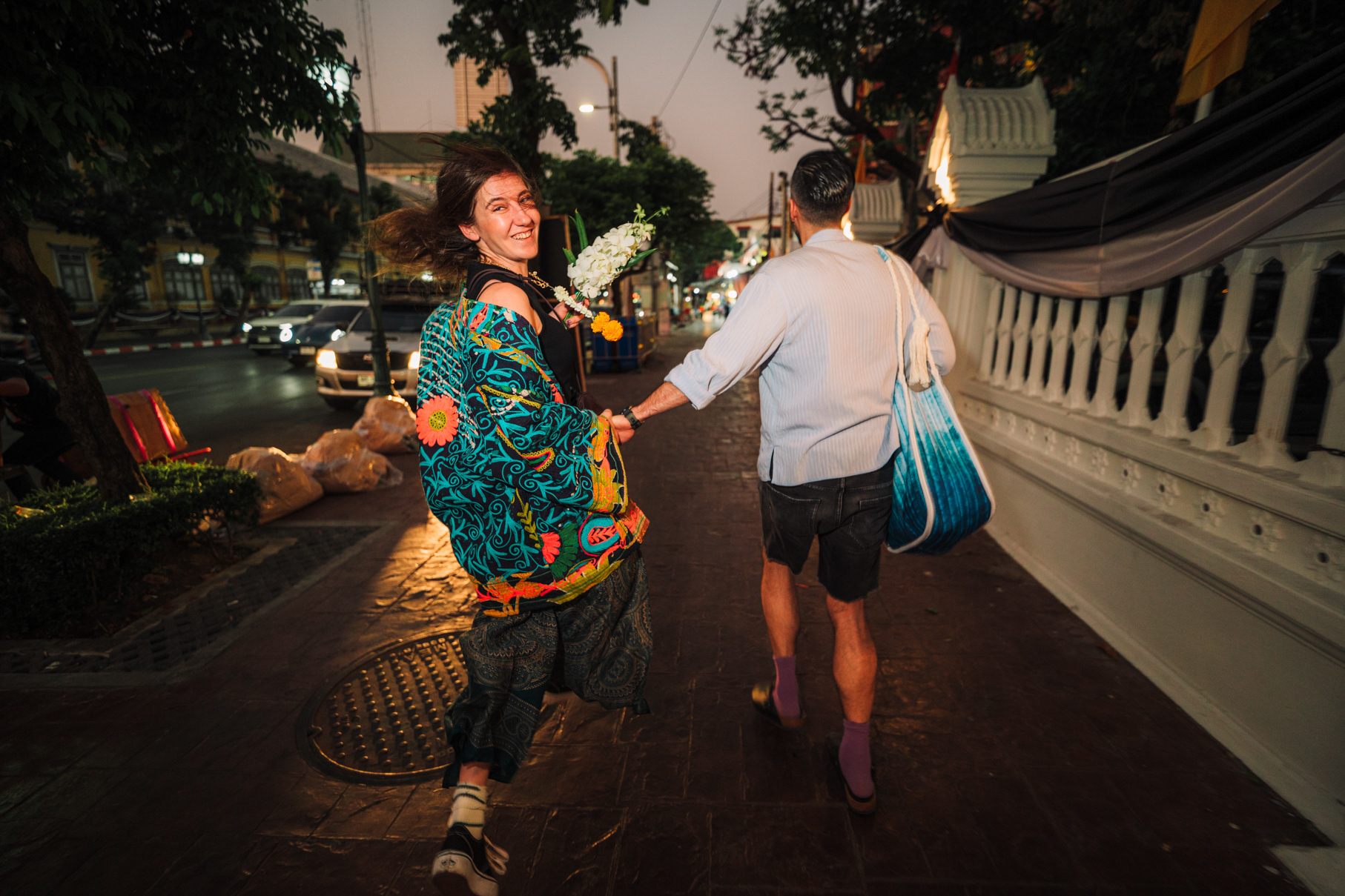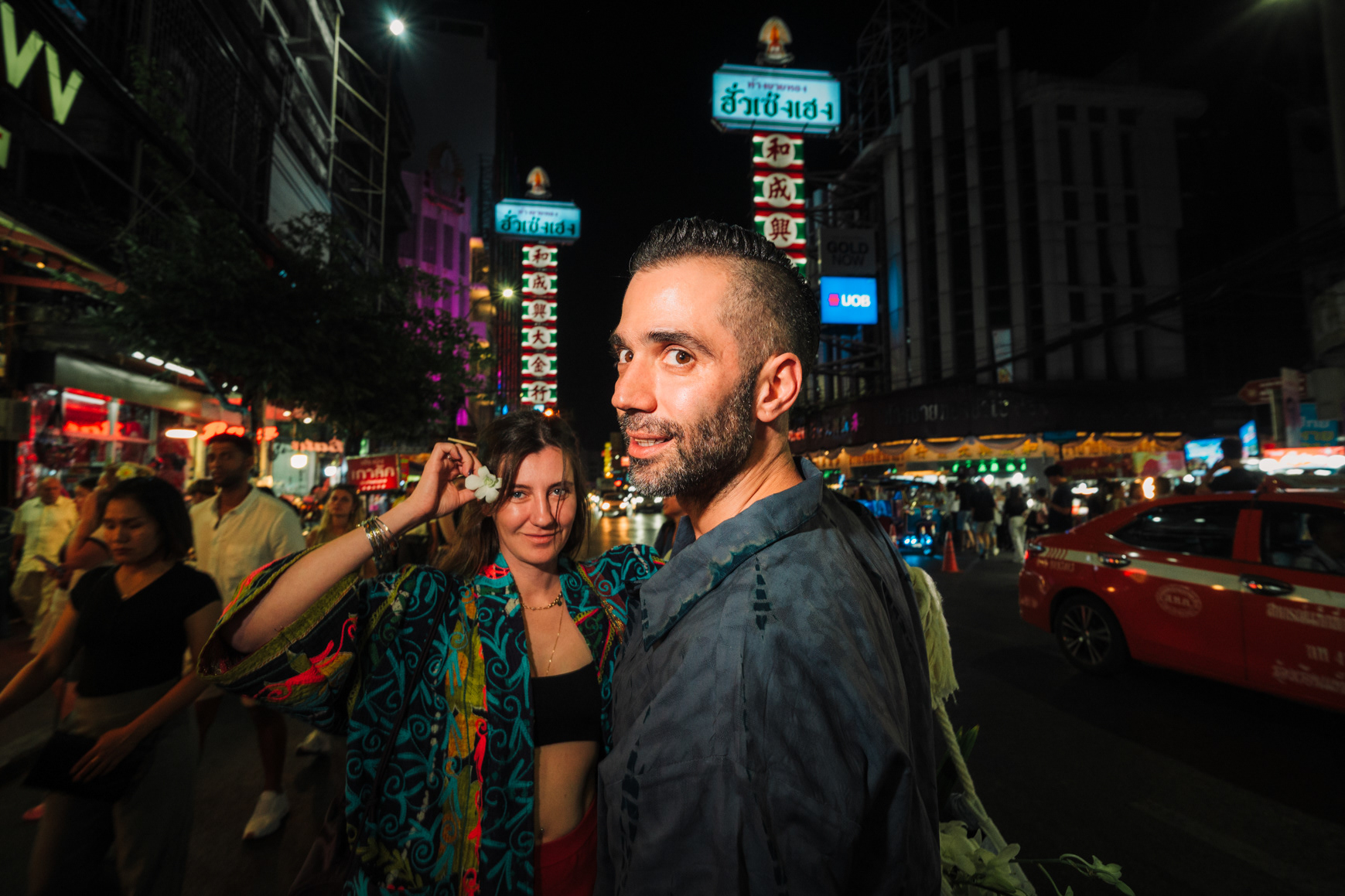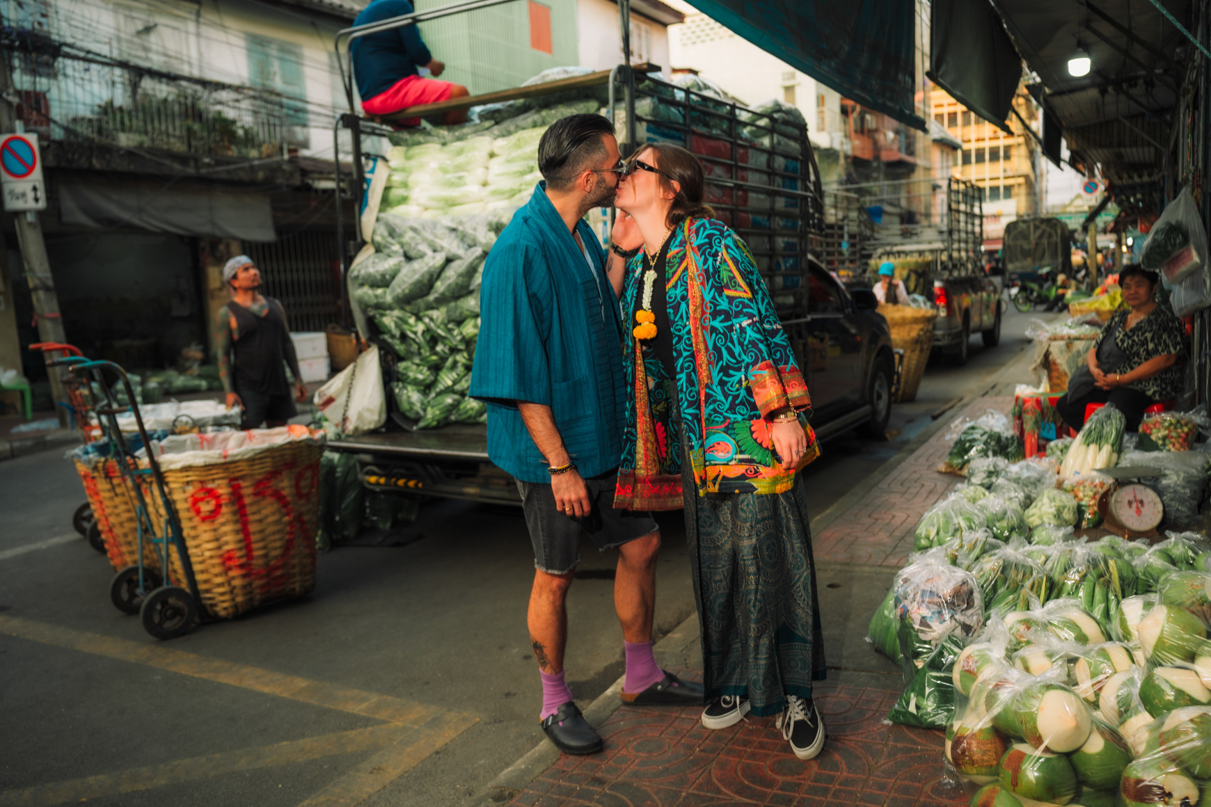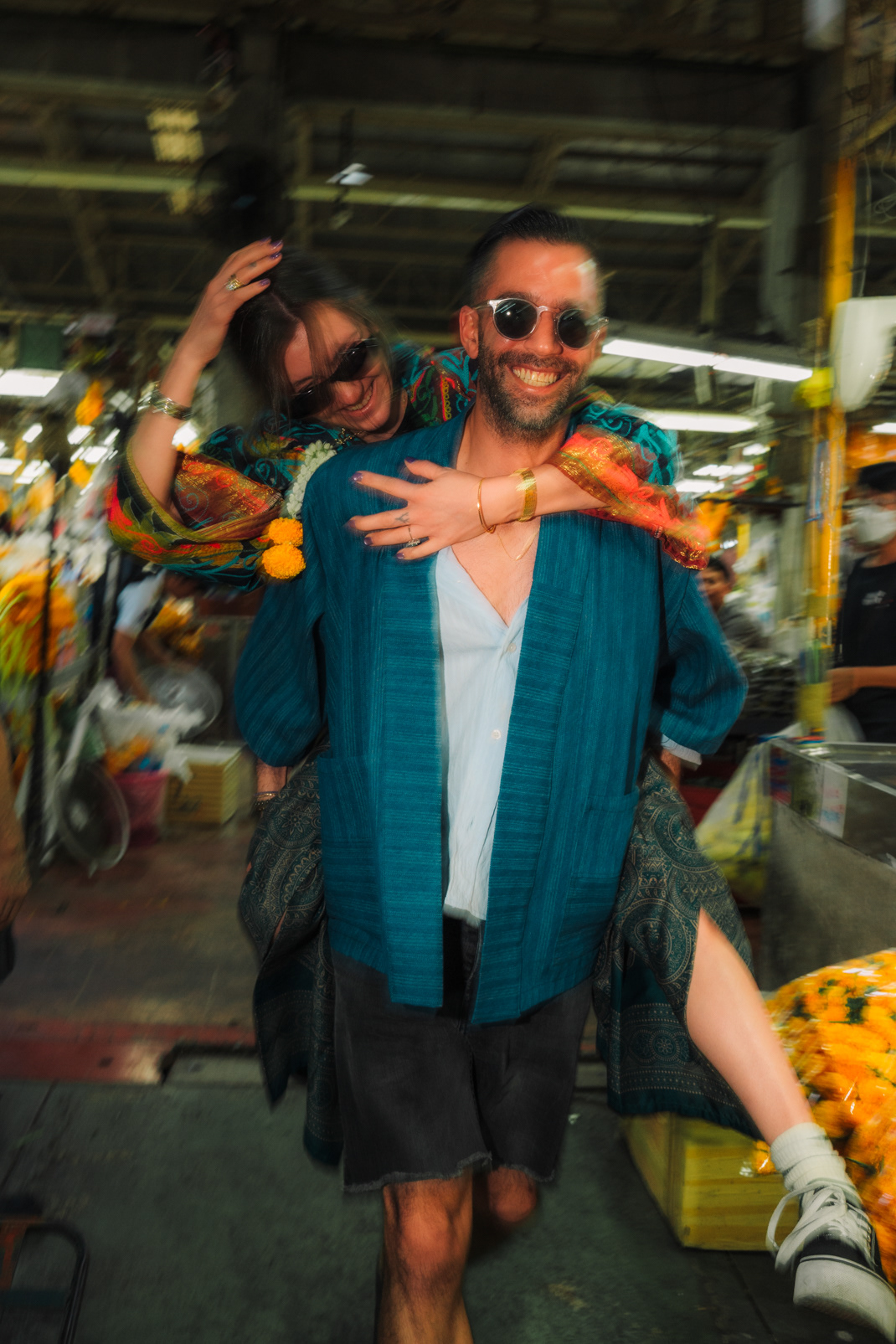 Love in the City: Candid Couple & Honeymoon Photography This series showcases the work of a Bangkok photographer capturing the unscripted joy of travel. Moving away from stiff, traditional poses, the session follows a couple through the vibrant chaos of the city, documenting their genuine connection. Highlights include a high-energy Tuk-Tuk ride at night and colorful moments amidst the marigolds at Pak Khlong Talat (Flower Market). Whether exploring the neon-lit streets of Chinatown or sharing a quiet laugh by the river, this portfolio demonstrates a fun, documentary approach to vacation and honeymoon photography, perfect for couples who want to remember the feeling of their trip, not just the sights.